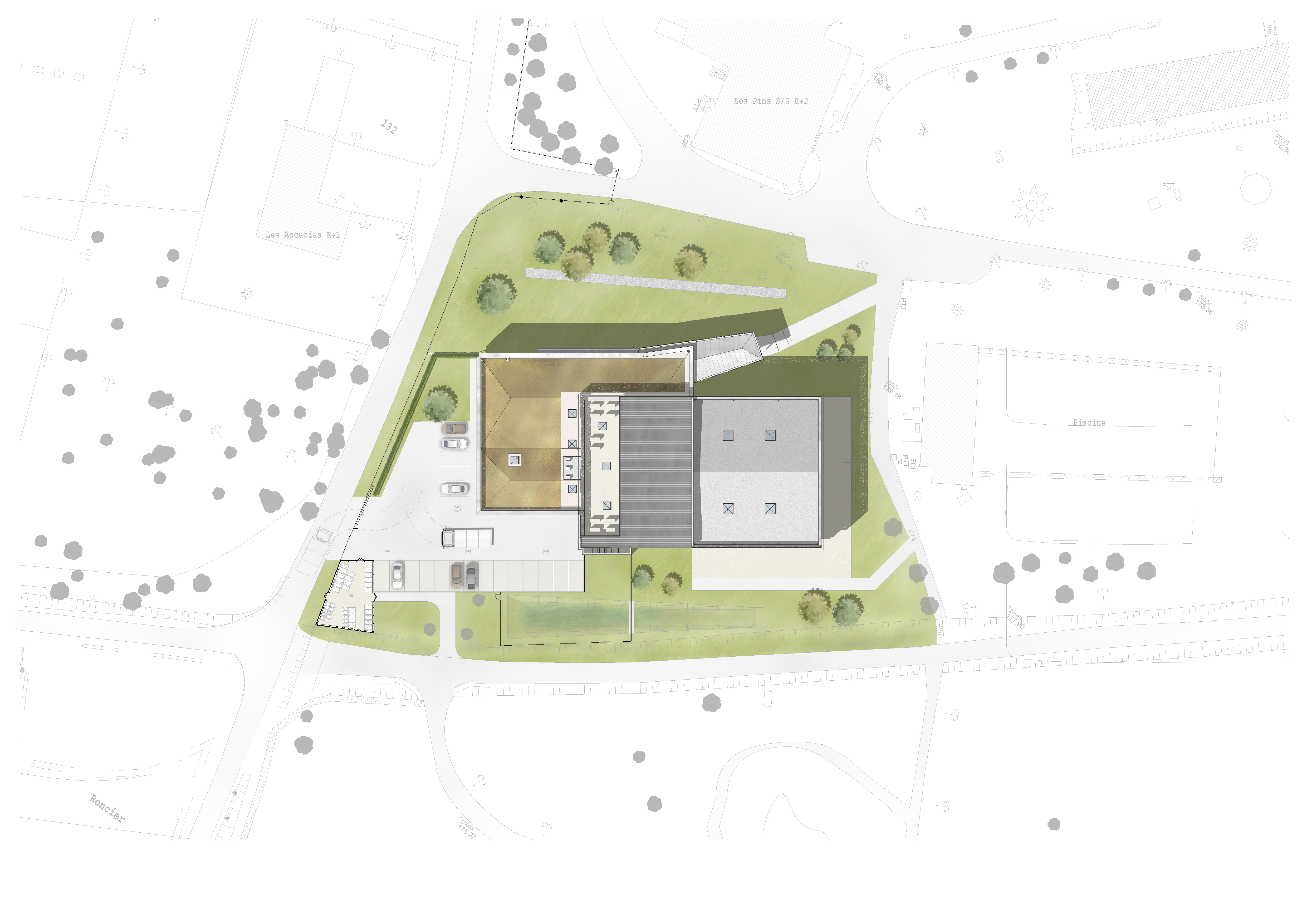 Approche environnementale : Dans un contexte naturel très présent, le projet est particulièrement attentif à la problématique de rétention des eaux pluviales : il limite au maximum les surfaces étanchées, intègre une toiture végétalisée et prévoit des dispositifs de rétention et d’infiltration (bassins et noues). Le projet privilégie par ailleurs la prise en compte de matériaux biosourcés. Il intègre un volume de bois important avec la charpente de la salle de restaurant et le parement de façade en clins autoclavés. Le bâtiment est chauffé avec une chaufferie biomasse qui alimente l’ensemble du site de l’Ecole des Roches. Le projet cible enfin le confort des occupants avec un confort acoustique renforcé, une protection solaire efficace, un fort niveau d’éclairage naturel pour les locaux du public mais aussi pour les locaux du personnel.