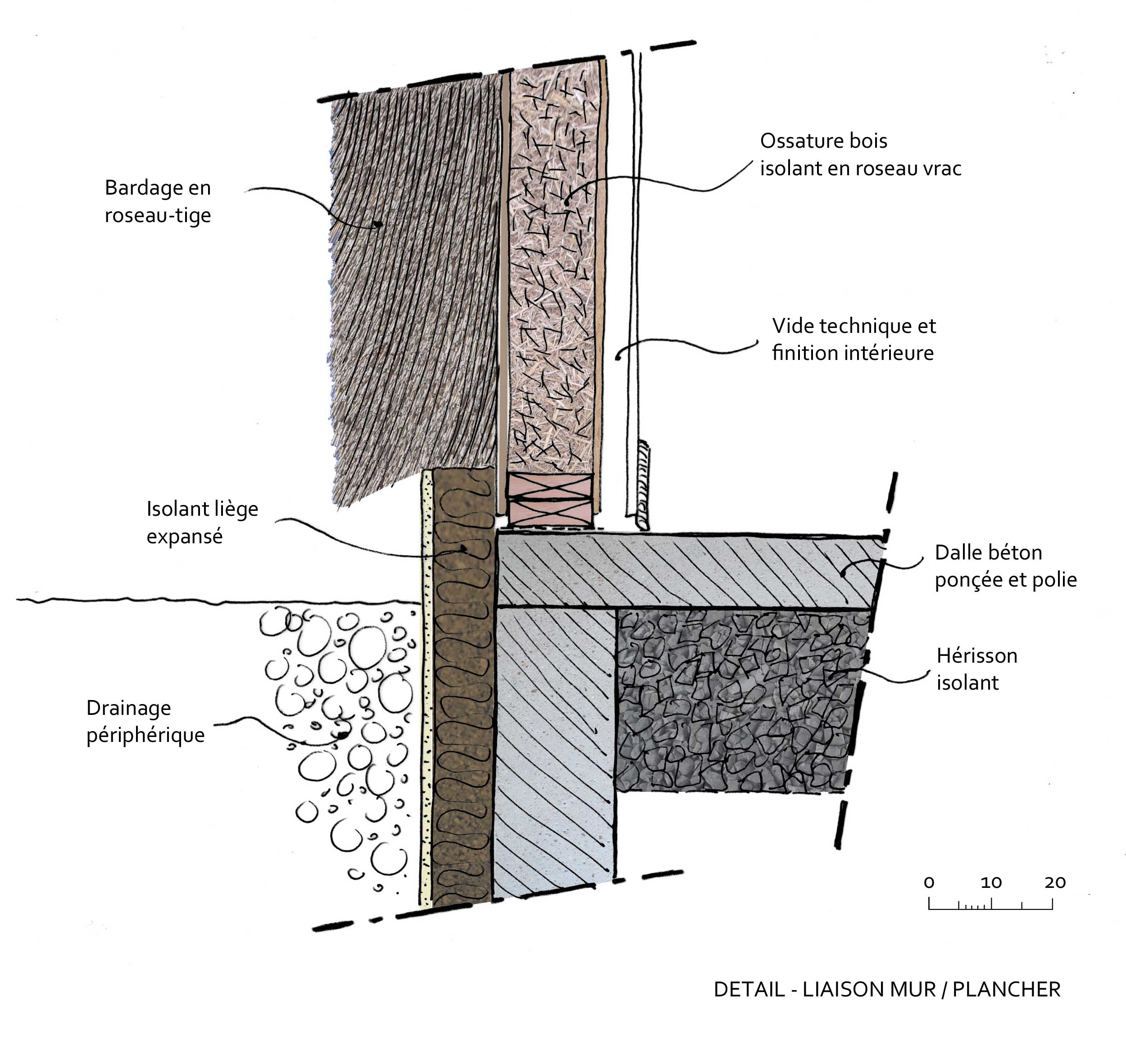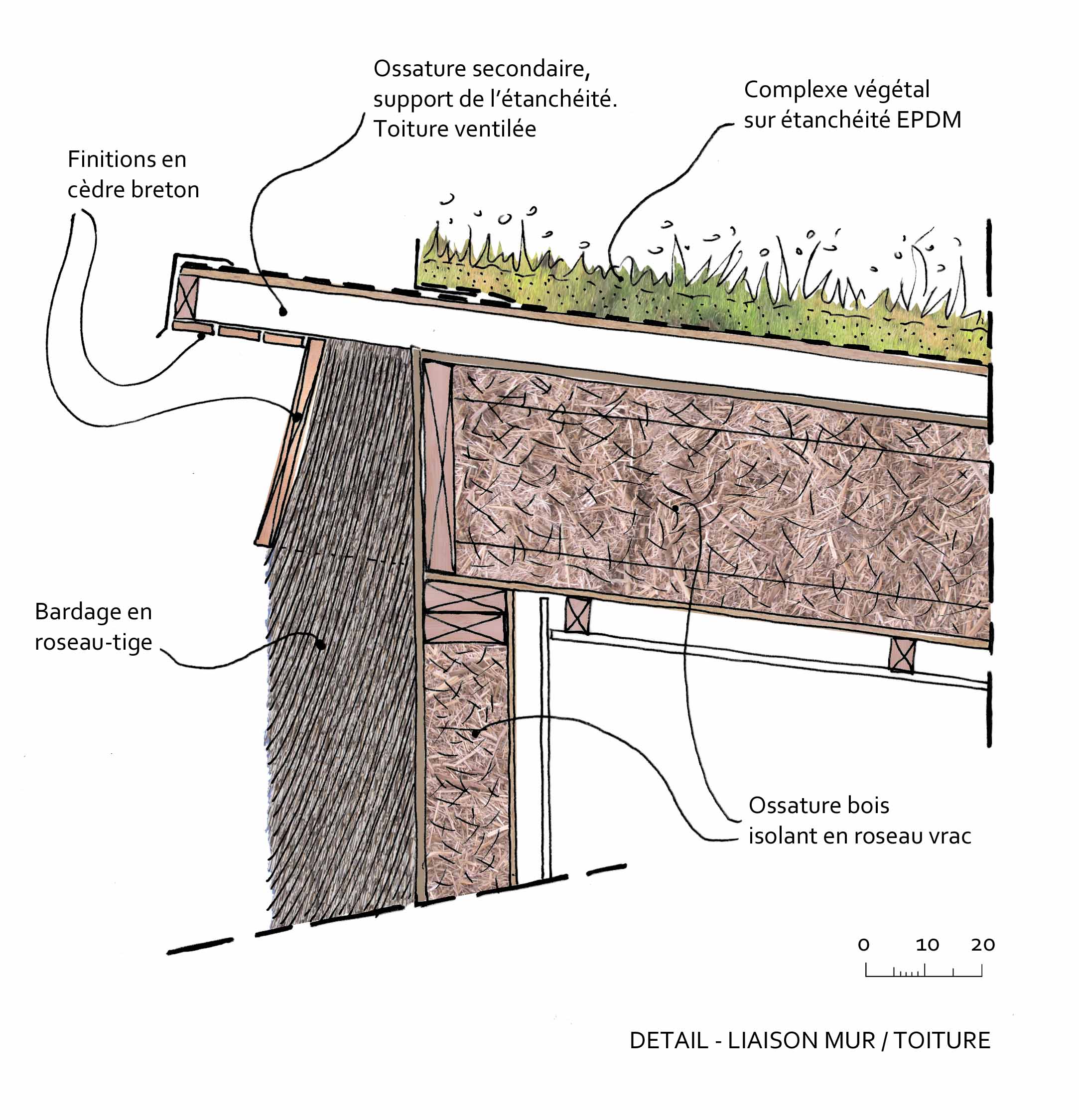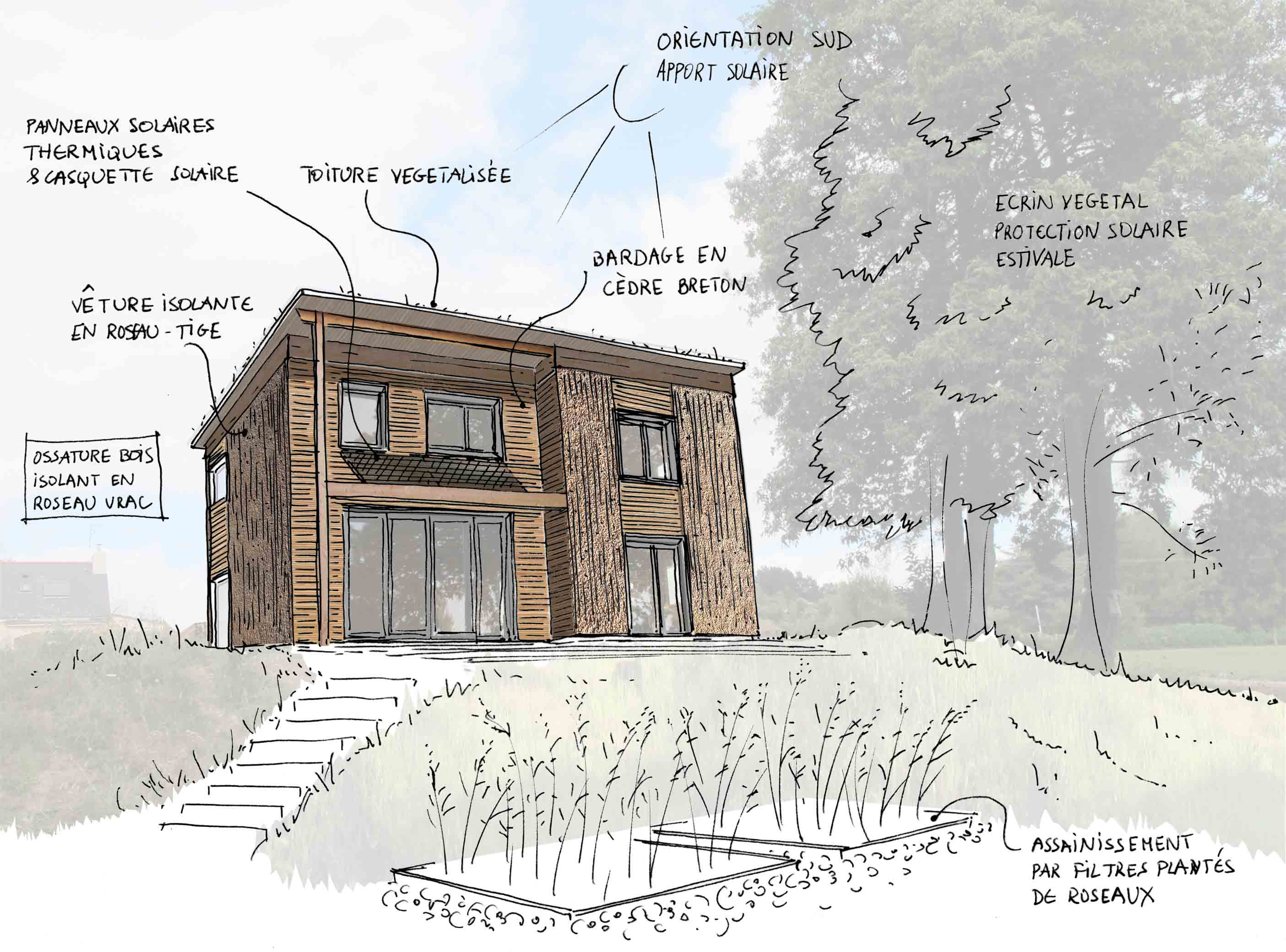 Descriptif technique : Les choix techniques ont été faits dans un souci de performance énergétique élevée et suivant les principes de conception bioclimatique. Murs et toiture en ossature bois préfabriqués en atelier. Isolation répartie roseau vrac et vêture isolante en roseaux tiges. Toiture végétalisée. Socle à forte inertie: hérisson isolant, dalle béton structurelle poncée et polie, mur de refend en adobes de terre/roseau. Apports solaires passifs, forte étanchéité à l'air, chauffage par poêle à bois, ventilation double flux, panneaux solaires pour l'eau chaude. Assainissement par filtre planté de roseaux. PEFC (Gestion forestière durable) FSC (Gestion forestière responsable)