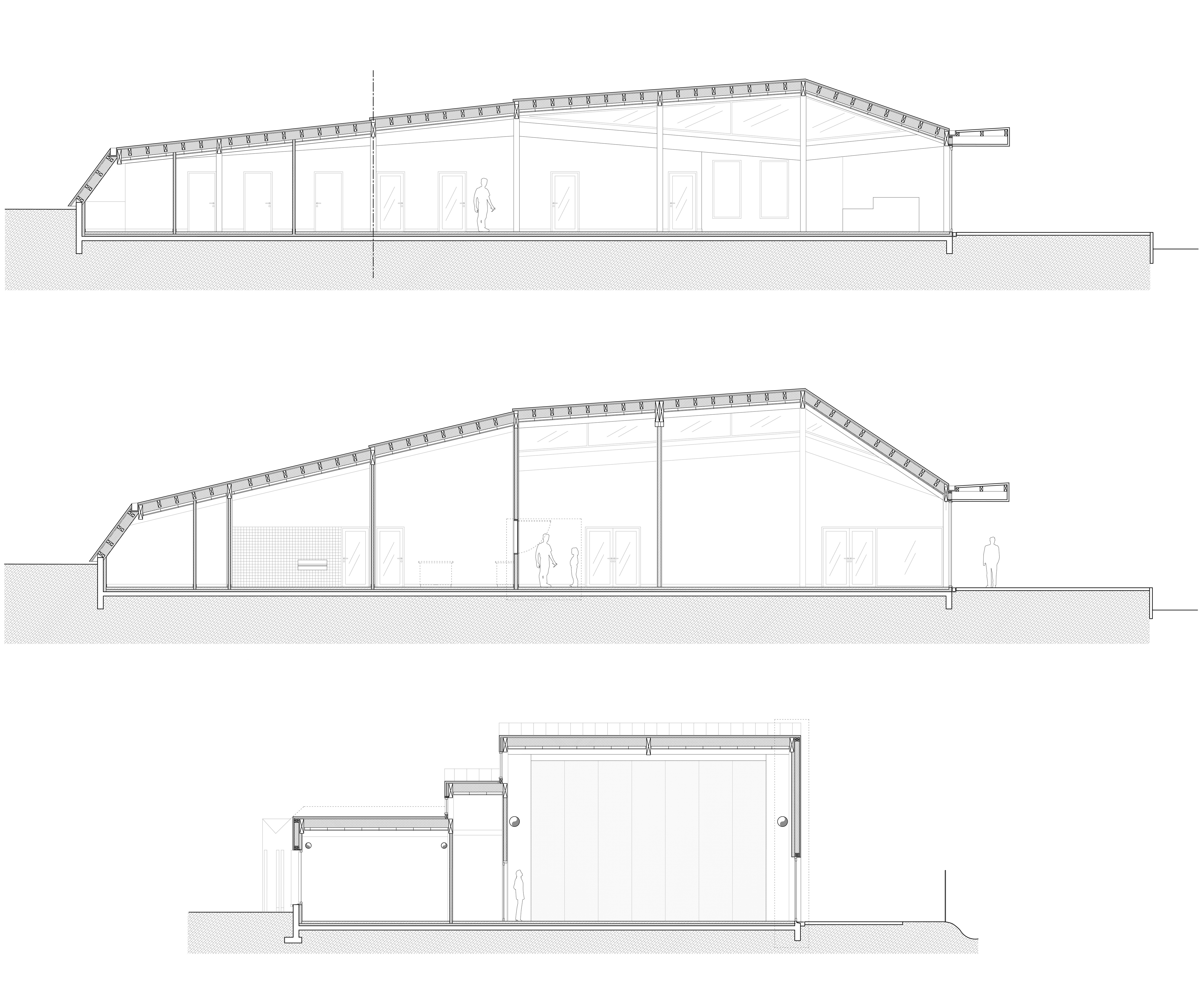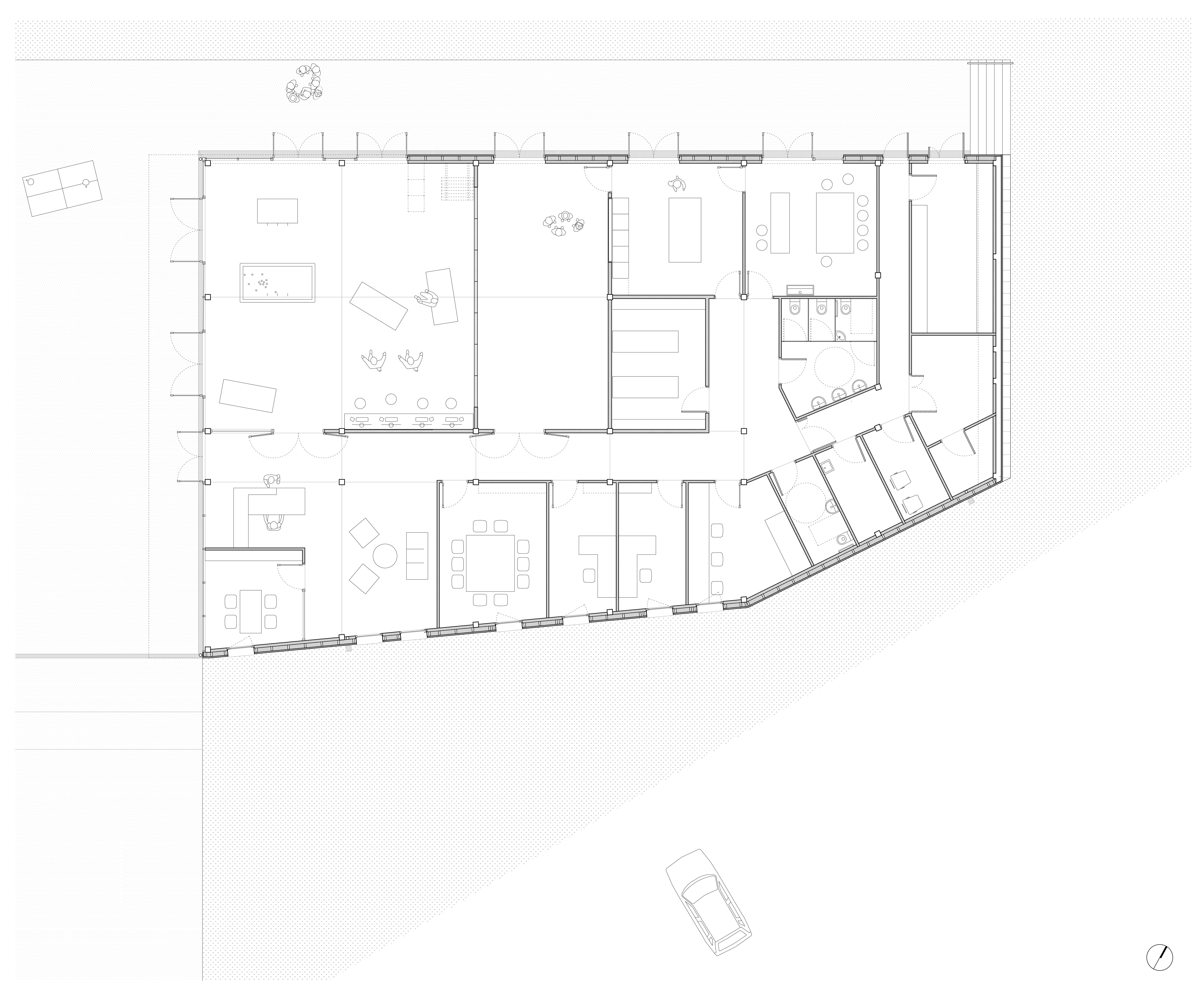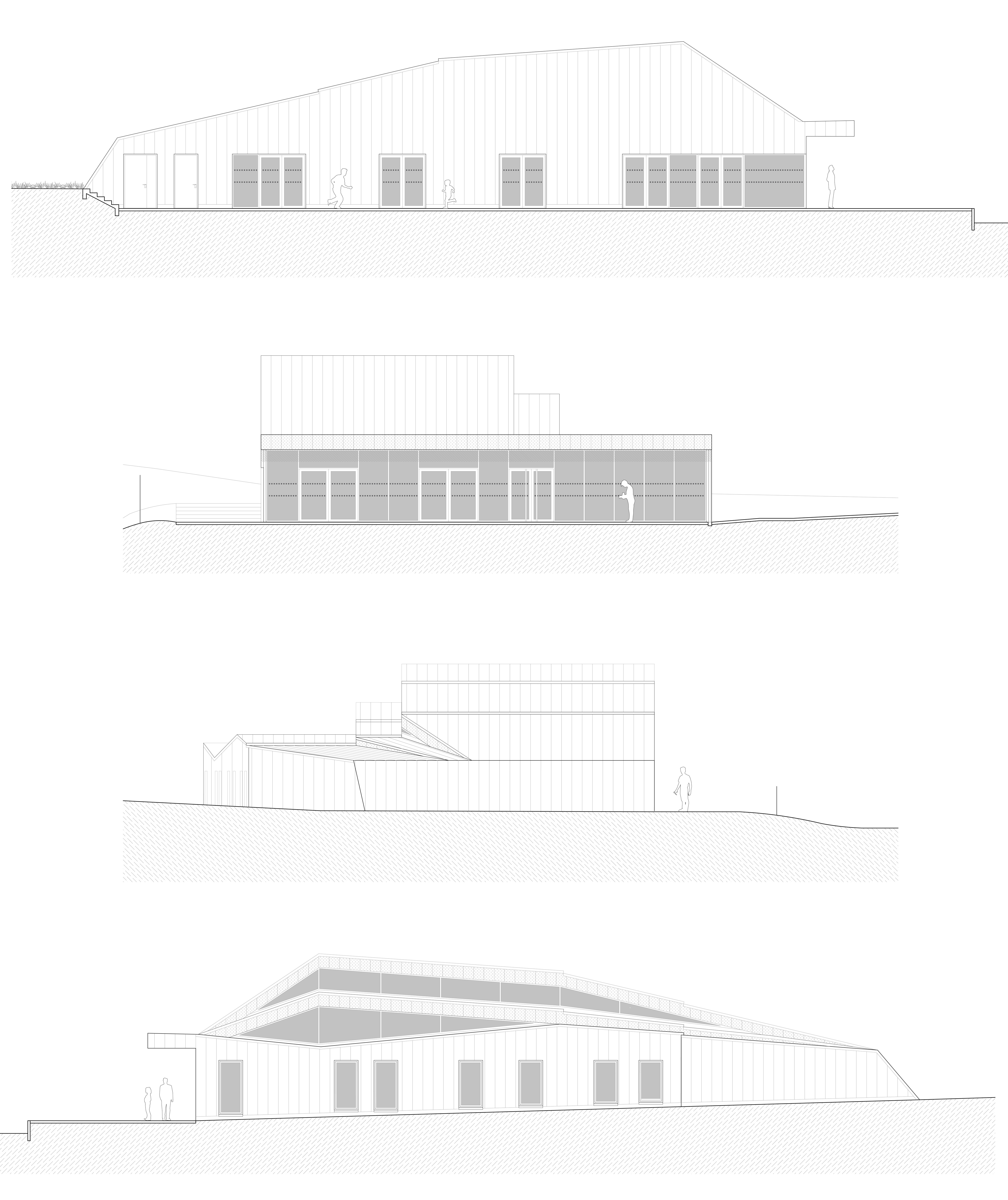 Pour répondre à la multiplicité des activités de l’espace jeune, nous avons choisi de travailler une structure de toiture créant des espaces variés à l’image d’un paysage avec une organisation créant une circulation centrale généreuse et fluide. Le hall et la salle d’accueil sont orientés Sud-Ouest pour amener luminosité et chaleur. Ils s’ouvrent vers le skate-park, les terrains de sport et profitent de la vue. La circulation centrale prolonge le hall et dessert à l’ouest les salles pour le public avec une belle hauteur sous plafond et à l’Est les bureaux avec une plus faible hauteur.