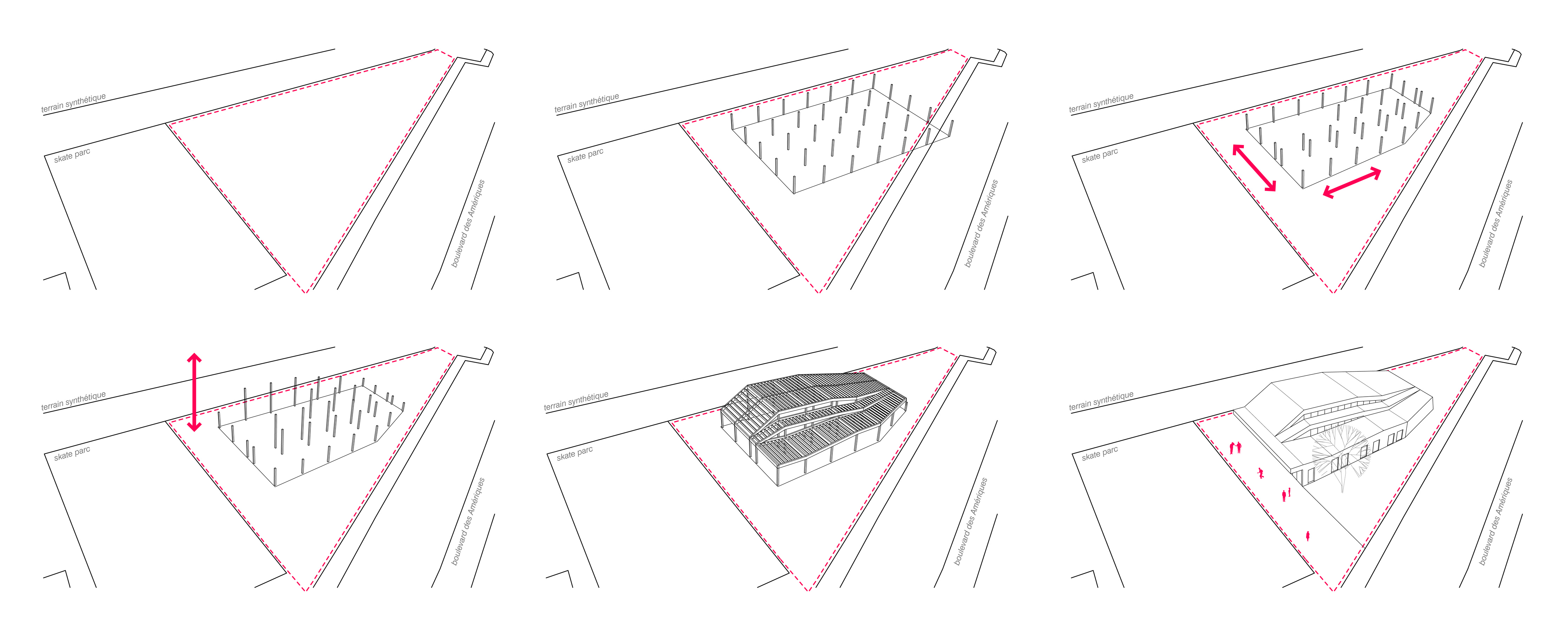 Descriptif technique : La structure du bâtiment suit une trame poteau-poutre en bois de 5x5m. Cette trame permet de mettre en place un cloisonnement intérieur indépendant de la structure et permettra donc au bâtiment d’évoluer selon les besoins de la ville. Le bardage et la toiture en zinc assurent la pérennité du bâtiment sans nécessiter beaucoup d’entretien. Le système de chauffage par le sol grâce à un circuit d’eau chaude permet aussi de refroidir le bâtiment en été, en faisant circuler de l’eau froide sans dépense d’énergie.