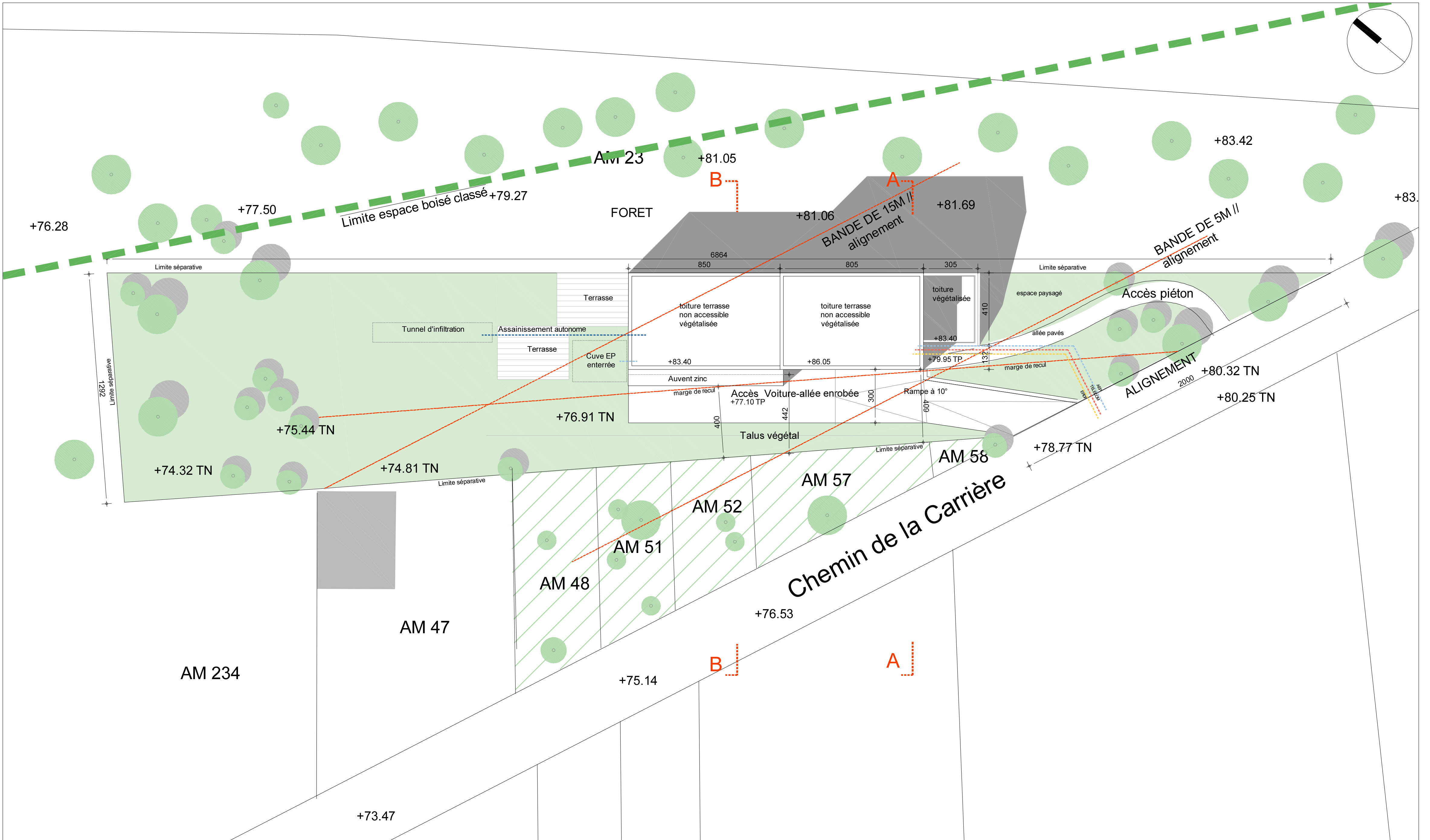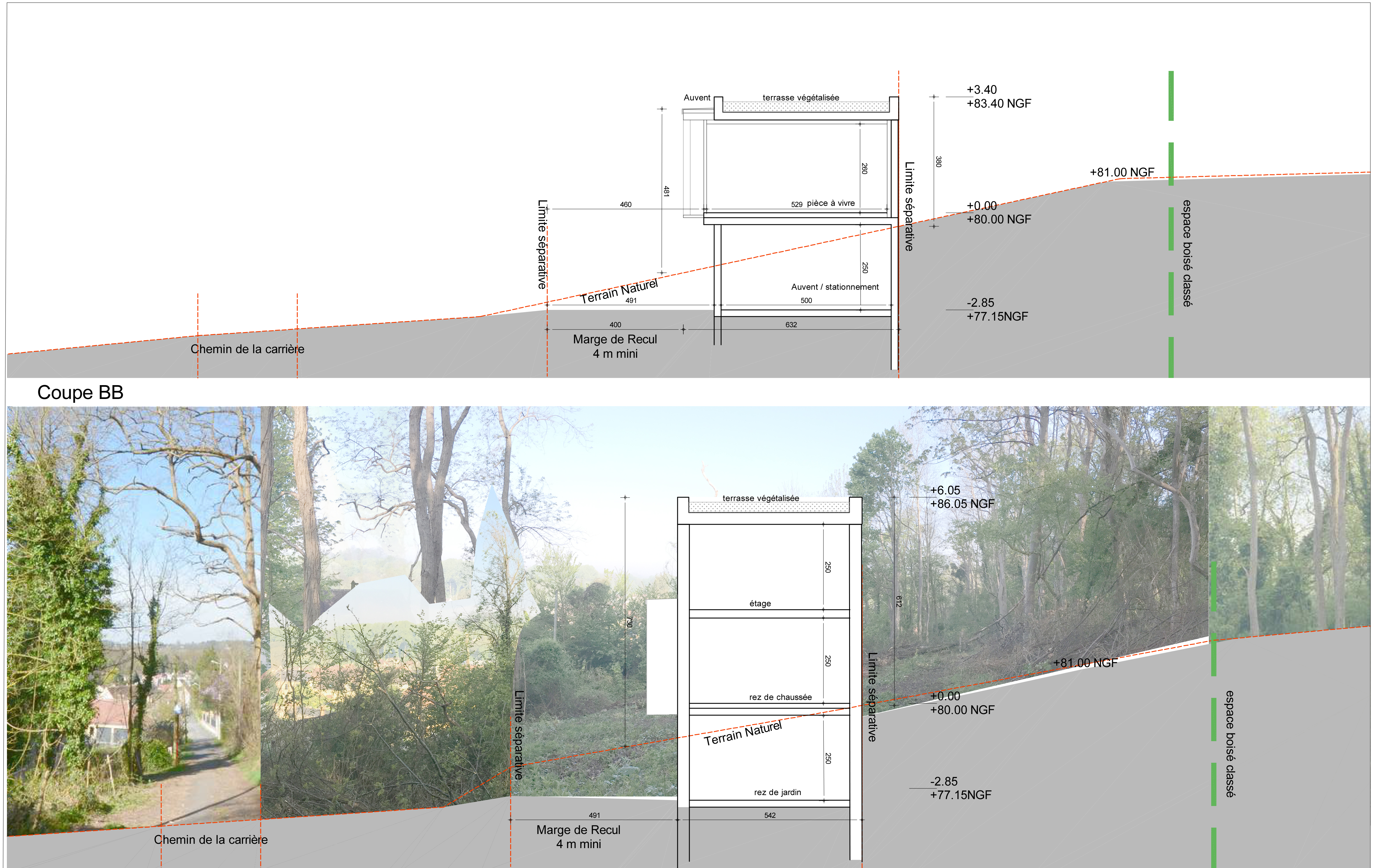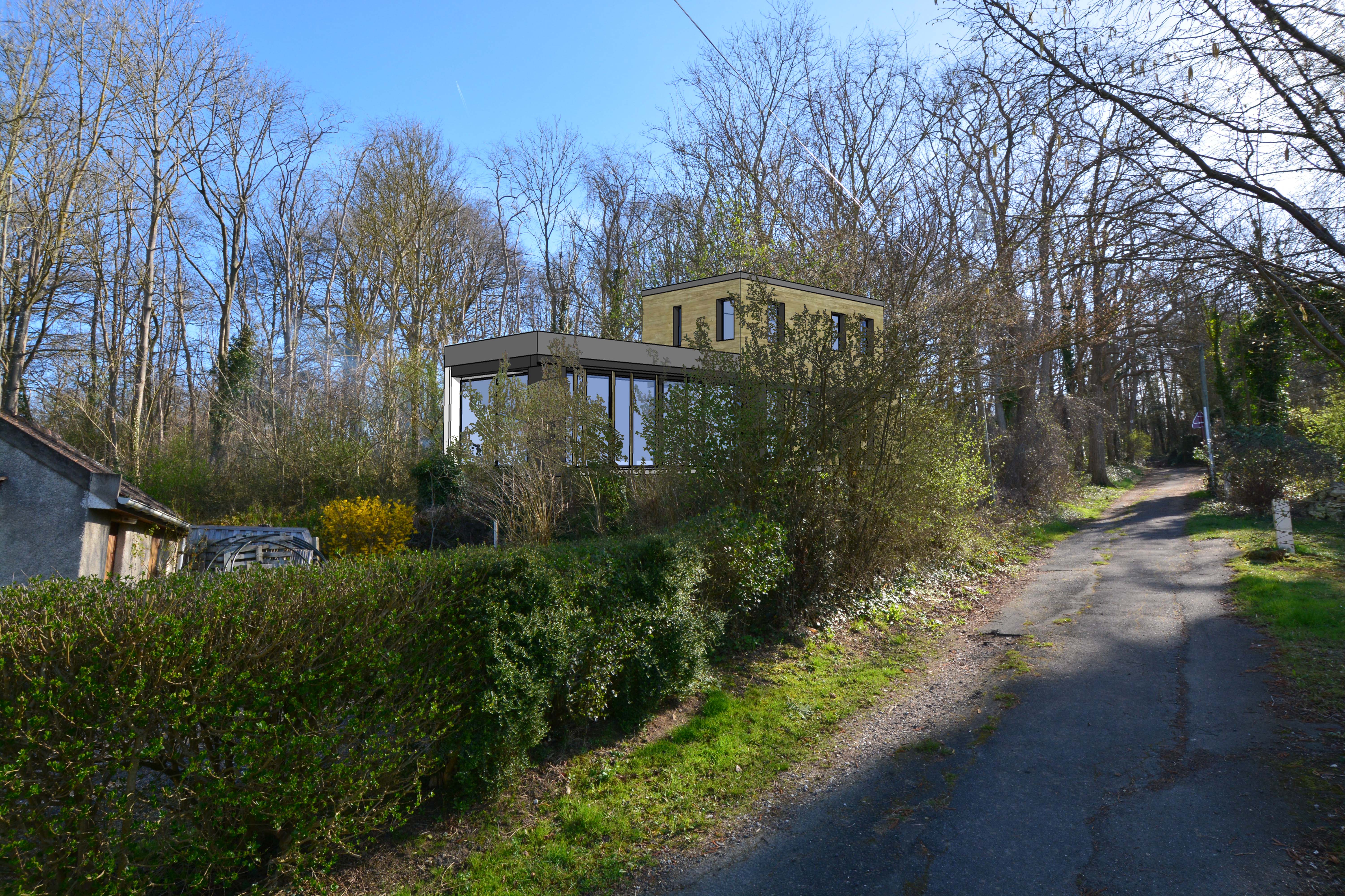 Le projet s’implante en lisière de forêt sur les hauteurs de Presles. Le terrain, long et étroit présente une double déclivité. Par ailleurs sa situation offre des vues dégagées et une orientation Sud-Est / Nord Ouest. Tout l’enjeu de l’implantation résidait dans un travail d’intégration au paysage: s’adosser à la forêt et s’ouvrir sur la vallée grâce aux trois autres façades suivant la course du soleil. La maison se compose de trois niveaux :un rez de jardin ancré dans le sol pour soutenir les terres, un rez de chaussée en lien avec le terrain naturel pour les espaces de vie et un étage.