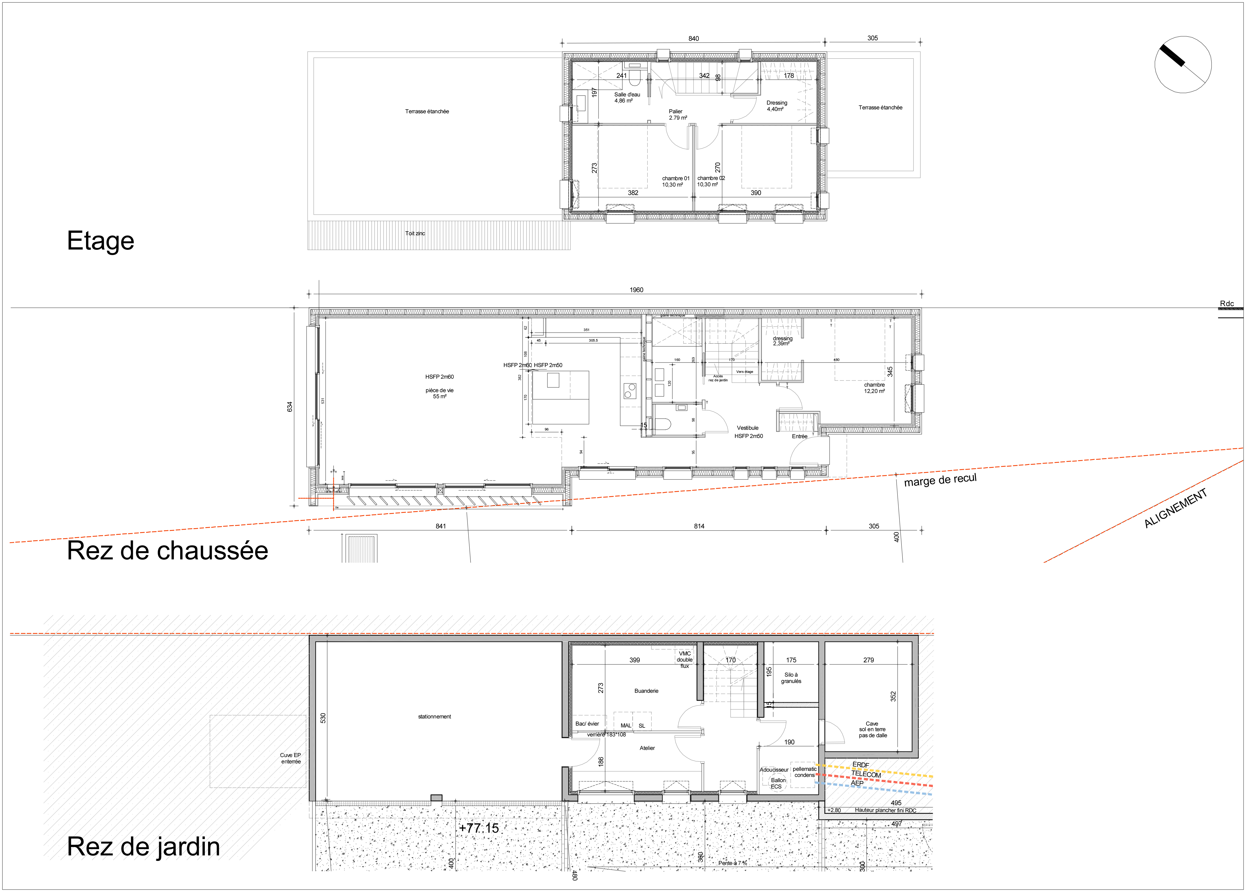 Descriptif technique : Maison ossature bois Bardage bois Mélèze de Sibérie Menuiseries aluminium RAL 7016 Volets persiennés bois Mélèze de Sibérie : confort d'été espace de vie Toiture terrasse étanchée pour végétalisation Cuve de récupération d'eau de pluie couplé en By-pass pour l'alimentation des WC Chaudière bois OKOFEN avec silo pour granulés Poêle à bois Hase Ventilation double flux Assainissement autonome: Stoc environnement