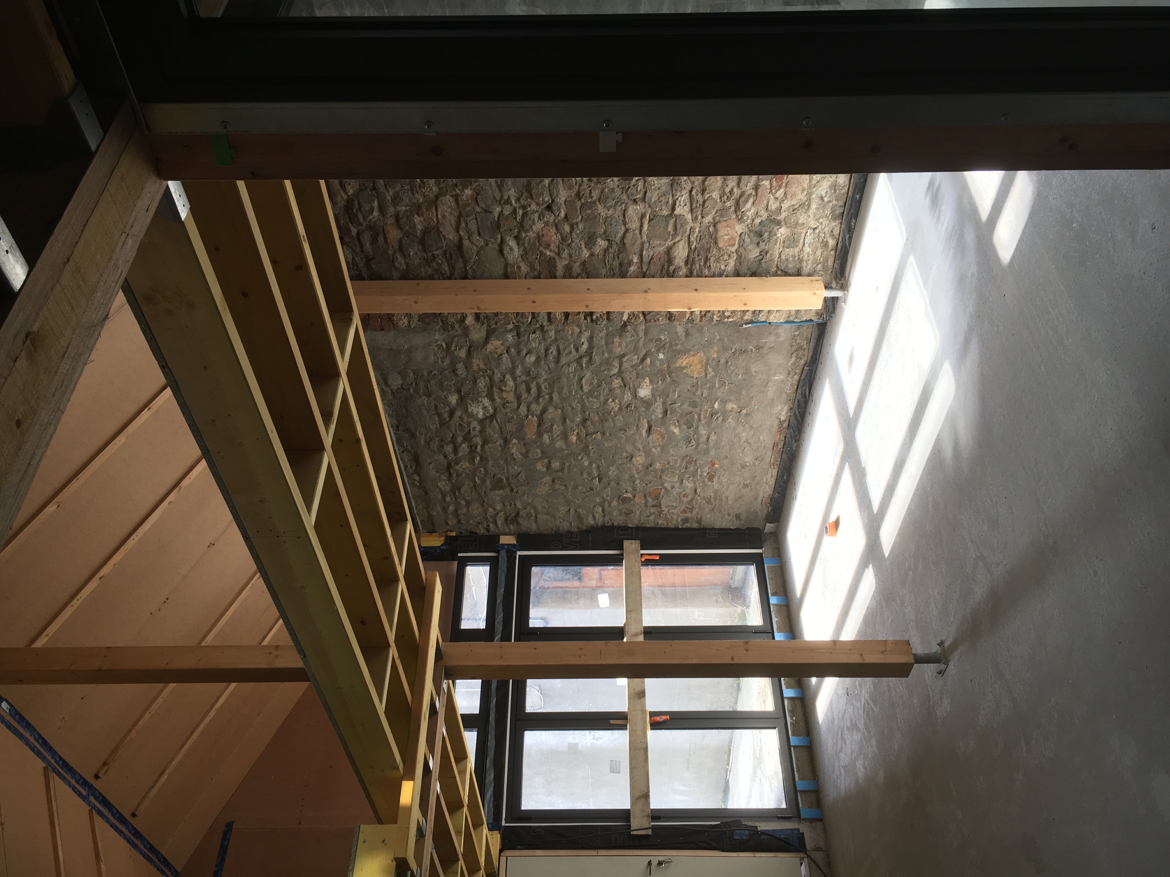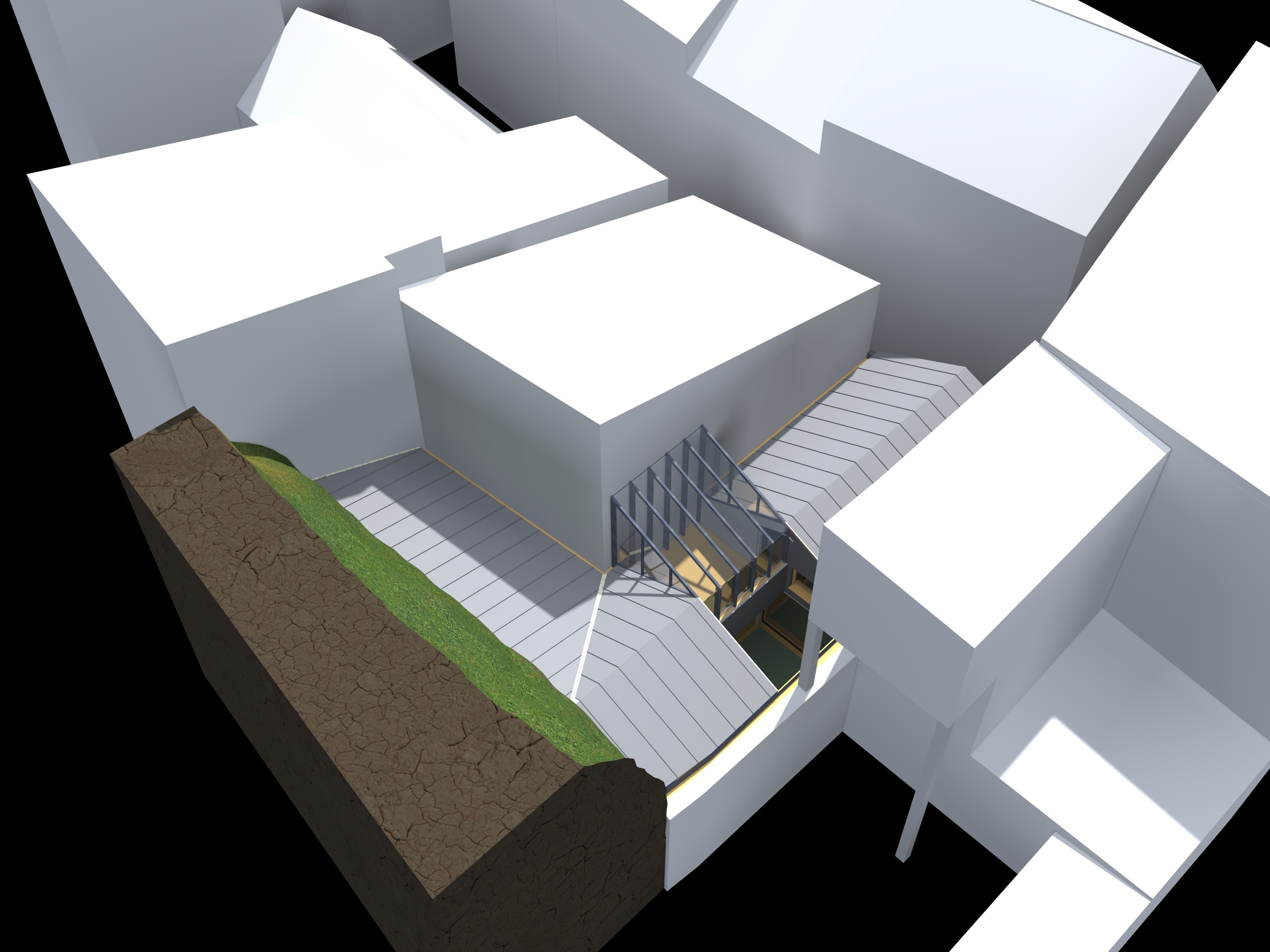 Approche environnementale : Le projet ne comporte qu’une façade, les autres parois étant une falaise ou des murs mitoyens. Recourant à des matériaux biosourcés, il consiste principalement en une toiture et substitue à une charpente traditionnelle obsolète une charpente bois contemporaine. L’isolation est en laine de bois, l’étanchéité est faite d’une membrane PVC recyclable protégée par une végétalisation. Cuisine, chaufferie et sanitaires sont près de la rue pour minimiser les réseaux. Le chauffage sol et l’E.C.S. sont produits par une P.A.C. de fabrication locale sur sonde géothermique, sous contrat d’énergie verte.