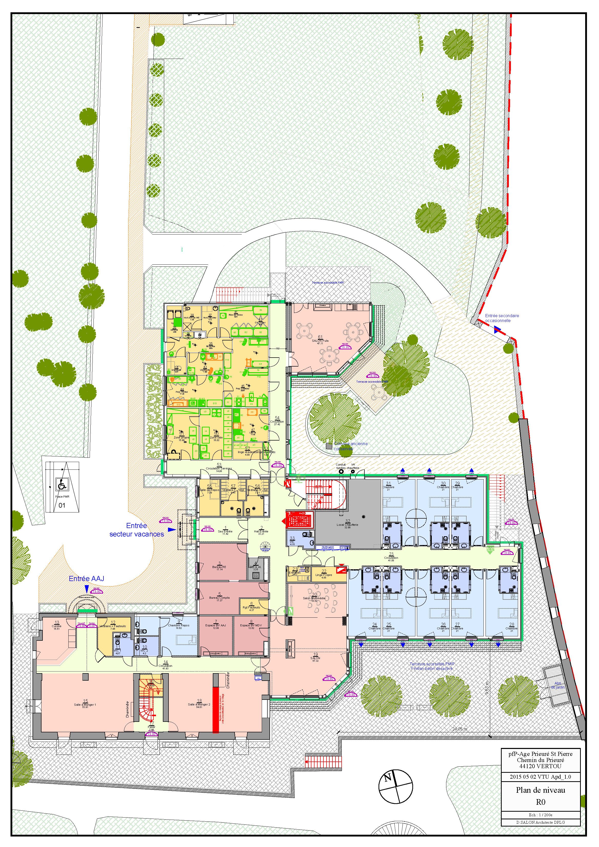 Le Prieuré à Vertou, l'une des 15 maisons de vacances pour personnes âgées des PFP, possède une géométrie réglée sur une grande allée et sa grande maison de maitre existante. Les extensions successives tournaient le dos à la rivière. Notre projet a inversé la relation du site au paysage. Un bâtiment s'installe en retrait de l'éperon rocheux, libérant une très grande terrasse plein sud dominant le paysage. L'autre bâtiment borde et conforte l'allée centrale historique. Le minimalisme des volumes à R+1 et ses façades bois ont permis une bonne intégration au sein de l'incontournable et emblématique "Vue de Vertou".