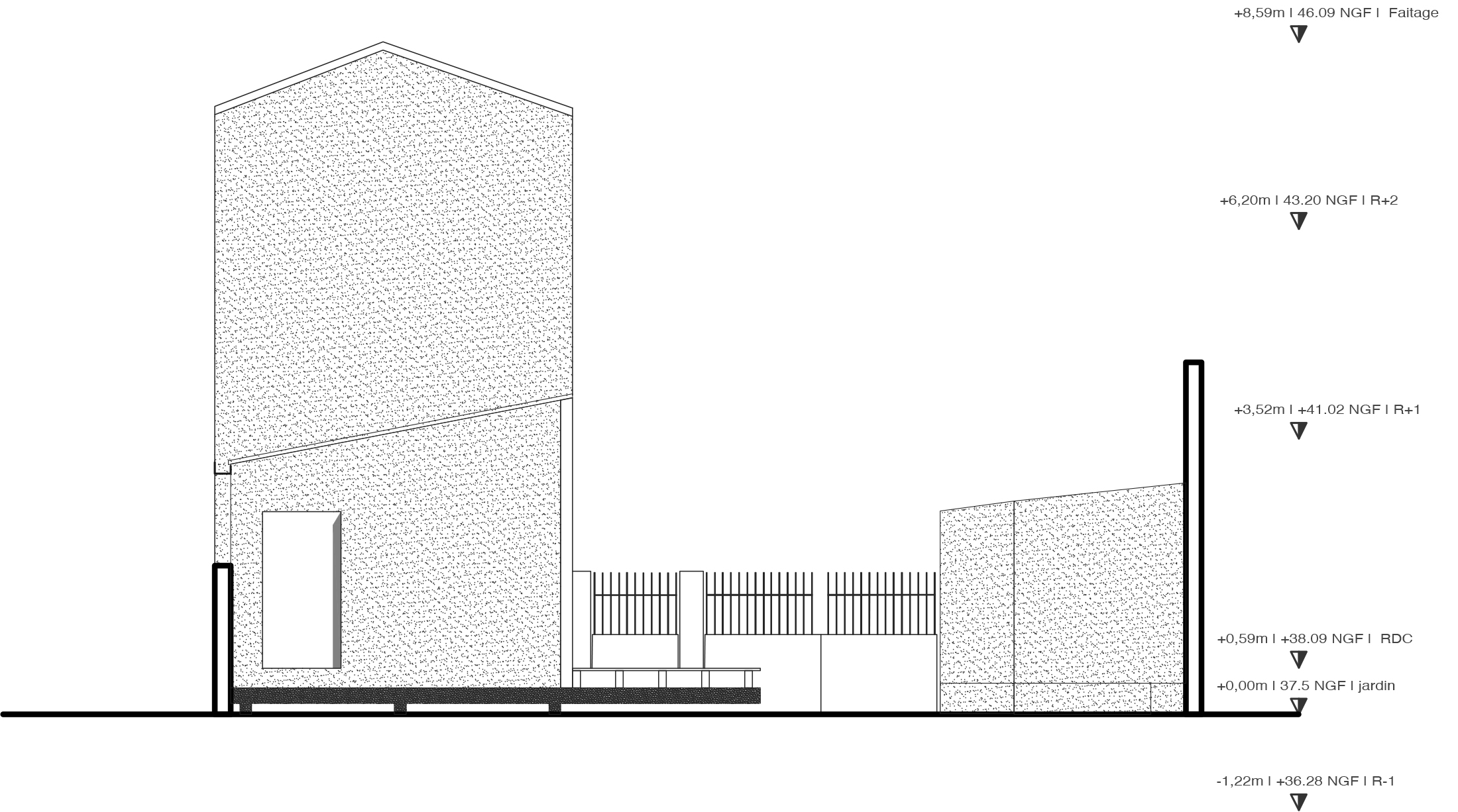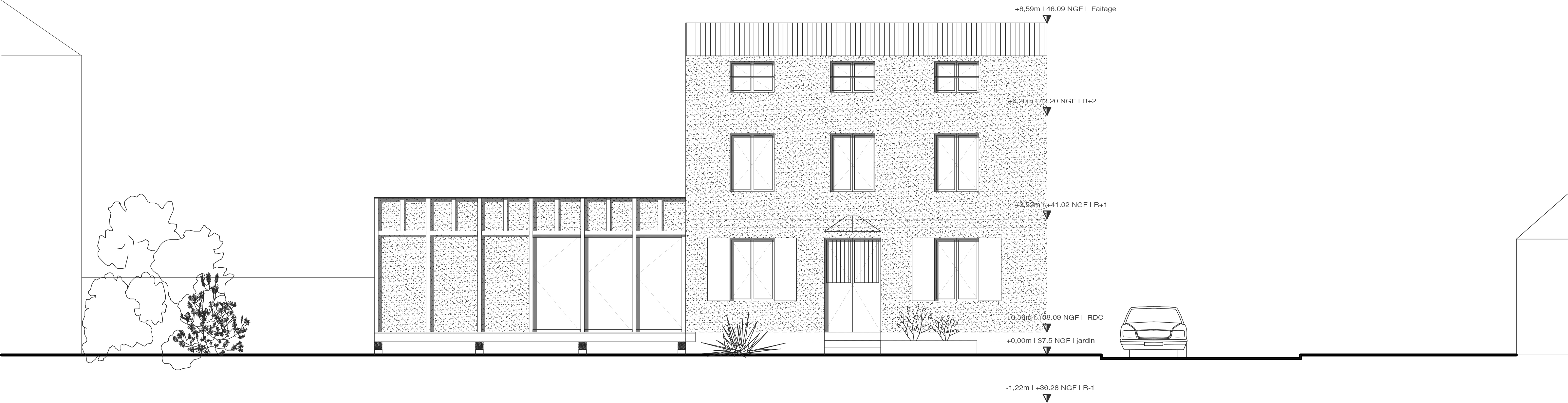 Ce jeune couple avec deux enfants vient d’emménager dans une maison des années 1960 à Neuilly Plaisance en région Parisienne. Les clients souhaitent agrandir l'espace du Rez de chaussée où ils se sentent à l’étroit en y intégrant l’ensemble des pièces de vie tel que le salon, la salle à manger, la cuisine et un sanitaire. Le défi pour l’architecte a été de créer une volumétrie plus généreuse tout en restant dans le prolongement du pignon imposé par le PLU. Le projet est traité comme un ponton habité dans la continuité du Rez de chaussée existant. Ce ponton est composé d’une partie couverte dans le prolongement de la façade et d’une partie extérieure en surplomb par rapport au terrain naturel. Cette composition permet d’étendre l’espace du salon sur la terrasse pendant les beaux jours via une grande baie vitrée qui se coulisse.