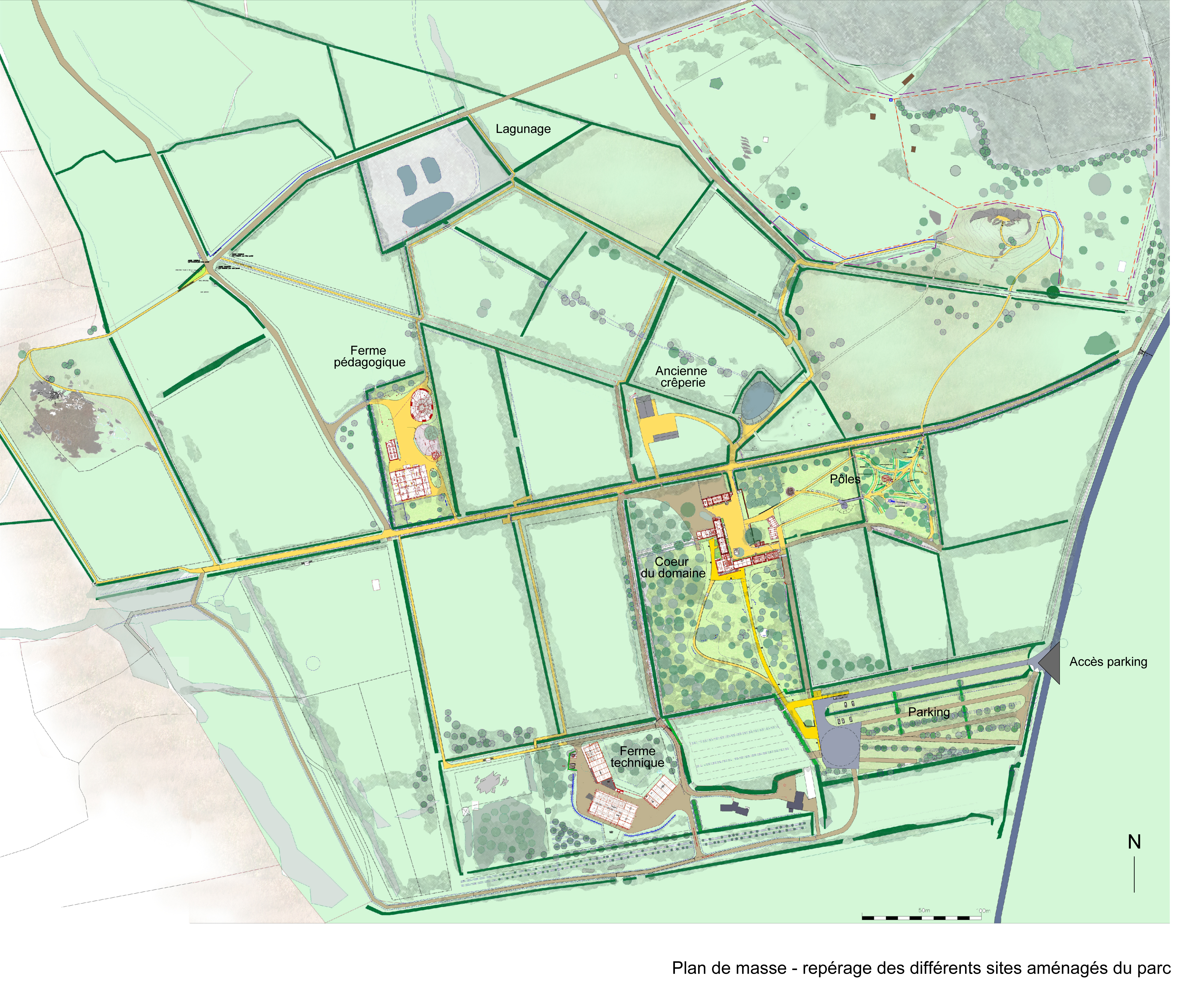 Trois entités construites sont dispersées sur le Parc. Le Cœur du domaine abritant accueil, boutique, salon de thé, bureaux et salles d'exposition ouvre la visite vers les 3 pôles pédagogiques et les allées plantées. Les extensions créées confortent la cour du corps de ferme existant. La balade se poursuit vers la ferme pédagogique avec hangar agricole rénové, salles de cours pour les groupes scolaires, maternité à truies et volière. Dernière entité, la ferme d'exploitation, qui comprend une stabulation, un hangar de stockage, des locaux pour les techniciens animaliers et un atelier.