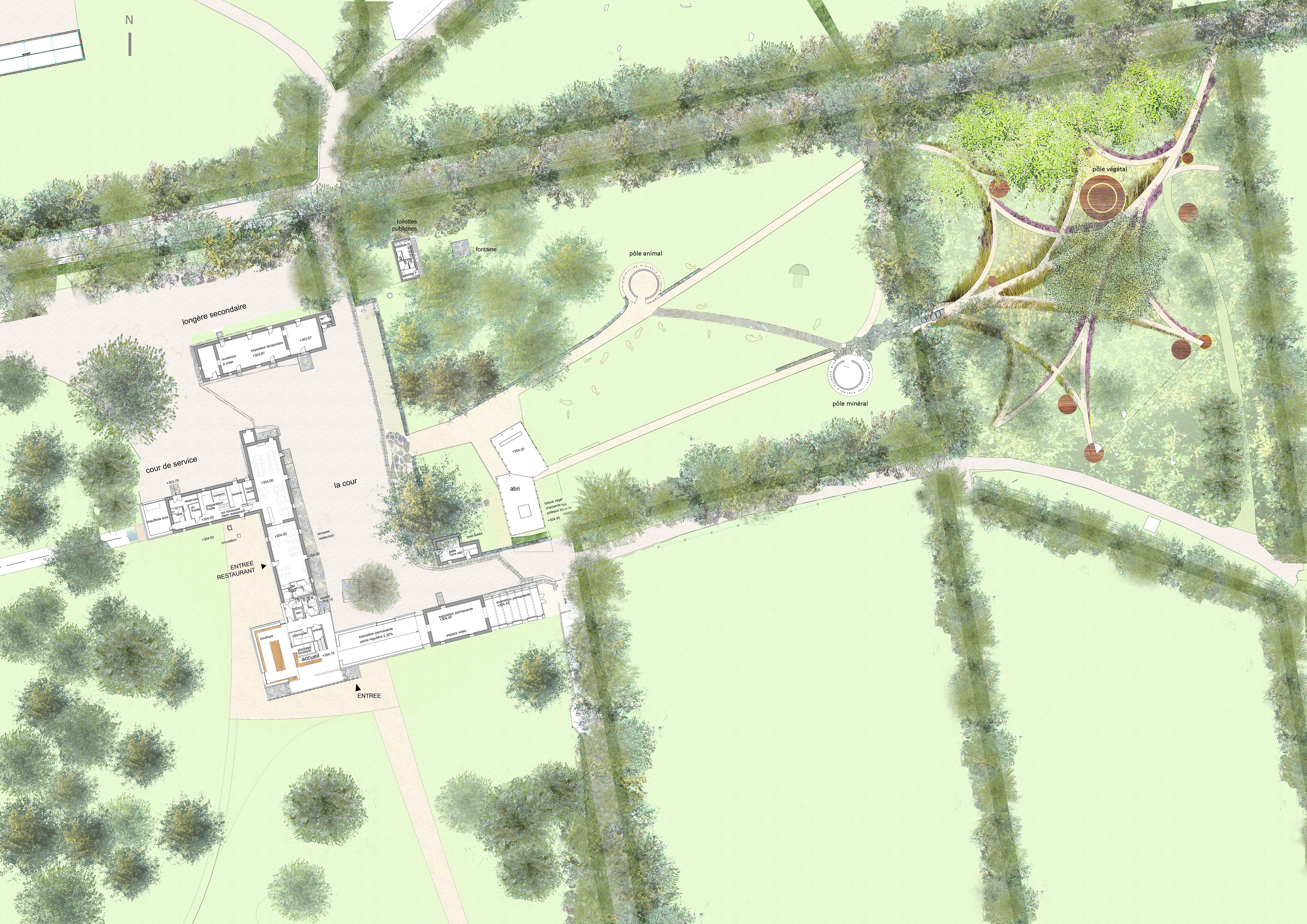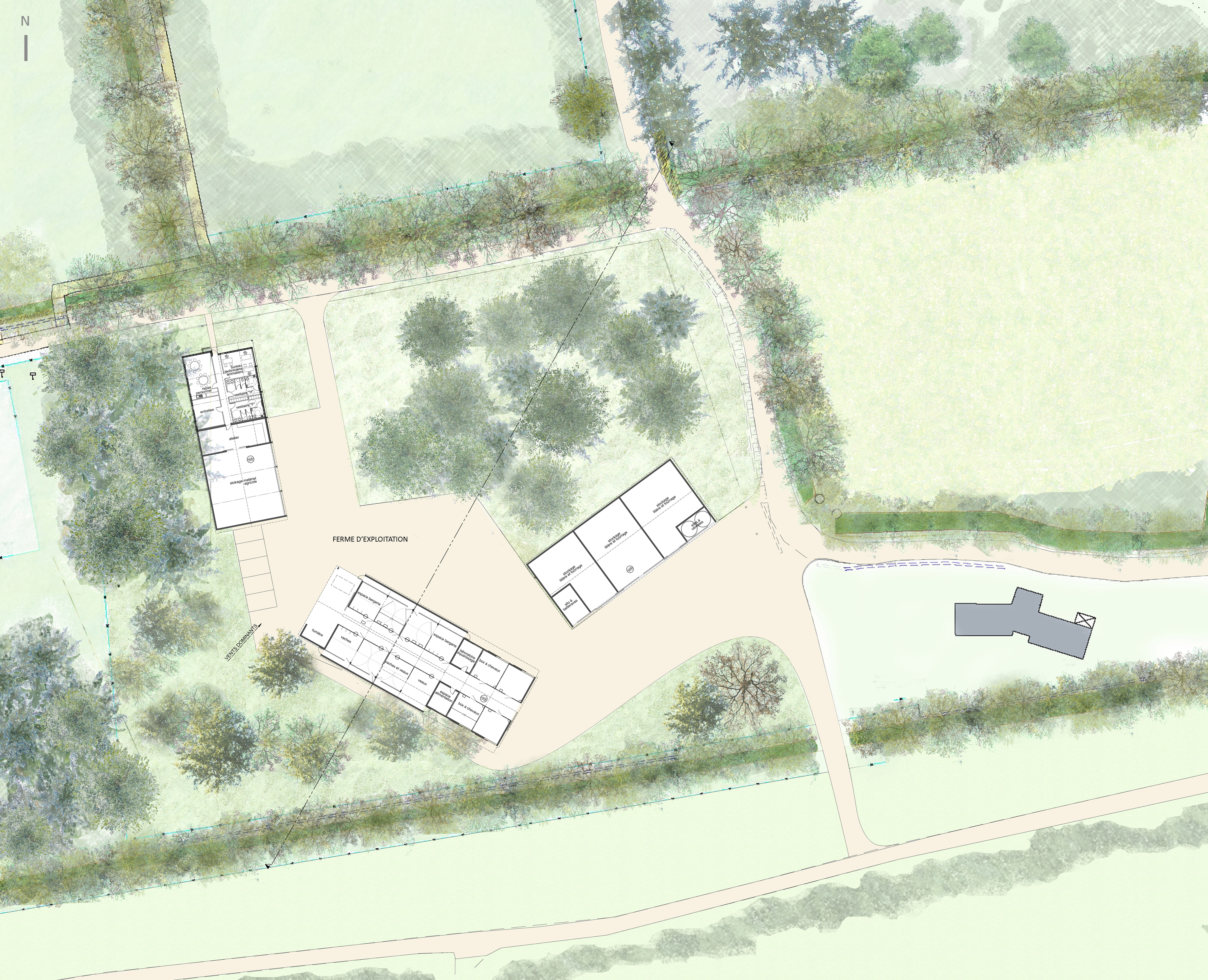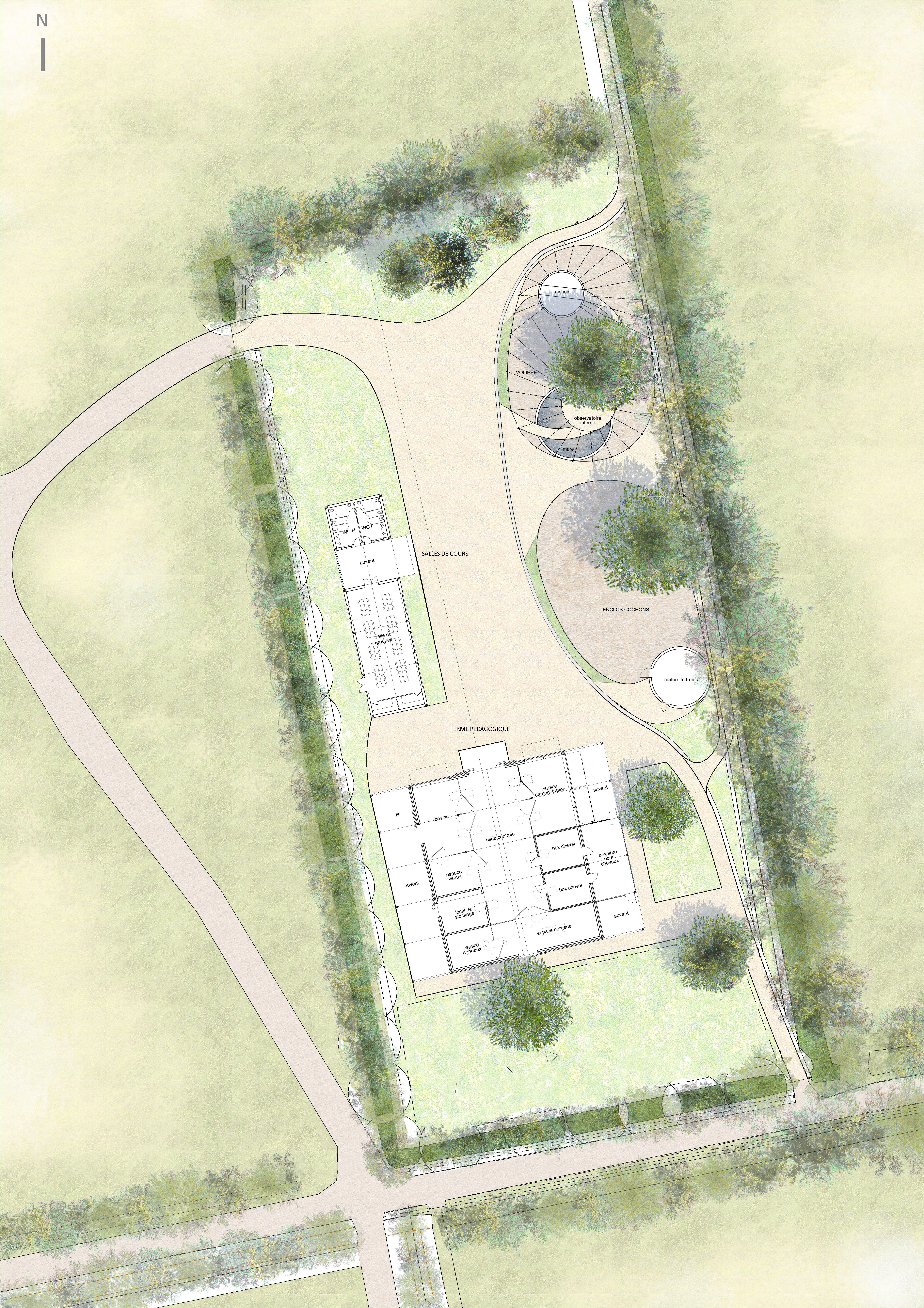 Approche environnementale : Les matériaux et mises en œuvre choisis pour les ouvrages neufs et parties réhabilitées s'accordent à la «rusticité» des existants et résonne avec la particularité des espaces extérieurs. Les pôles animal et végétal, cylindre ajouré et feuille en équilibre, conjuguent scénographie pédagogique et rapport étroit au paysage environnant. L'attention aux vents dominants et aux apports de lumière, gage de confort animal, dicte l’implantation des bâtiments de fermes et le calepin des bardages jointifs, à recouvrement ou ajourés. Le bâtiment d'élevage ouvre ainsi ses longs pans ventilés au Sud-Ouest.