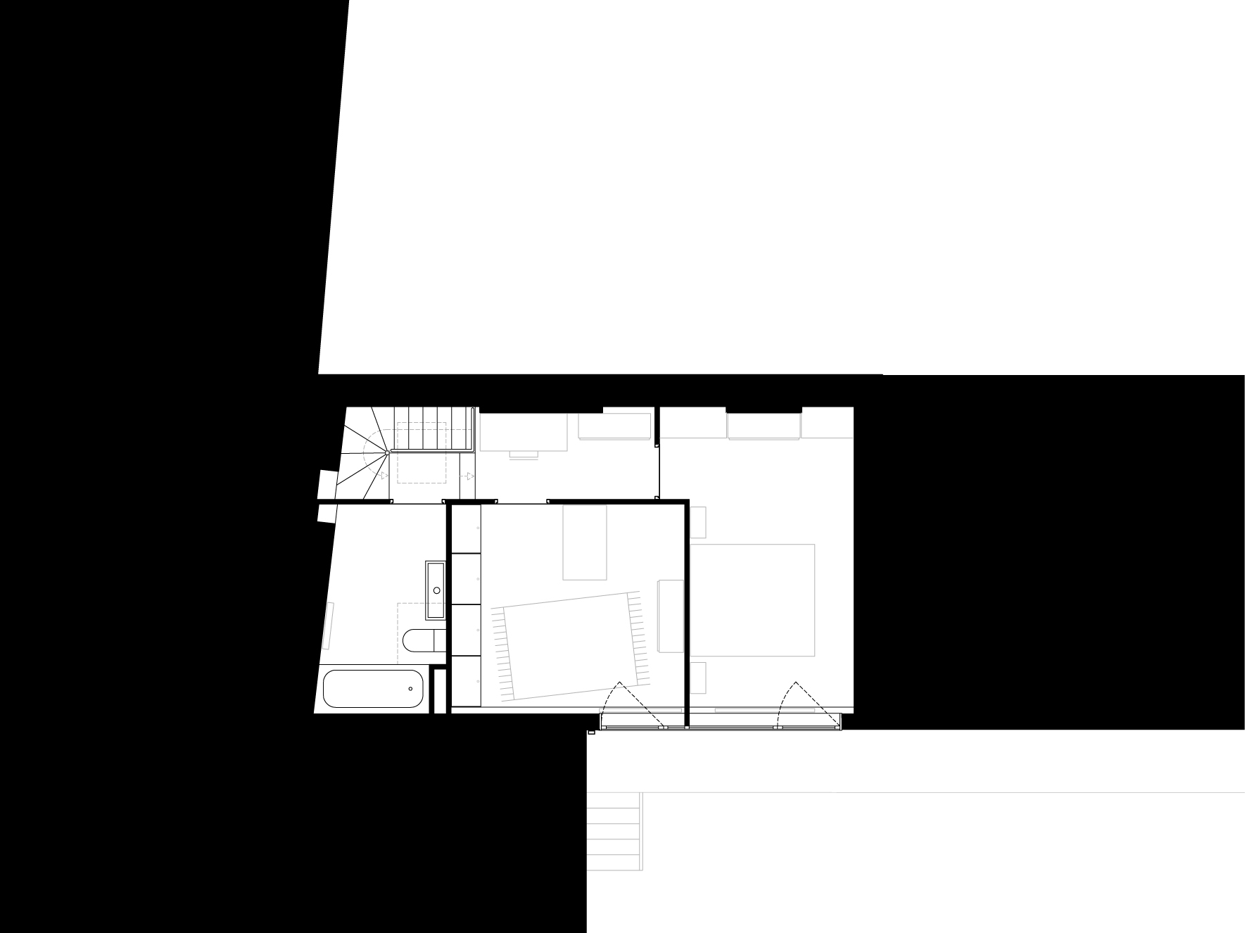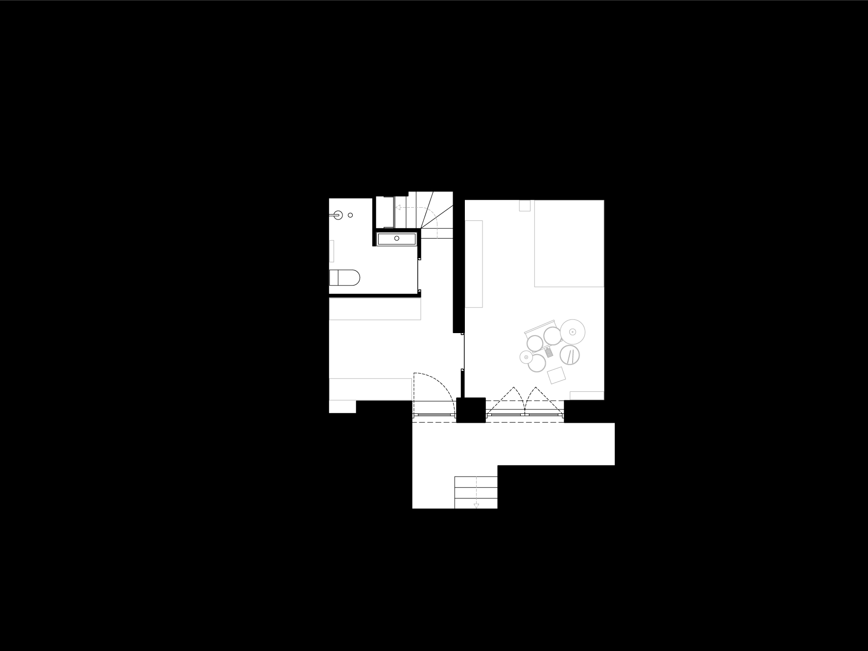 Au coeur d’un ancien faubourg et mitoyenne sur ses quatre façades, la maison a été totalement repensée pour apporter de la lumière et créer des espaces supplémentaires. L’absence de terrain implique une surélévation mais les reglementations urbaines interdisent toute création de volume. Ainsi, seule la toiture se décolle sans modifier la hauteur du faîtage pour apporter la luminosité et les volumes recherchés. La maison s’organise autour de son escalier, selon une succession de 4 plateaux ayant chacun sa propre fonction : l’atelier-stockage dans l’entre- sol, les pièces de vie et les chambres aux étages courants et la détente sur la toiture.