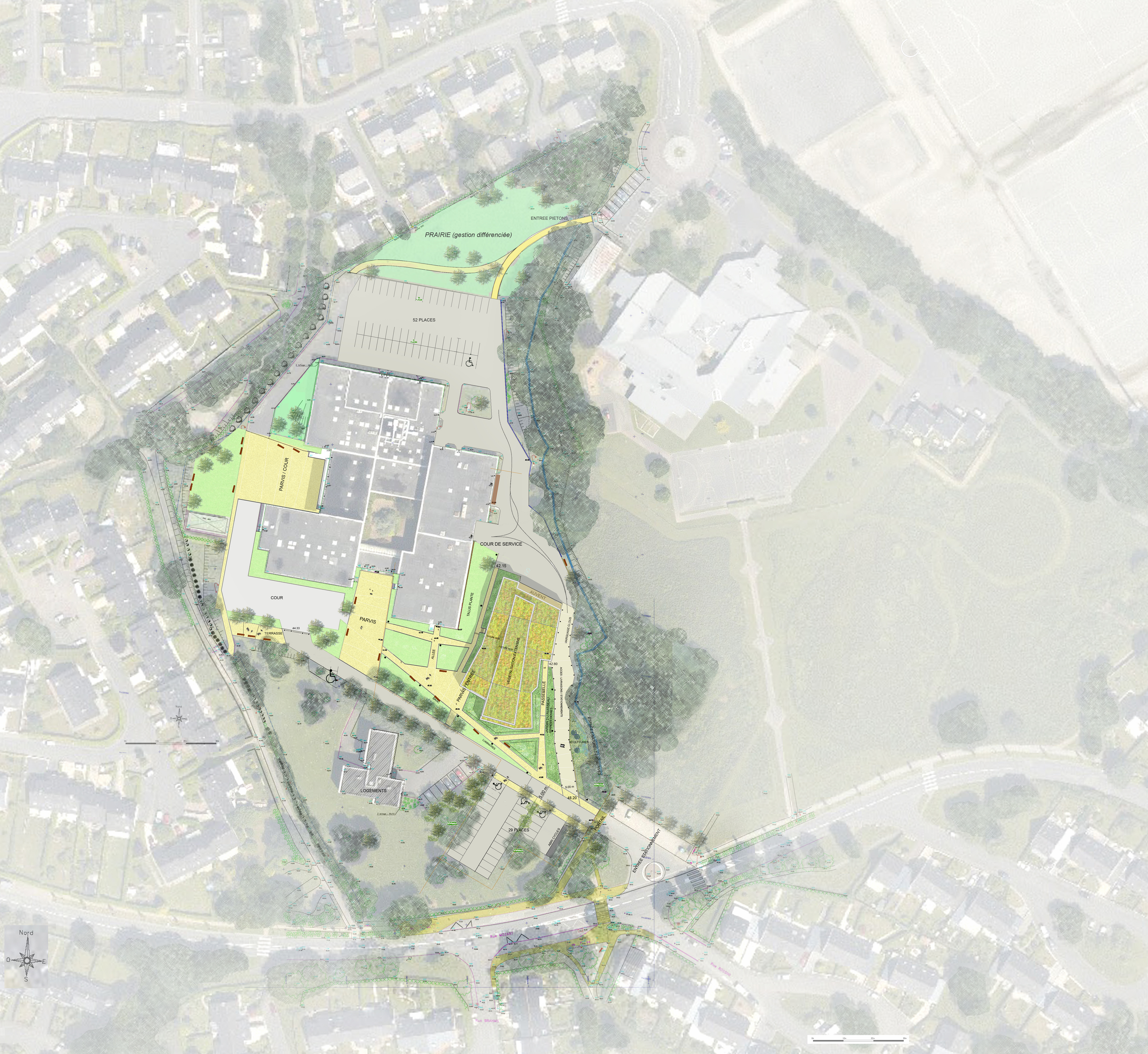 Espace contraint, fort dénivelé, dialogue avec le ruisseau et lien à tenir avec le bâtiment d’enseignement, conditionnent le projet de restaurant. Compacté sur 2 niveaux, il se glisse dans l’interstice, dialogue dans ses découpes et ondulations de toiture avec les saules à l’Est et évite tout rapport frontal avec l’externat. Trois inflexions abritent les salles à manger au Sud et accompagnent les cheminements piétons redessinés. Topographie, surplomb et écoulement différé des EP justifient le traitement végétalisé des ondulations de la toiture, échos aux ondulations des berges du ruisseau.