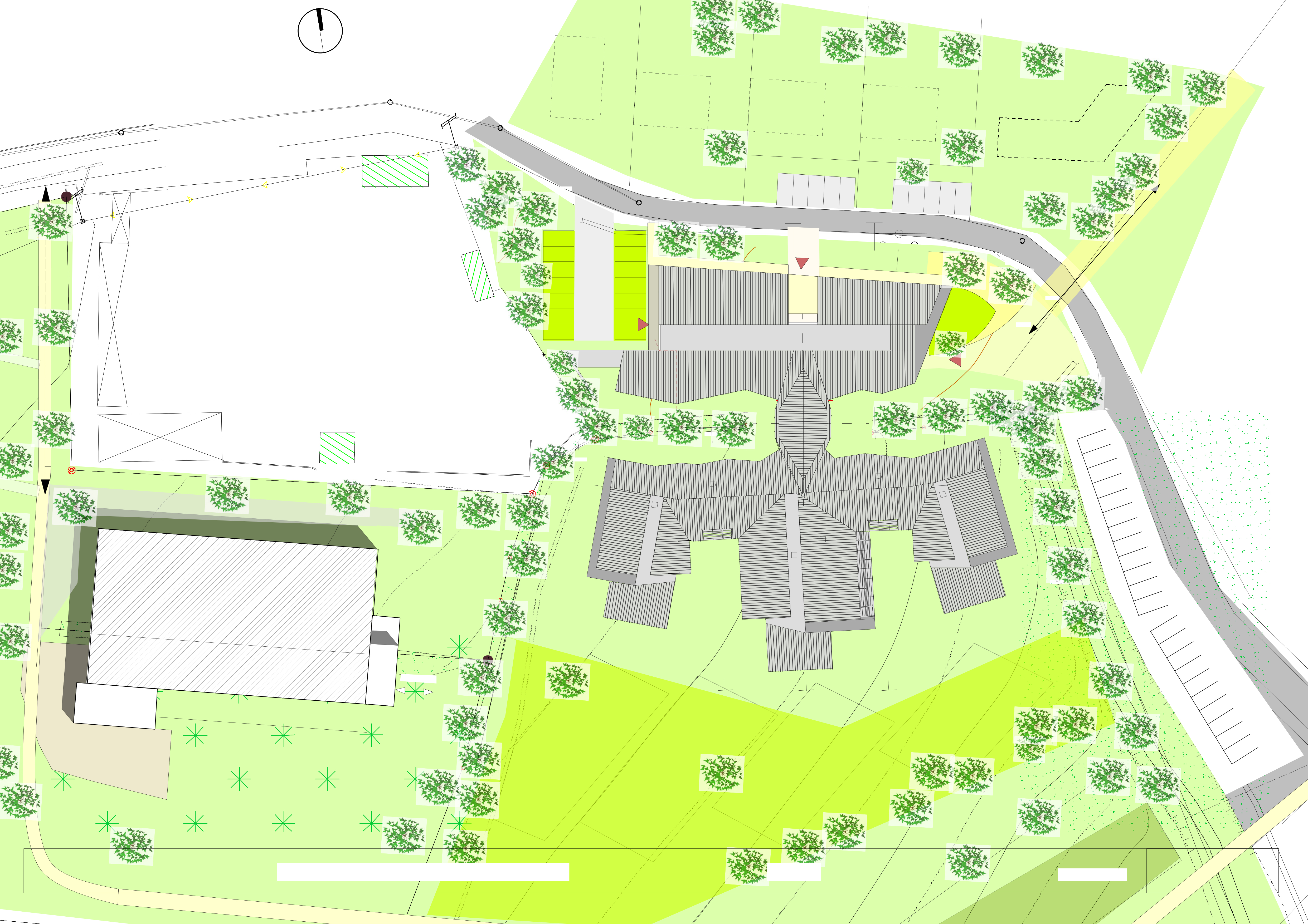 Descriptif technique : Le bâtiment a été conçu conformément au programme avec classement de l'établissement en 4e catégorie de type J. La structure est entièrement réalisée en ossature bois préfabriqué en usine avant assemblage à sec sur site. Le bâtiment est enveloppé par une toiture zinc qui se retourne en façade. Le bardage zinc et les panneaux composites s'accordent avec l'environnement proche composé de bocage dense. PEFC (Gestion forestière durable)