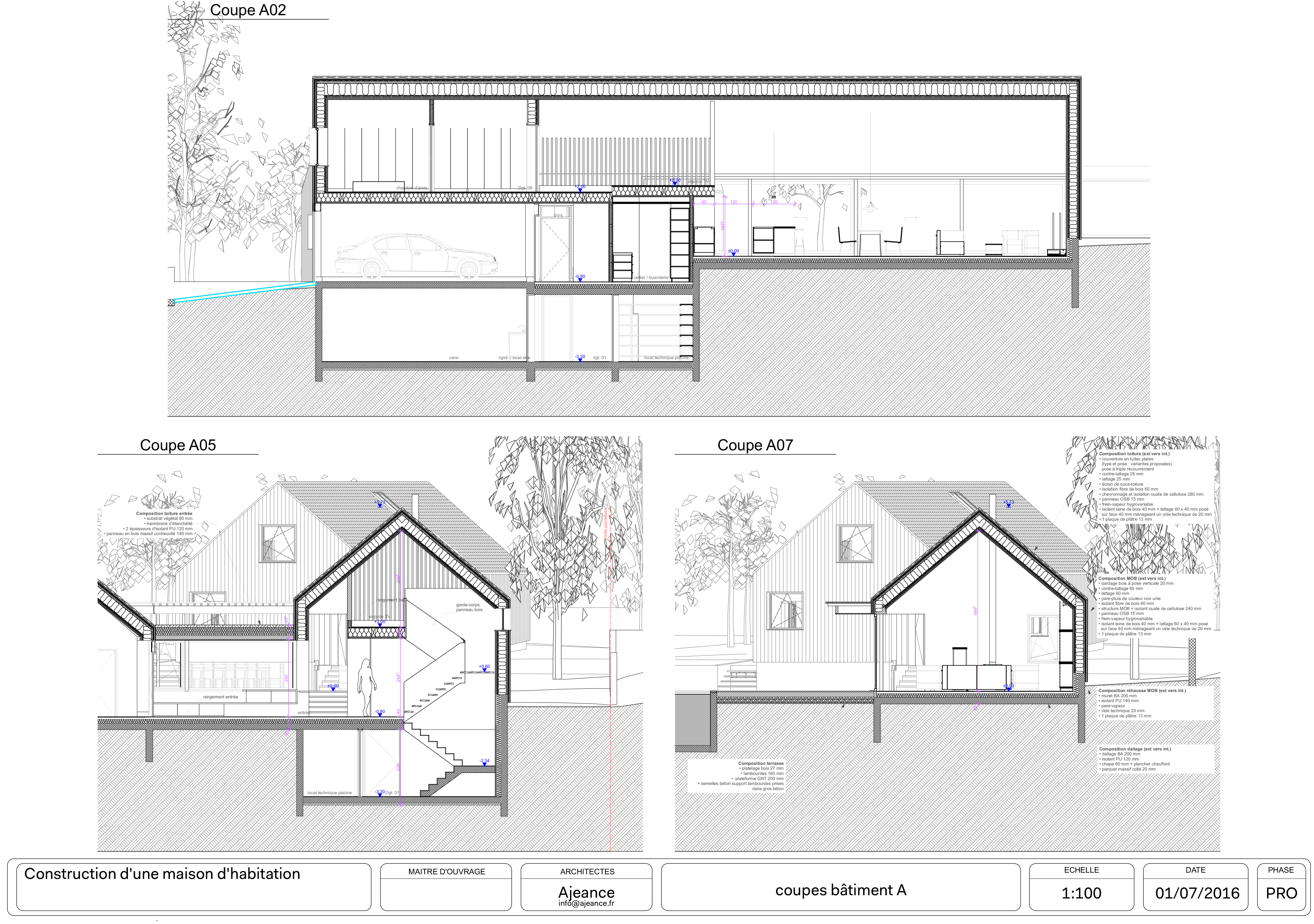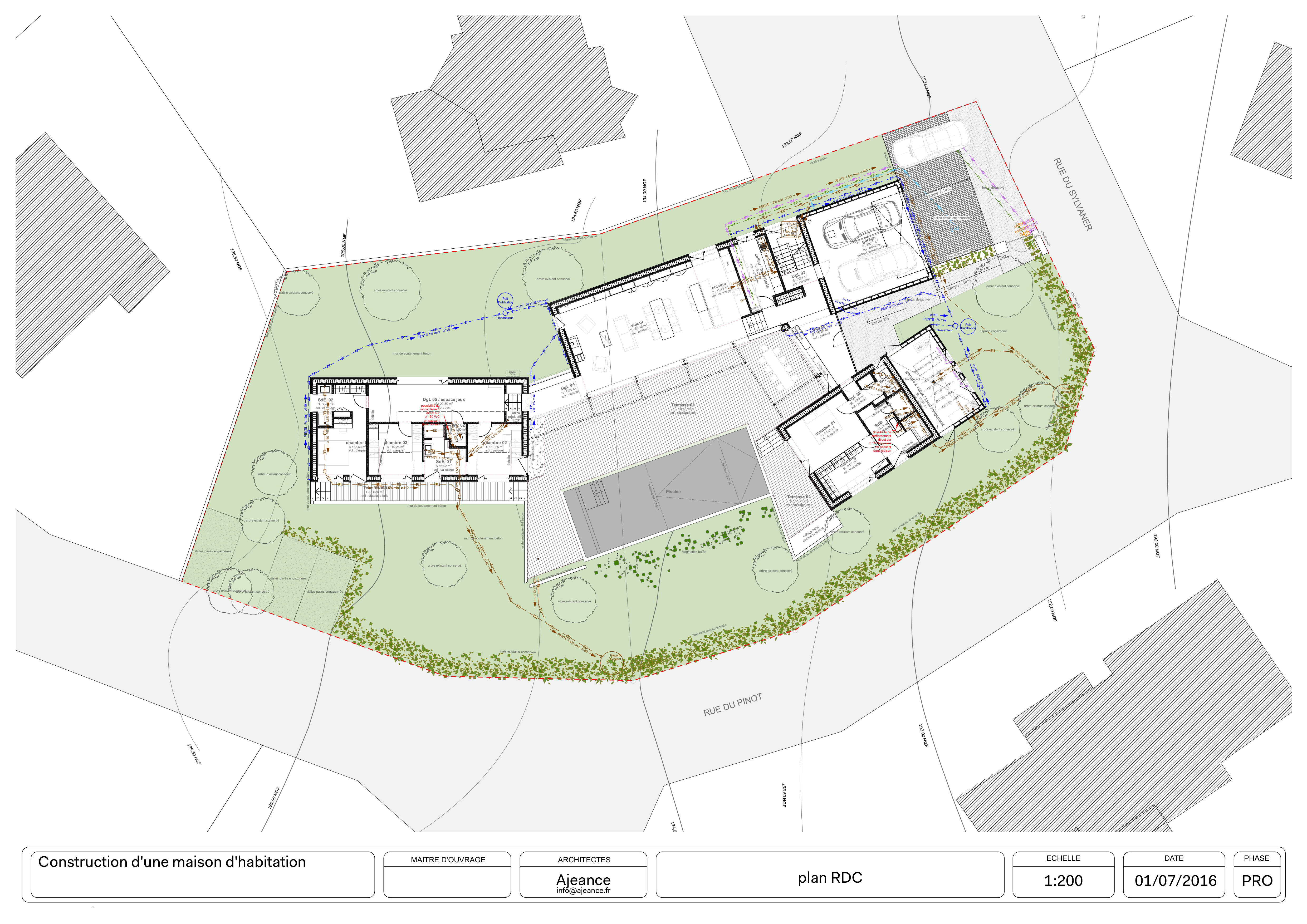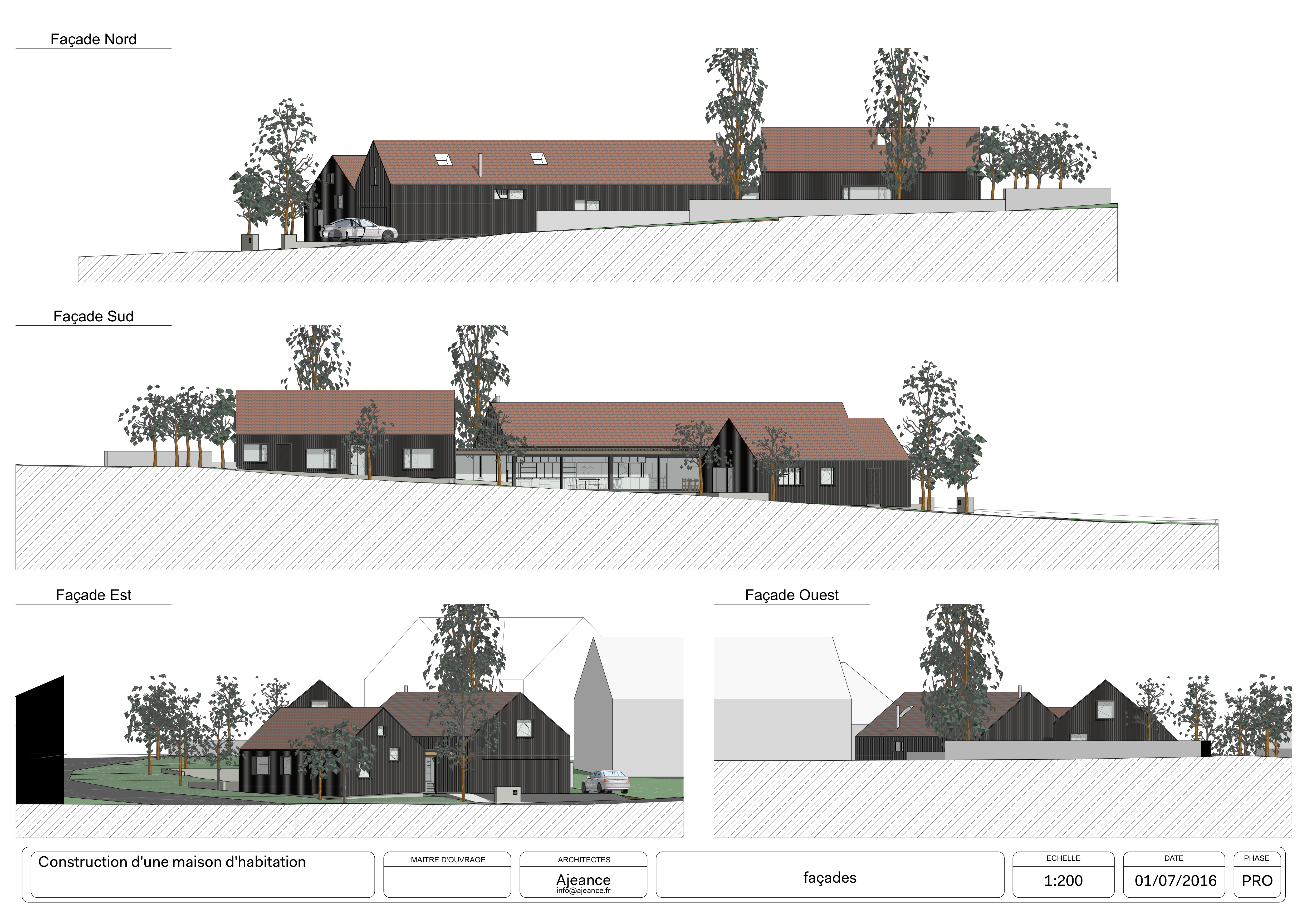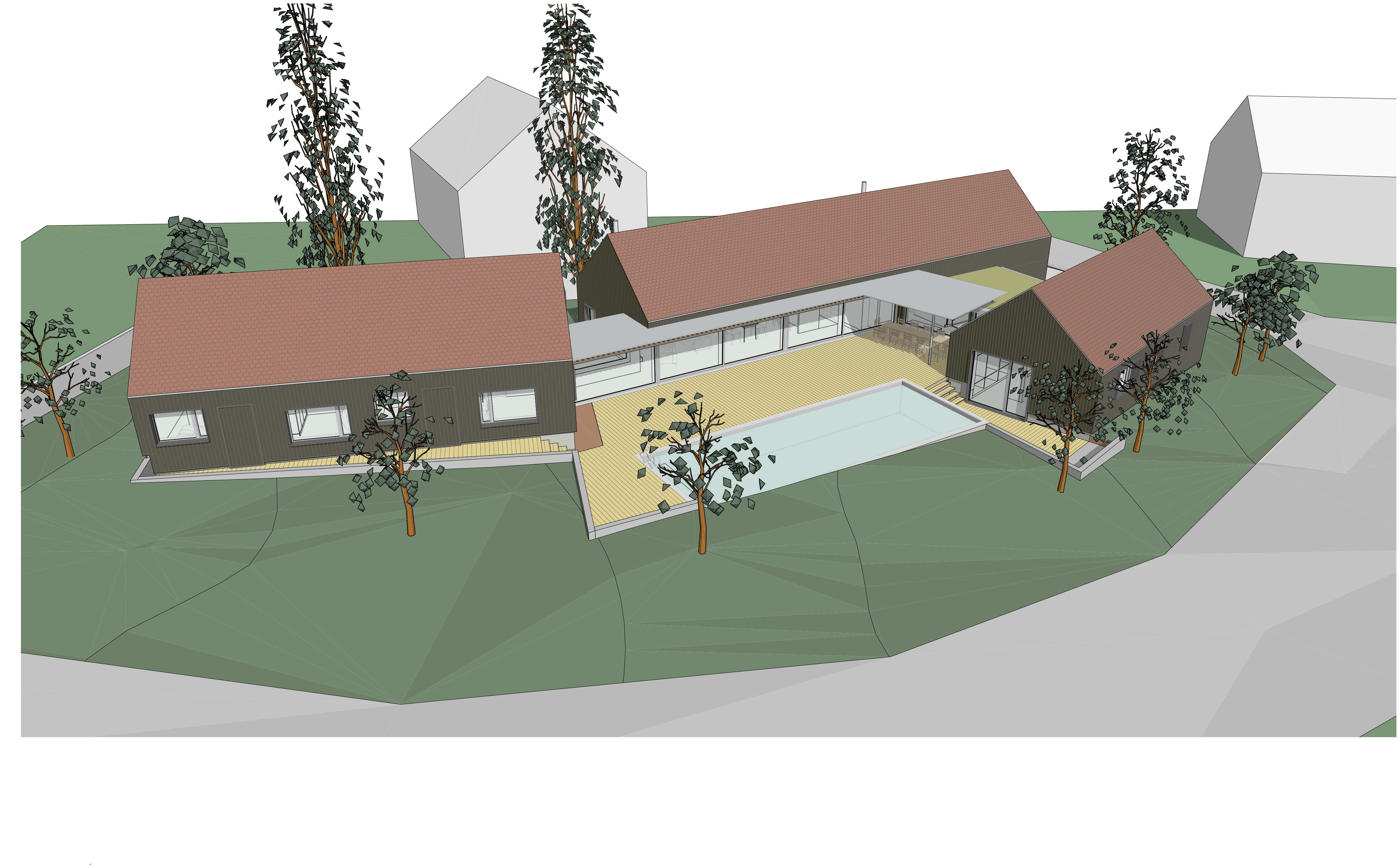 La maison d'habitation est répartie dans trois volumes longitudinaux, implantés autour d'un espace central extérieur, le tout épousant au mieux la topographie du terrain. Les trois volumes accueillent respectivement les pièces de vie dans le volume central, et de part et d'autre l'espace des parents et l'espace de enfants. Au delà de la qualité des espaces, l'enjeu du projet réside dans le respect d'un certain aspect patrimonial revisité, qui permet une intégration optimale dans l'environnement pavillonnaire rural.