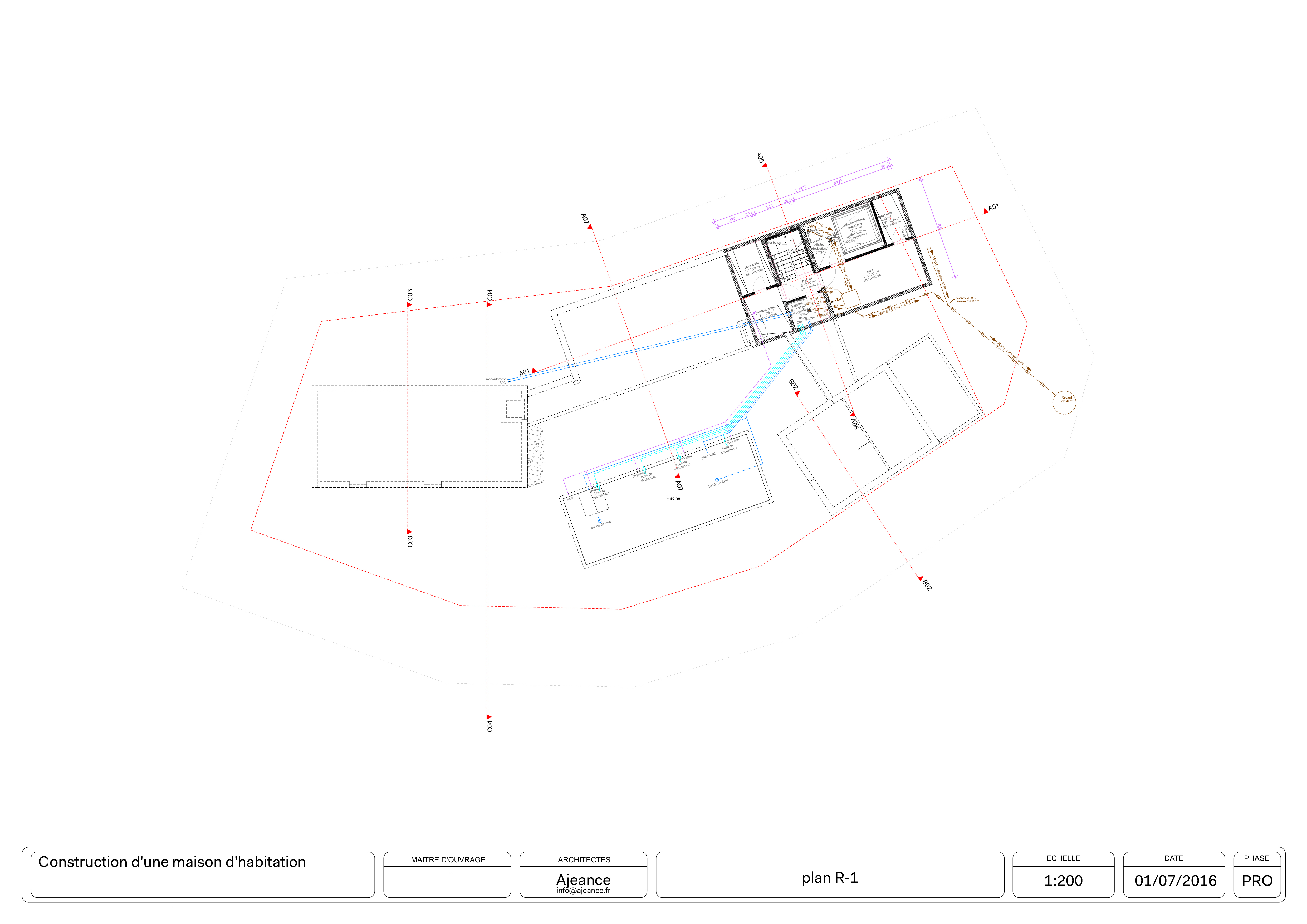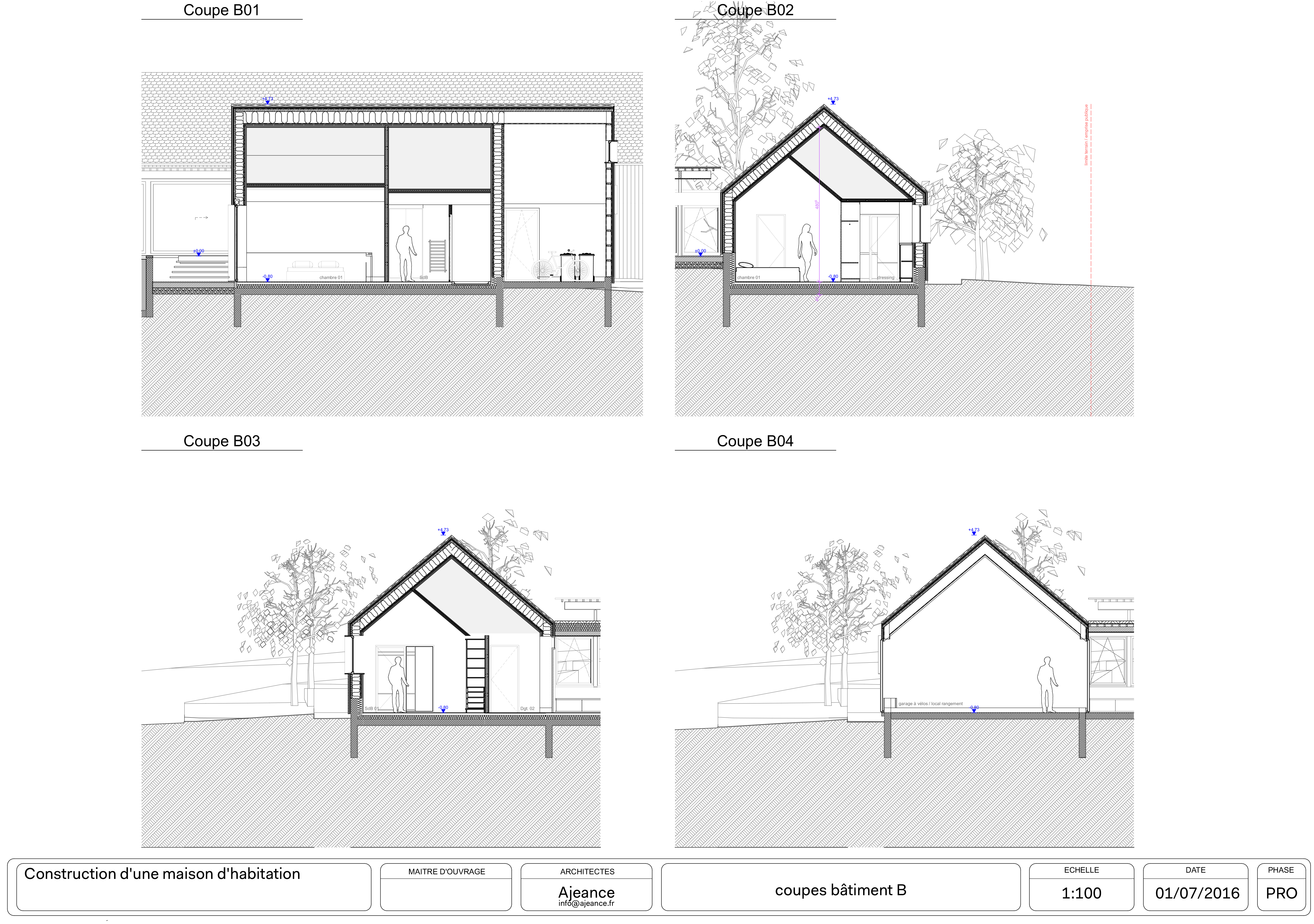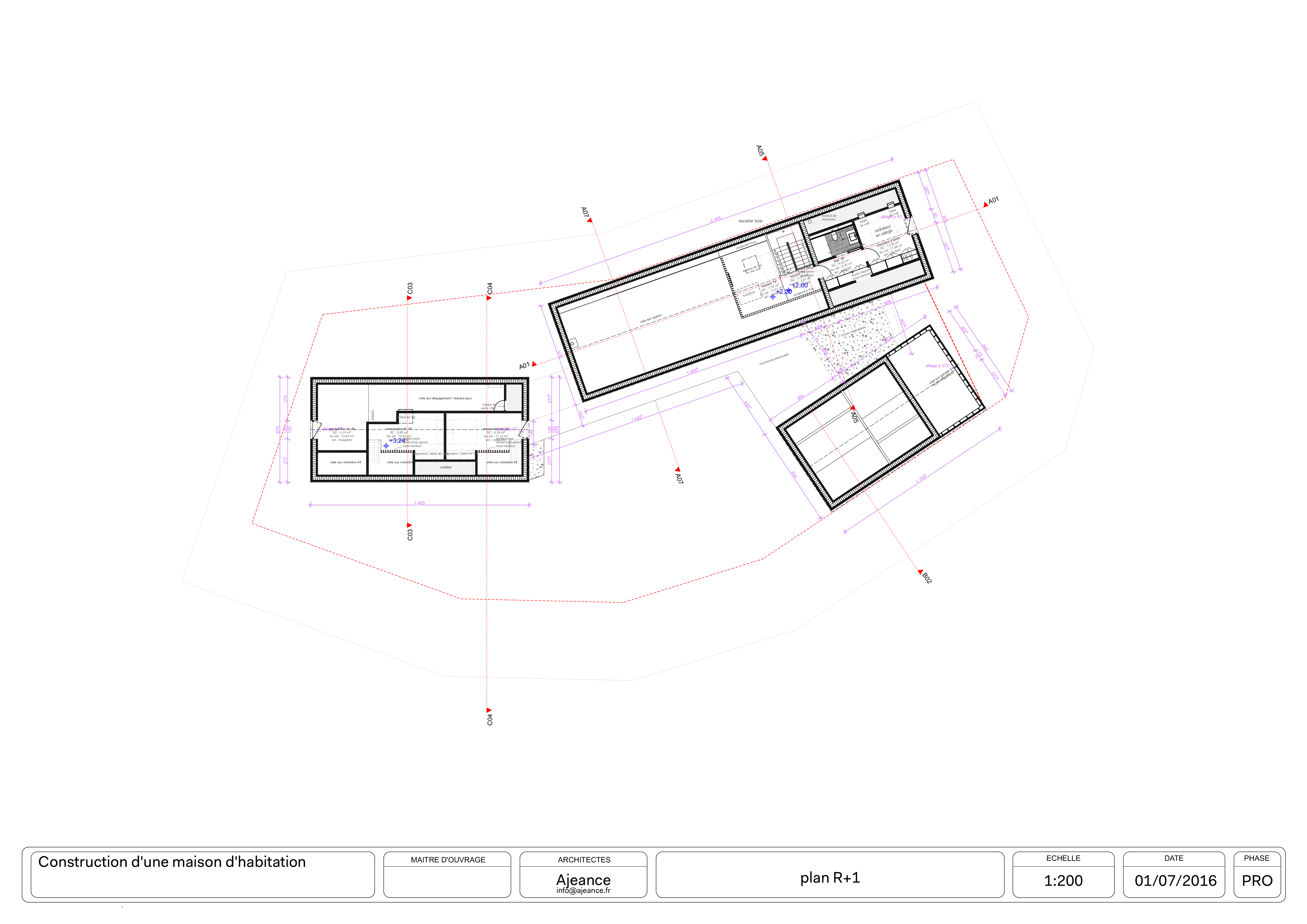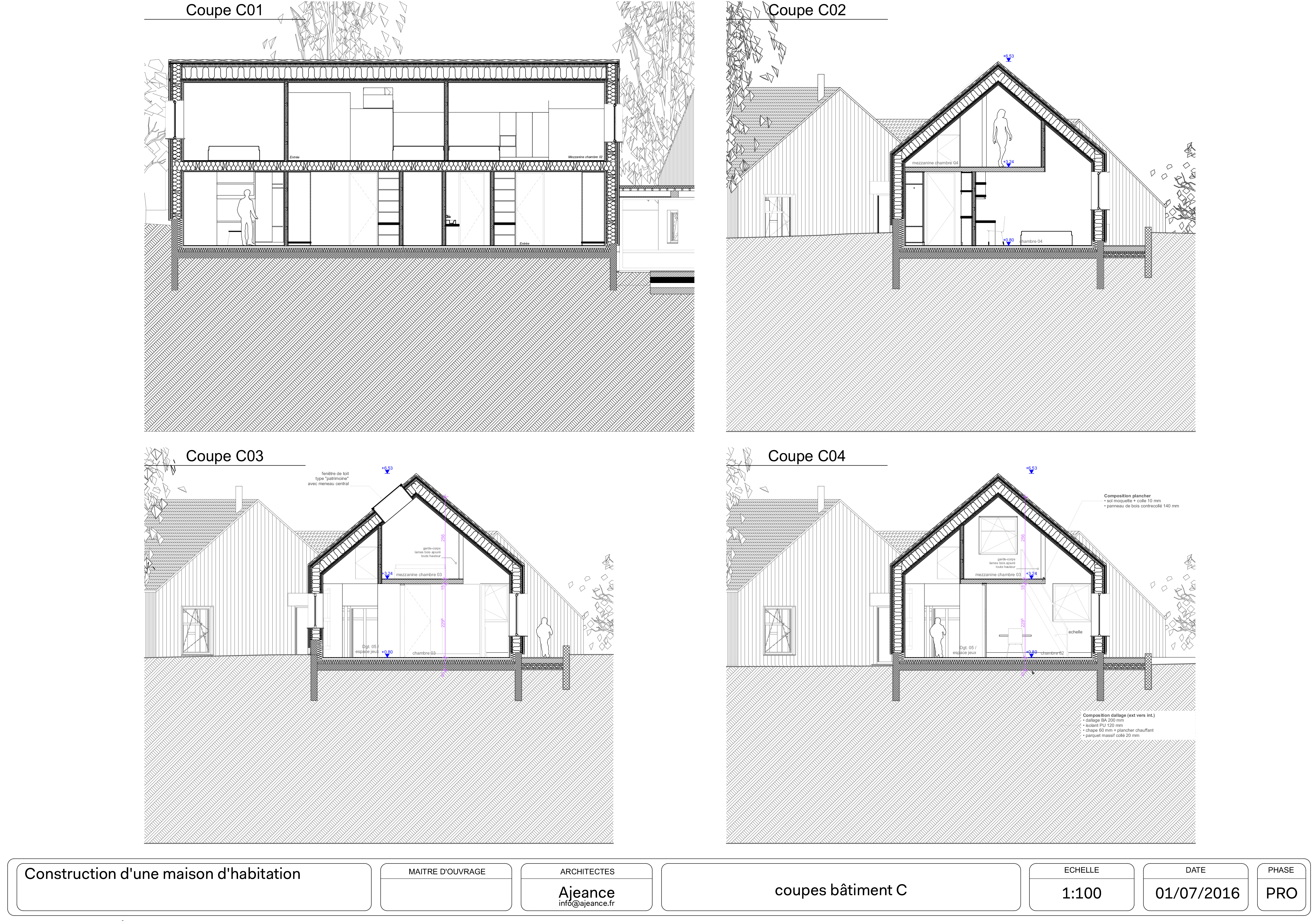 La maison d'habitation est répartie dans trois volumes longitudinaux, implantés autour d'un espace central extérieur, le tout épousant au mieux la topographie du terrain. Les trois volumes accueillent respectivement les pièces de vie dans le volume central, et de part et d'autre l'espace des parents et l'espace de enfants. Au delà de la qualité des espaces, l'enjeu du projet réside dans le respect d'un certain aspect patrimonial revisité, qui permet une intégration optimale dans l'environnement pavillonnaire rural.