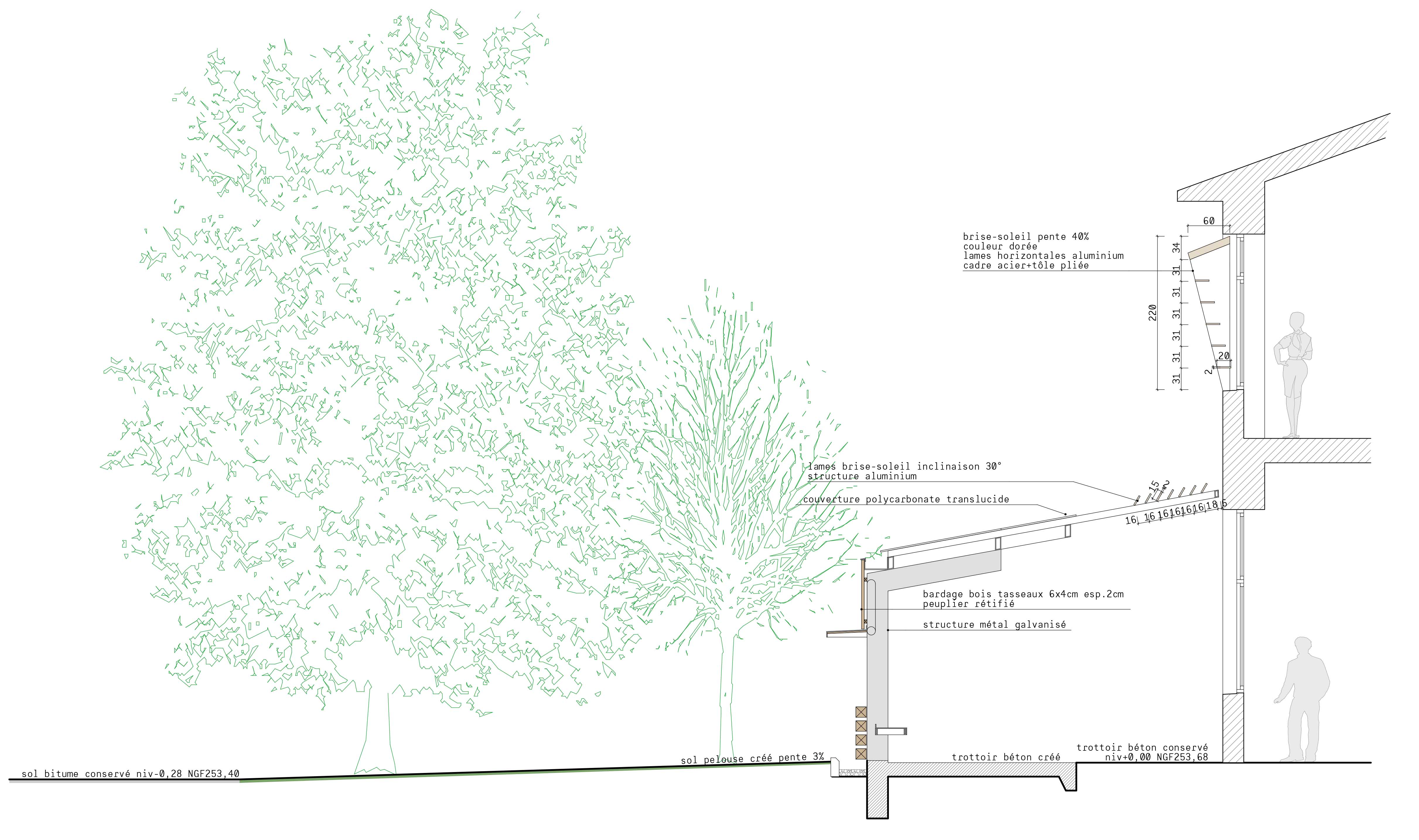 Descriptif technique : L'ossature de l'ouvrage est en acier galvanisé. Les bardages, les sous faces de couvertures et l'assise des bancs sont réalisé en peuplier rétifié. L'écran est constitué d'un bardage ajouré de tasseaux verticaux de peuplier rétifié de section 6x4cm espacés de 2 cm. Le socle est un empilement de pièces de bois massives et horizontales auxquelles est fixé un banc filant. PEFC (Gestion forestière durable)