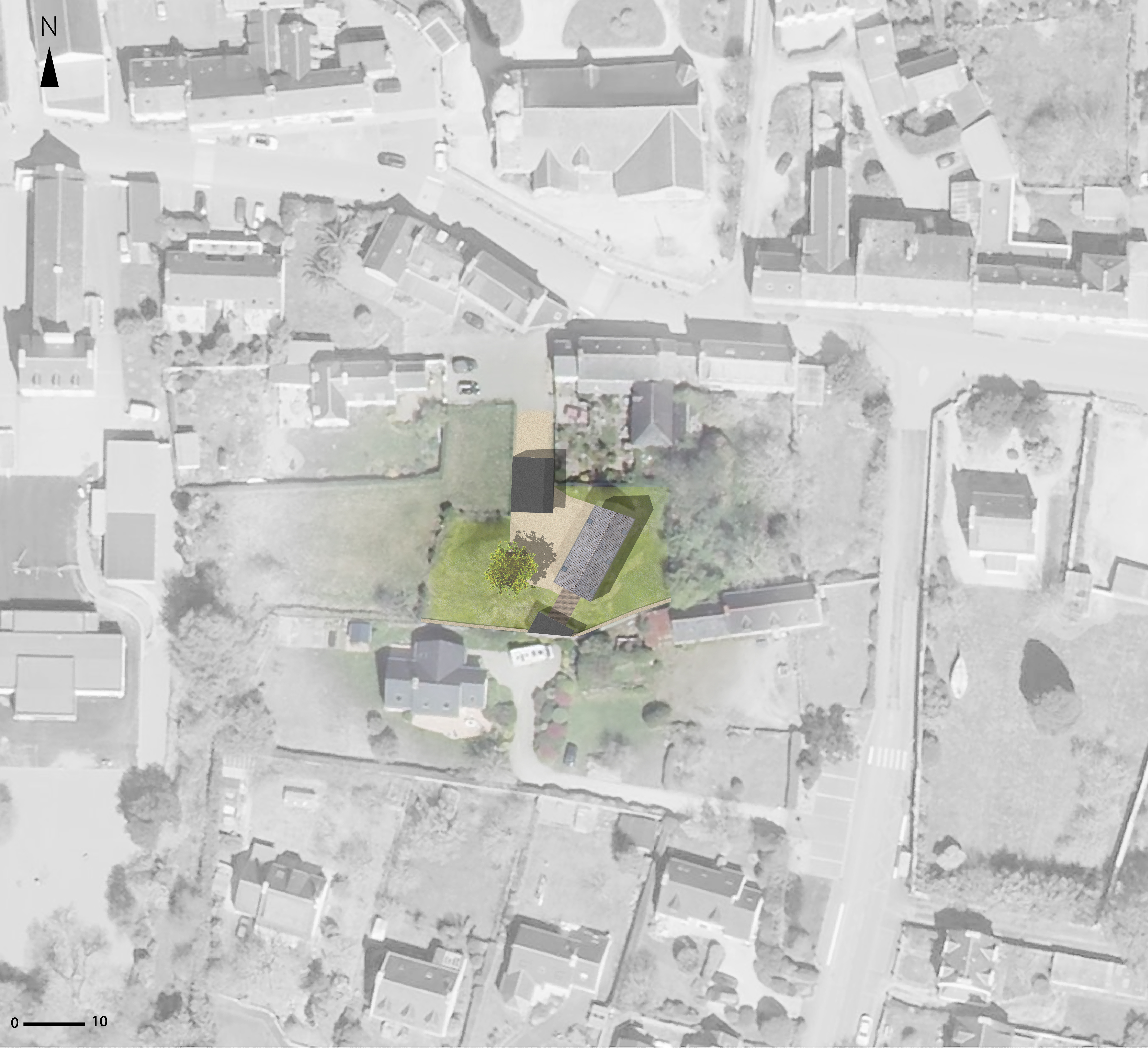 Desservie depuis la rue du bourg par une étroite allée, la parcelle s'installe au cœur d’un d'îlot mêlant jardins et habitations. La propriété se compose de 3 volumes en bois dessinant une cour ponctuée d'un beau saule pleureur. Reprenant le volume de la longère, la maison est entièrement bardée et couverte en bois. L'abri de jardin s'installe sur le mur de soutènement mitoyen et dans le prolongement de la maison, offrant une terrasse au séjour ouvert en pignon Sud. Le garage au Nord gère les entrées à la propriété et permet, grâce à ses façades ouvrantes, un accès vers la cour.