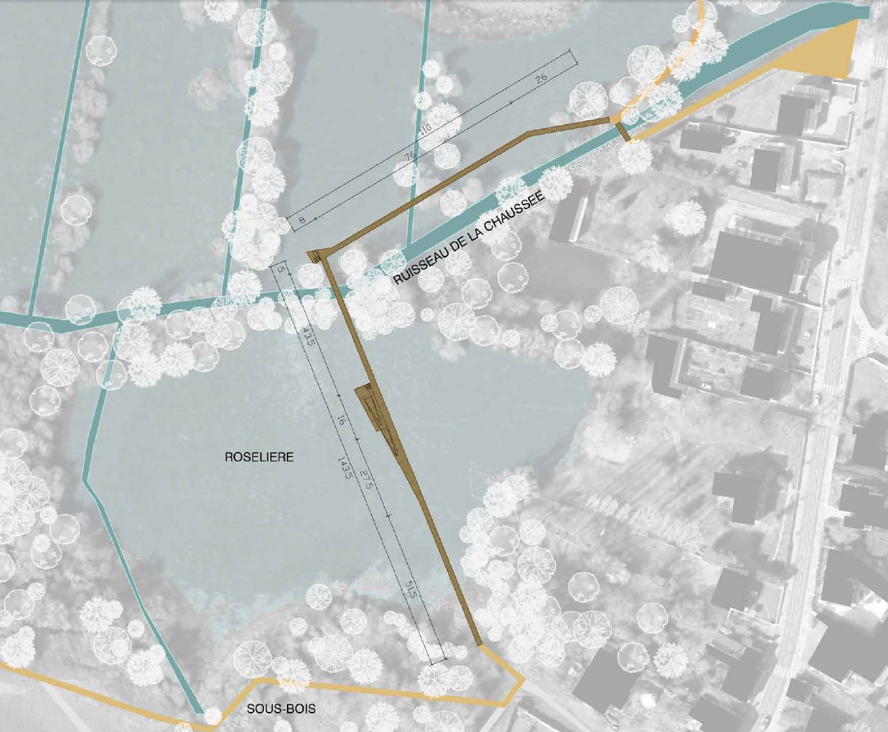 - Plateforme « embarcadère » à l'angle formé par les 2 sections, surface 27 m² y compris tracé courant.