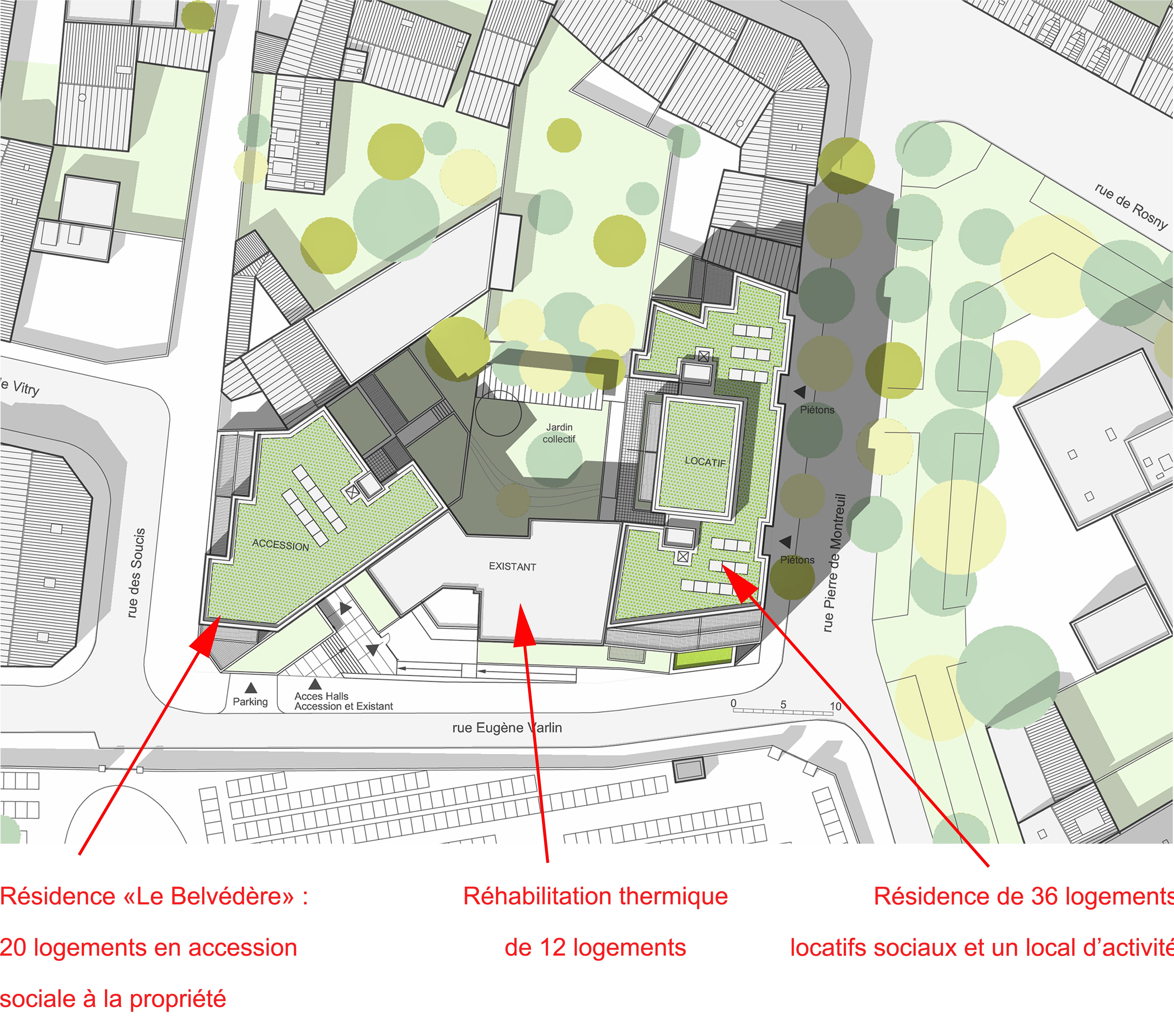 Approche environnementale : Une opération ECO-RESPONSABLE : La Ville de Montreuil et son office public de l’habitat ont porté très tôt, dès 2011, ce projet d’habitat durable alors pionnier en région parisienne. Lauréat de l'appel à projets BEPAS 2013 de l'ADEME, un suivi des performances est à ce titre prévu sur les trois années suivant la livraison. Il fait l’objet aussi d’une labellisation PASSIVHAUS en cours de finalisation avec La Maison Passive. Le projet a été retenu par les organisateurs de PASSIBAT 2018 et intégré au circuit de 3 opérations références en Ile-de-France.