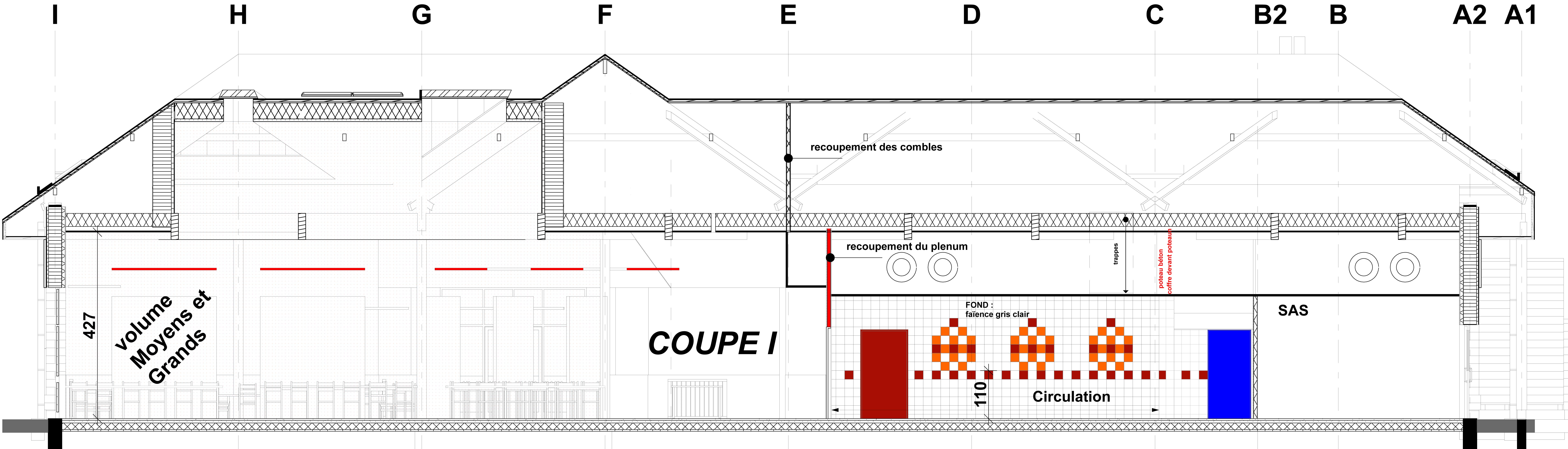Descriptif technique : La structure principale de type poteaux/poutres en lamellé collé est contreventée par des murs fermés constitués de poutre en I et isolés par de la ouate de cellulose. Les efforts de vent sont répartis sur les façades de 5m de haut et sur les quatre poteaux béton encastrés en pied dans la zone cuisine, par une résille formée par la charpente à toiture multiples constituée de fermes d'arêtiers / noues appuyées sur les poteaux béton, les façades et sur des poteaux pendulaires.