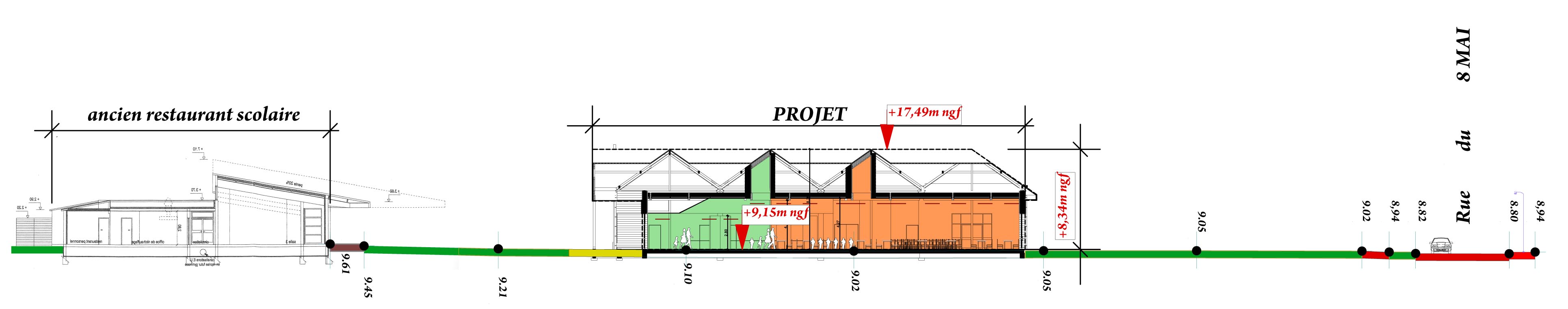 Il s'agissait de répondre par un équipement neuf au besoin de fabrication de repas pour 250 rationnaires à ALIZAY. La cuisine et tout son fonctionnement ont été associés à une ligne de self de distribution des plats destinée aux élèves du primaire de la maternelle et aux adultes. Le bâtiment de plain pied à Rdch est une construction à ossature bois, couverte à l'aide de sheds à 2 pans égaux orientés à 35°en ardoise. L'équipement est à 2 fonctions, les locaux accessibles au public d'un côté, les locaux de service, de fabrication des repas, de conservation des denrées de l'autre.