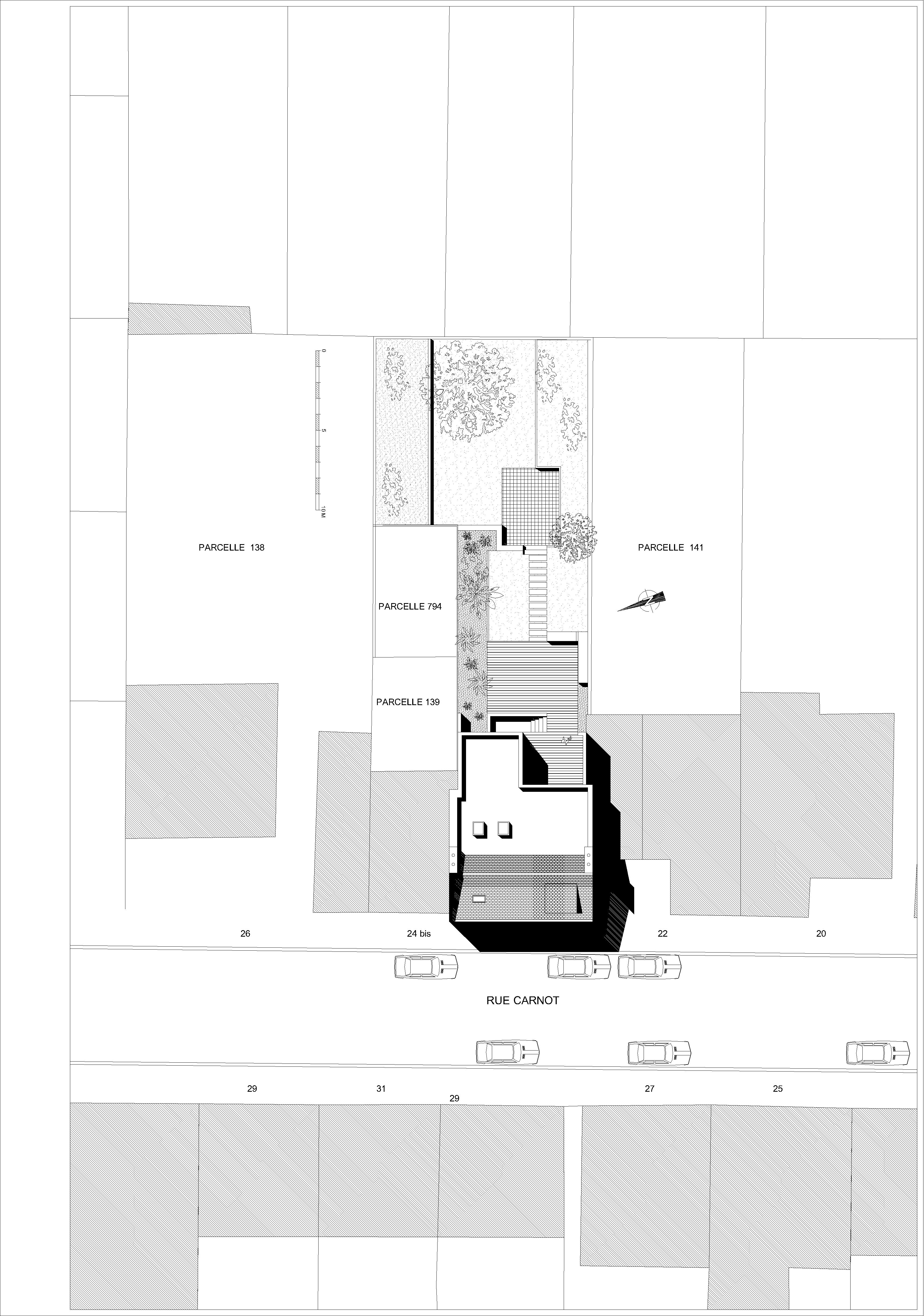 Approche environnementale : Pour permettre un rapport visuel permanent avec le jardin et l'apport passif d'une forte luminosité, l'élévation développe autant de transparence que possible. La façade agit comme une membrane de métal et de verre qui laisse à voir autant qu’elle permet de voir. La lisibilité des usages et la perception du paysage proche ou lointain se nuancent selon les étages. La terrasse et l'angle vitré du niveau haut permettent de capter une vue lointaine, quand le rez-de-jardin et l'entresol offrent une relation plus directe avec le jardin