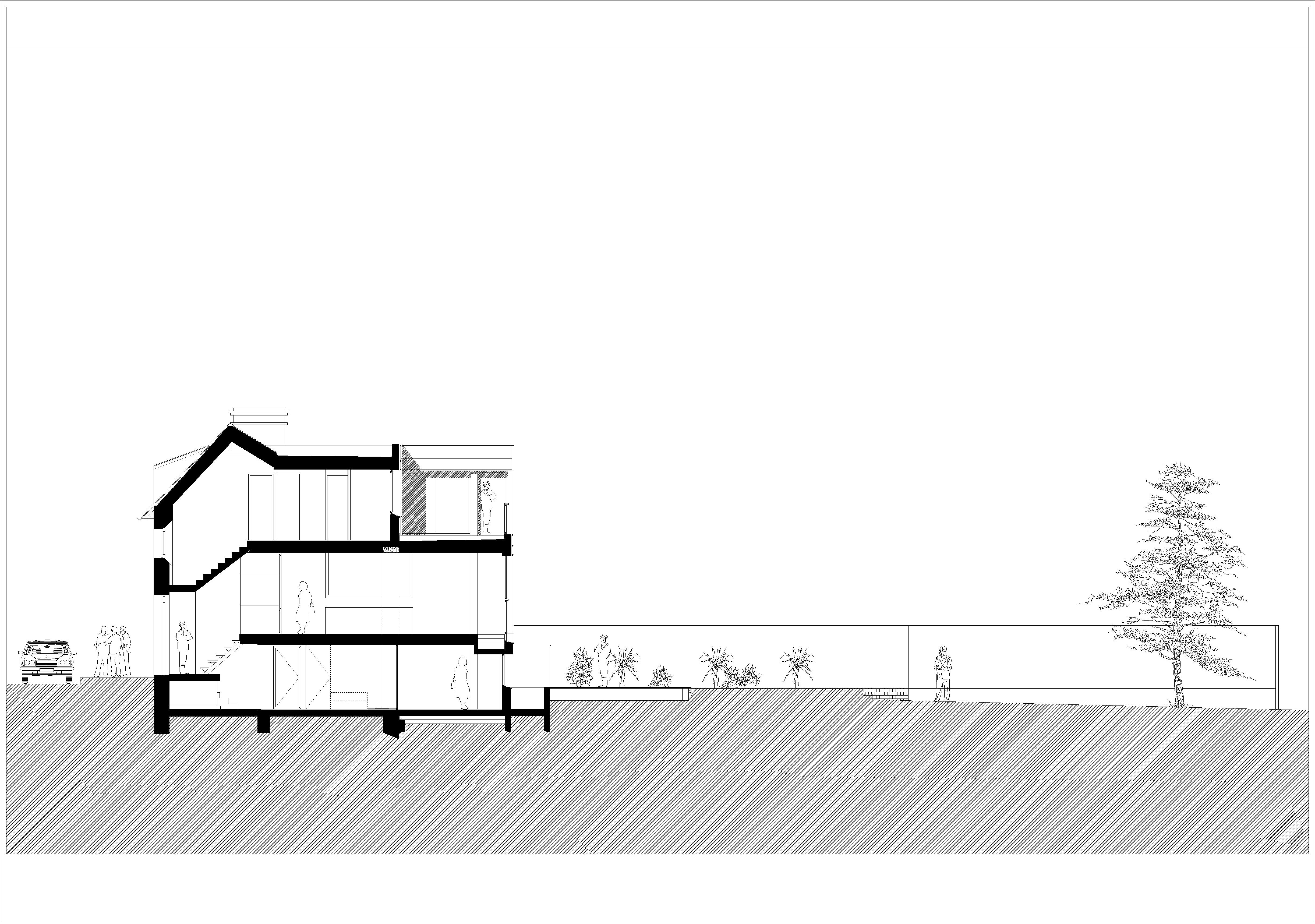 Située à Rennes sur les hauteurs de la ville, l’extension se déploie côté jardin. La maison se dédouble grâce à un volume cubique. Pour permettre l'apport d'une forte luminosité, l'élévation développe autant de transparence que possible. La lisibilité des usages et la perception du paysage proche ou lointain se nuancent selon les étages. La terrasse et l'angle vitré du niveau haut permettent de capter une vue lointaine exploitant ainsi le point de vue stratégique des hauteurs de la ville, quand le rez-de-jardin et l'entresol offrent une relation directe avec le jardin.