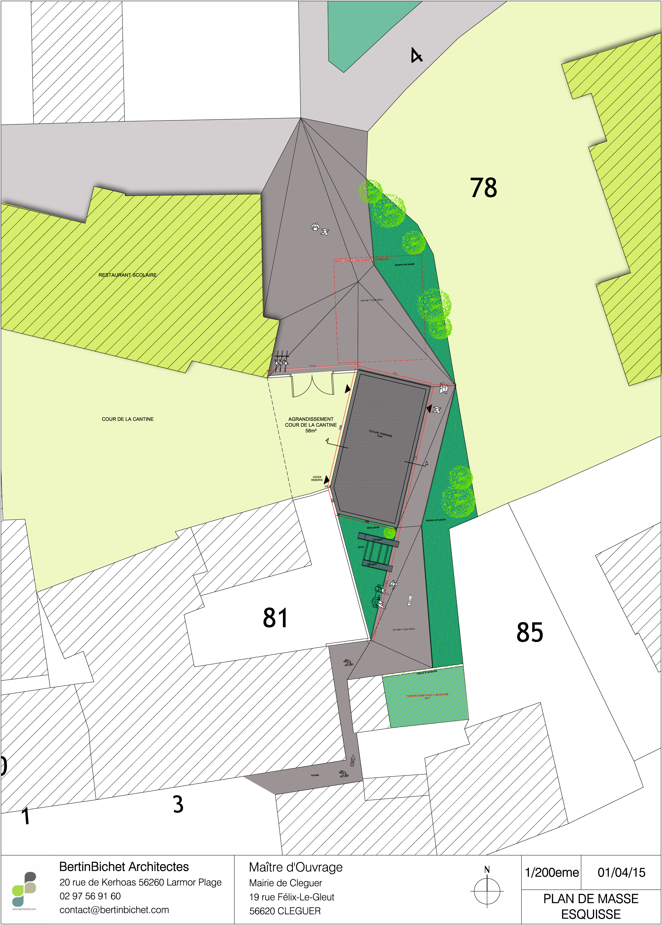 Approche environnementale : La nouvelle salle délimite les contours de la cours de récréation ainsi agrandie. Un petit local réserve donne directement dans celle-ci et permet le rangement des vélos et tricycles. La salle en elle-même, conçue comme un vaste parallélépipède rectangle en ossature bois, largement vitrée à l’Est et à l’Ouest, offre un cadre lumineux et chaleureux pour les activités variées des associations clégueroises, des TAP et de la garderie.