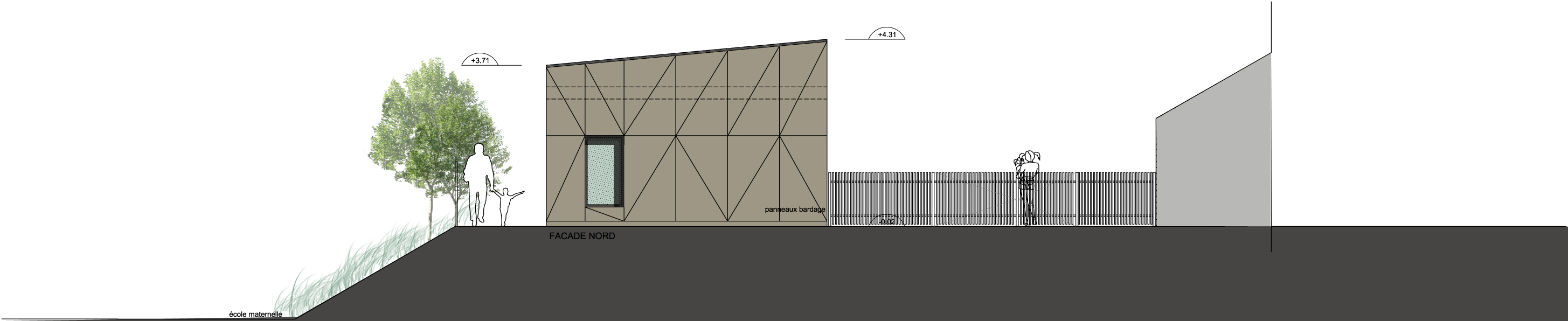 La nouvelle Salle de Loisirs Sans Hébergement souhaitée par la ville endosse une double caquette. Son implantation même doit régler plusieurs problématiques de l'espace publique qui enceint l'école, la cantine et la garderie. La création d'une venelle depuis la place du Puits redistribue les cartes de la circulation piétonne pour accéder à l’école maternelle ainsi qu’au lotissement un peu plus loin. Ainsi la Salle L’imaginaire s’implante sur l’espace central entre les différents équipements et hiérarchise des espaces dédiés : un parvis d’accueil au nord, un petit jardin planté au sud.