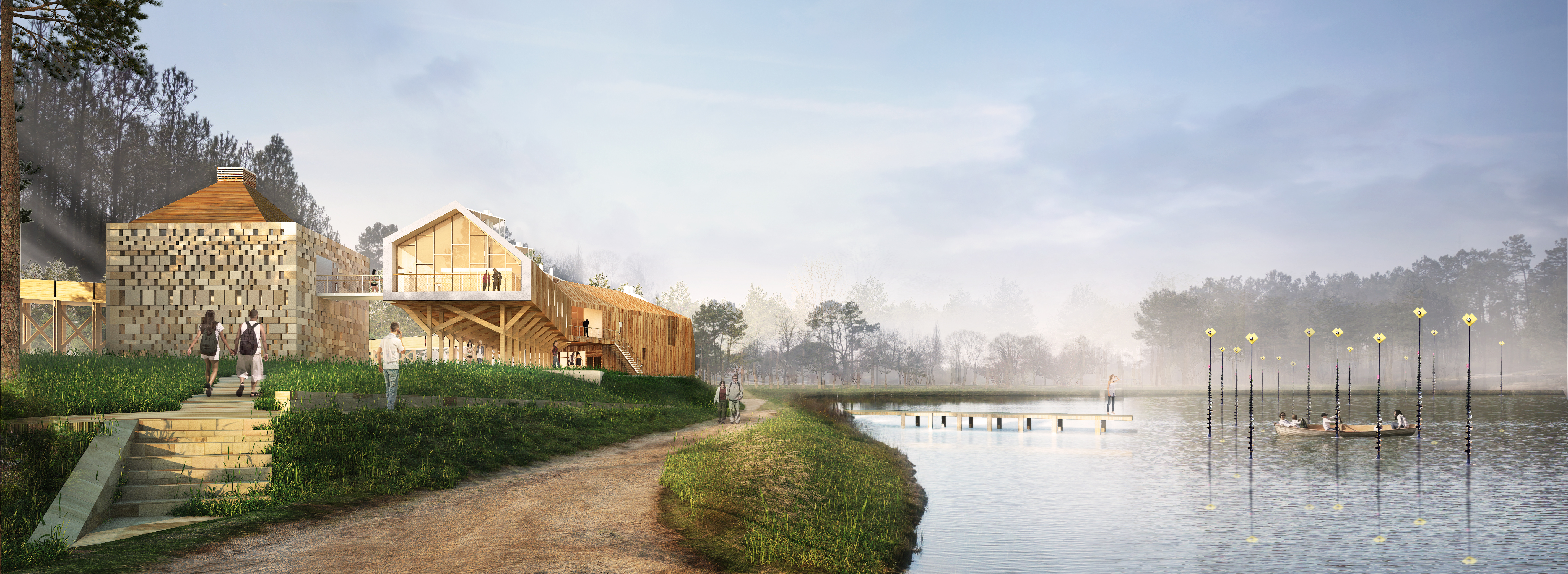 Approche environnementale : La proximité des zones Natura 2000 implique une conception particulière, sensible à l'environnement du parc et de ses constructions. Le projet profite des aménités forestières en limitant les impacts sur le milieu naturel. Les points ci-dessous sont en particulier développés: - Chaudière bois (approvisionnement local) - Ventilation totalement naturelle (Ventialtion Naturelle Assistée et Contrôlée), sanitaires compris - Bâtiment tout bois : structure, isolation, bardage - Toilettes sèches pour le parc - Eau chaude solaire - Matériaux locaux : pin maritime et pierre d'Avy