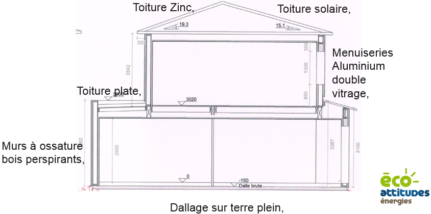 Descriptif technique : La maison a été conçue selon le label passif du PHI (Passiv Haus Institut). Sa consommation énergétique est réduite (10 kWhef/jour en consommation réelle). Le confort thermique est optimal, la régulation des apports solaires se faisant par un système domotique, la VMC double flux permet de répartir la chaleur, faire le complément de chauffage, produire l'eau chaude et assurer la qualité d'air intérieure. 9 kWc de panneaux photovoltaïques permettent de produire 2.5 fois l'énergie consommée rendant la maison à énergie positive. La vente de l'électricité permet de réduire les charges à 0€/an. PEFC (Gestion forestière durable) NF Parquets