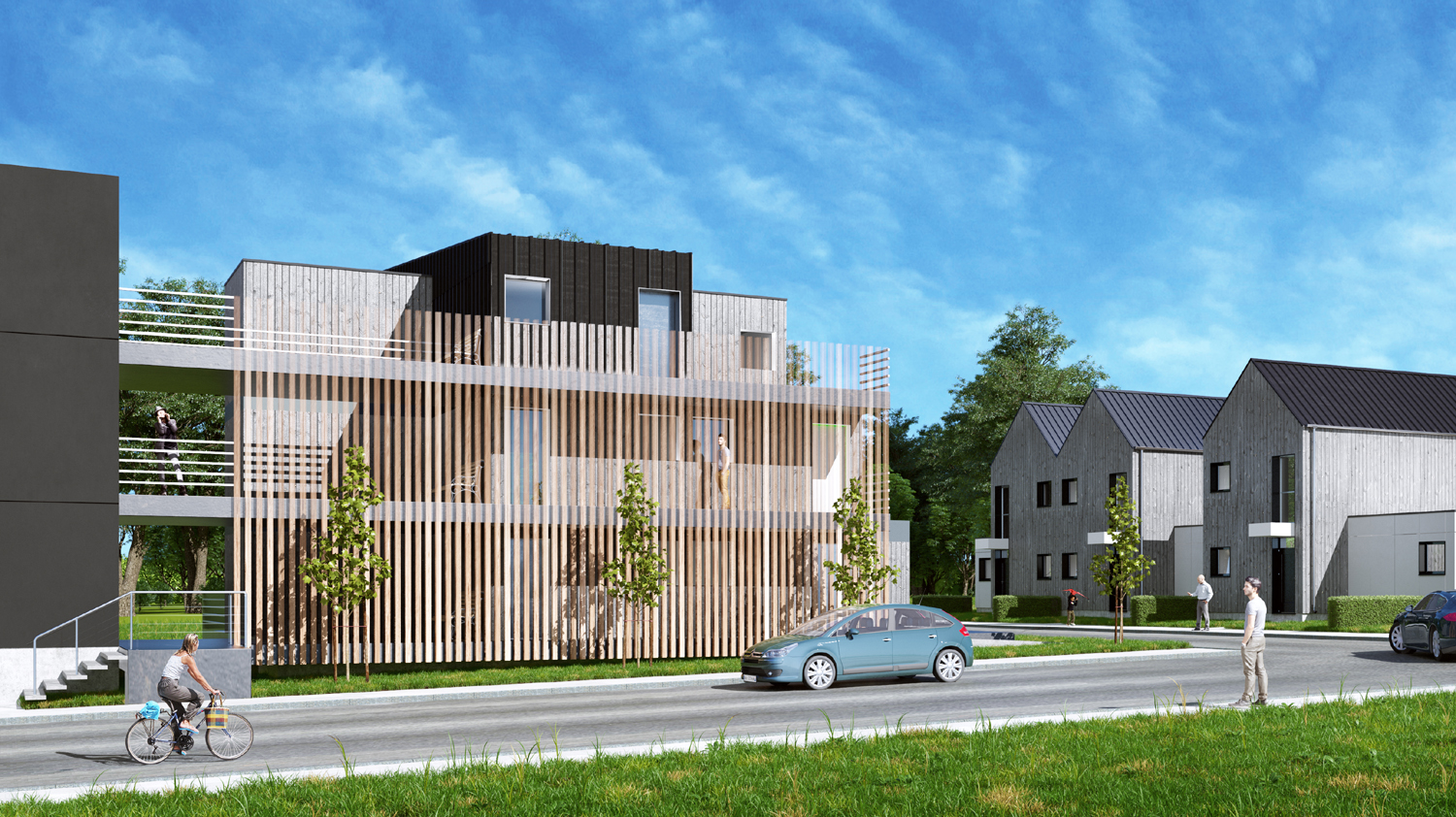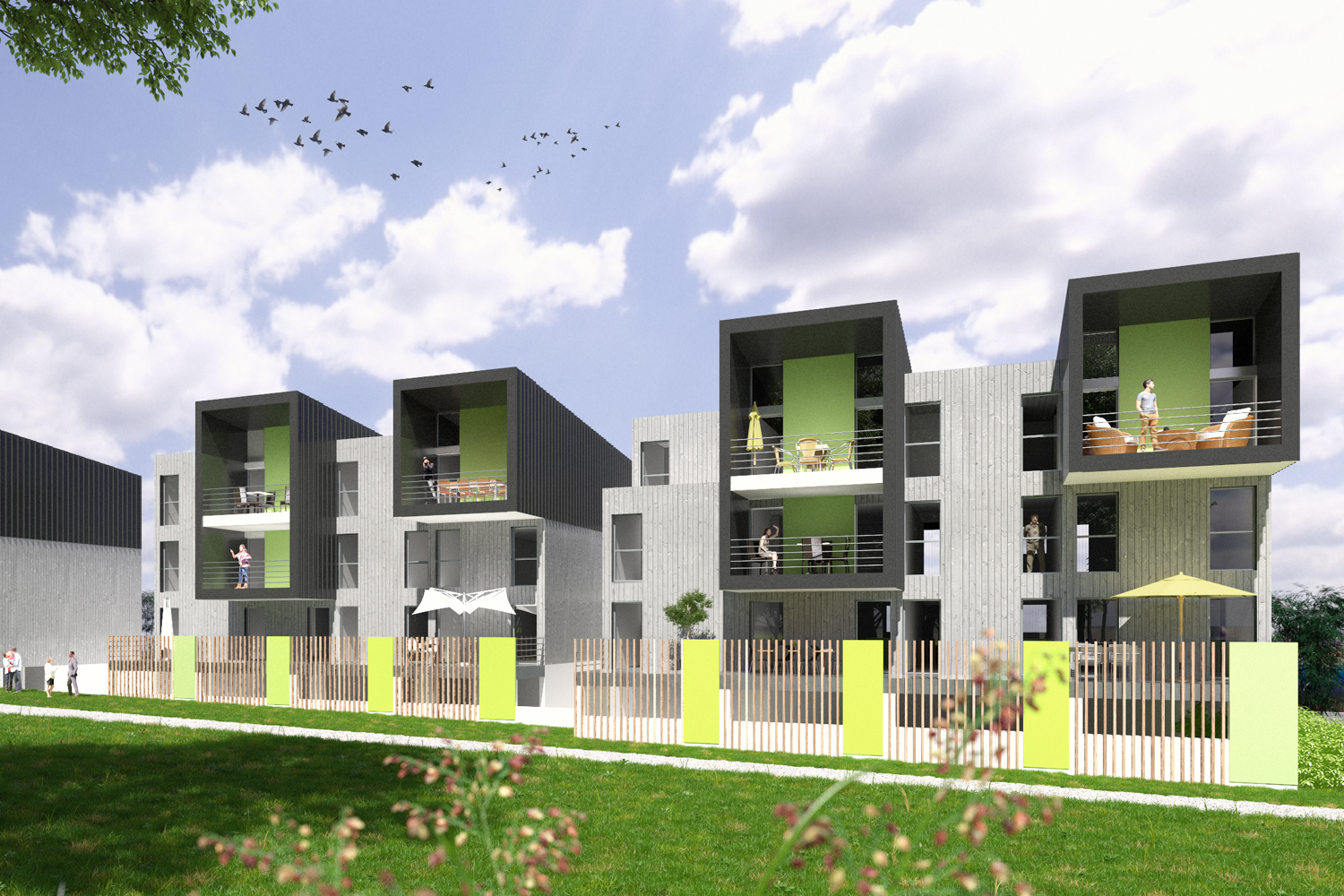Approche environnementale : Par sa compacité, son organisation et ses choix constructifs, ce projet atteint des performances thermiques élevées avec un niveau RT.2012 - 30%. Ce bâtiment est la première opération de logements collectifs certifiée par le label E2C1 en Sarthe dans le cadre de l’expérimentation menée par le Ministère du logement & de l’habitat durable et le Ministère de l’environnement, de l’énergie et de la mer (loi de transition énergétique pour la croissance verte).
