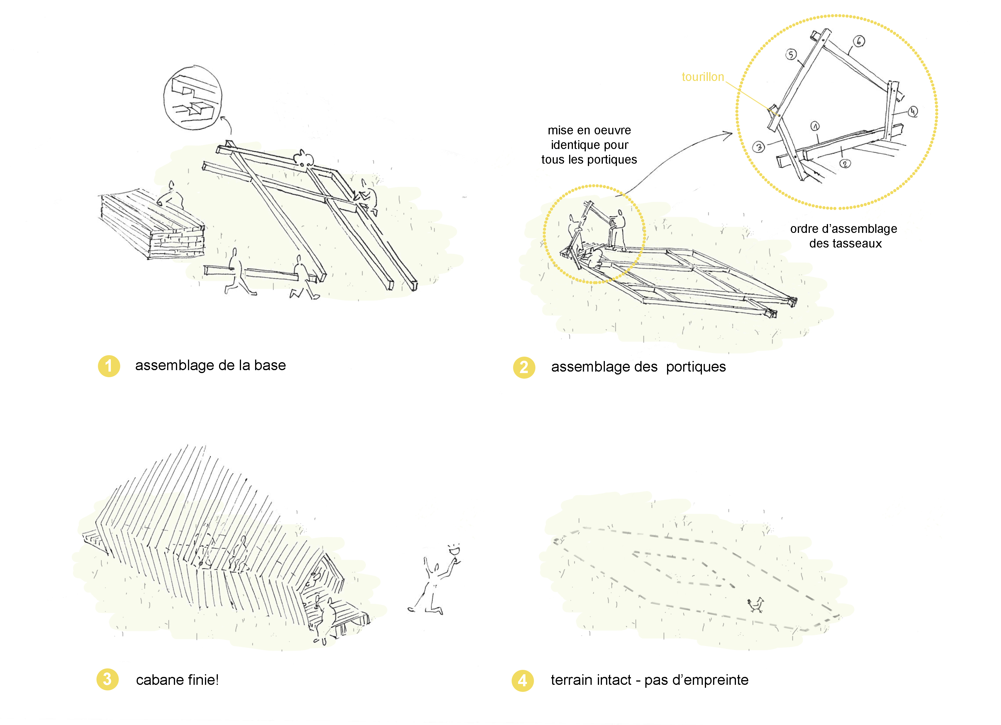 Le bois à servi la dimension sensible du projet par le clin d'oeuil à la « cabane », mais aussi la dimension concrète par la simplicité constructive. La structure simple exploite la répétition d'un élément : le tasseau bois, toujours mis en œuvre de la même manière.