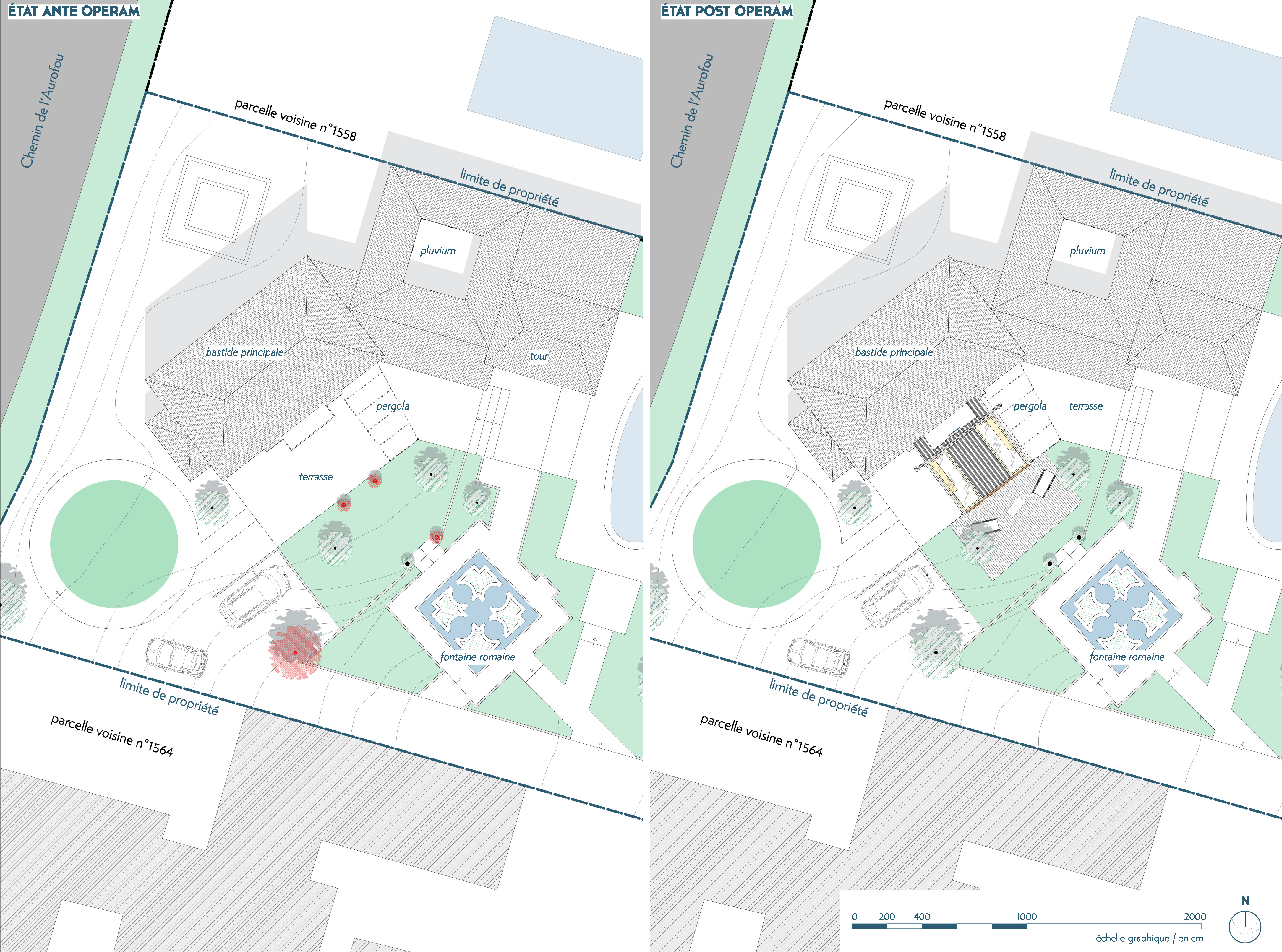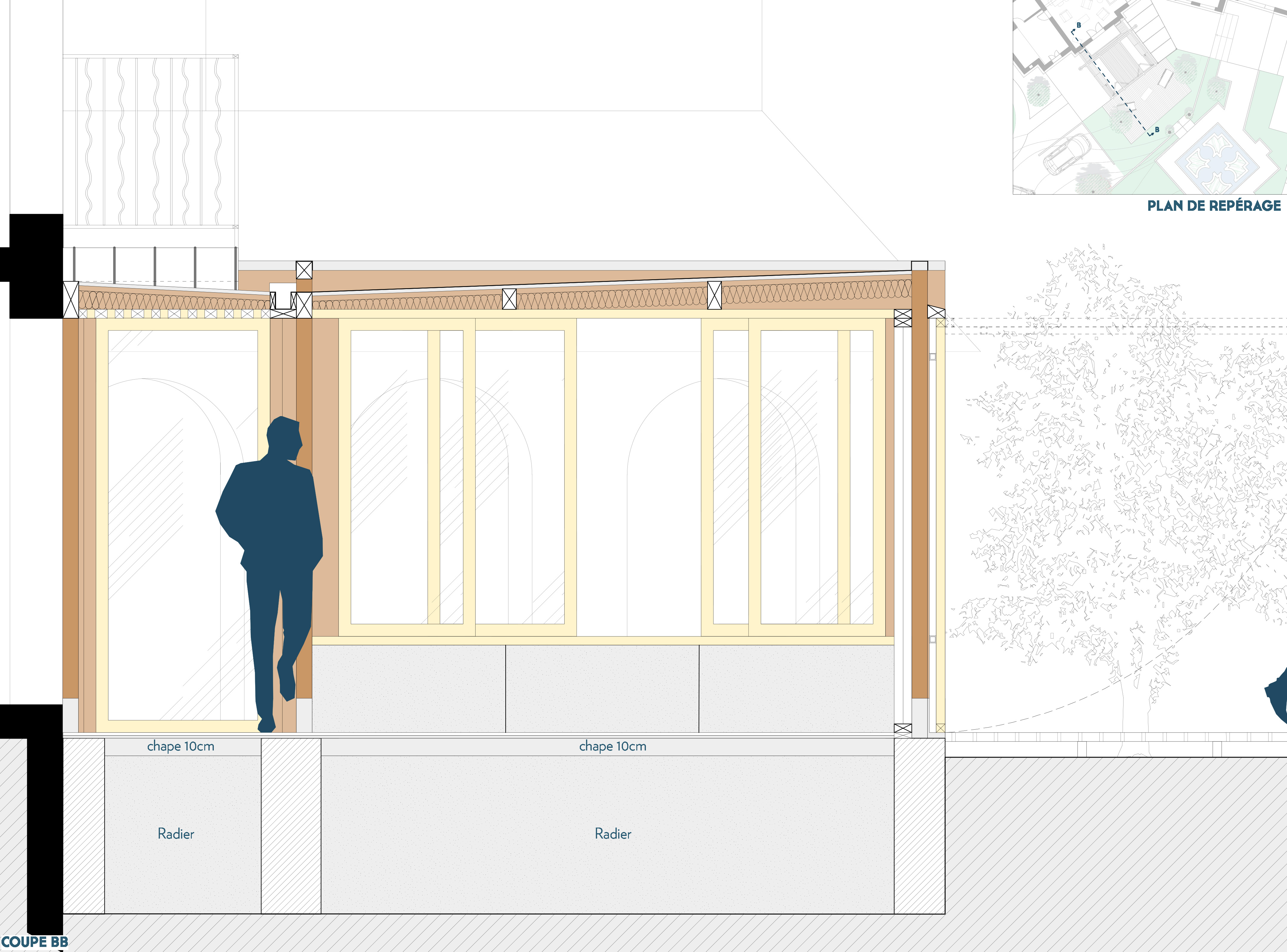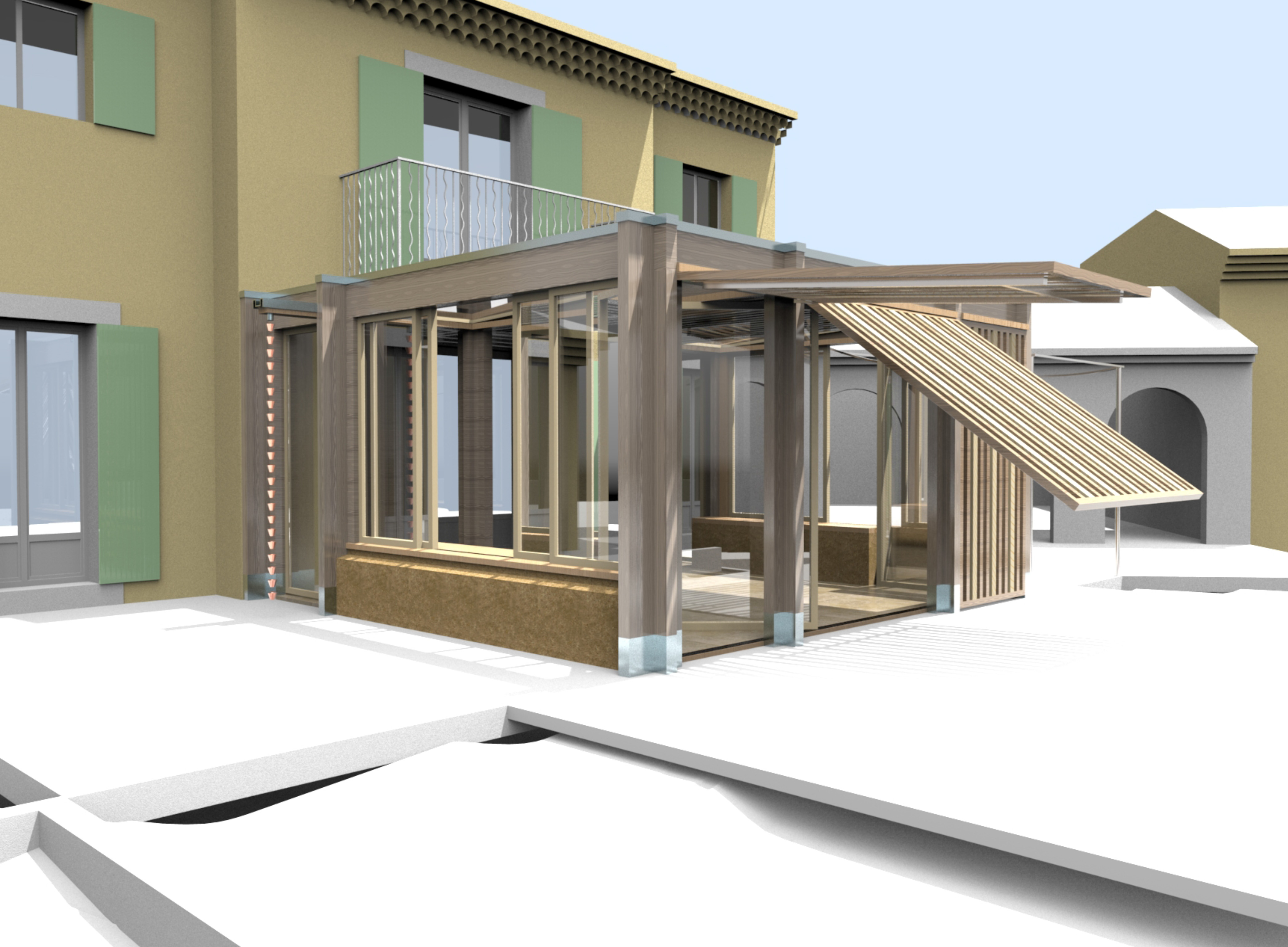 Approche environnementale : Le positionnement bioclimatique analysé préalablement à l’esquisse autorise aucune utilisation de système de chauffage/climatisation ajouté. L’extension en hiver avec ses grandes surfaces vitrées profite d’une exposition au infrarouges solaires (effet de serre contrôlé). Durant l’été, l’extension s’ouvrant quasiment totalement sur 3 de ses faces latérales, permet une ventilation naturelle grâce au sens du vent mistral Est/Ouest. Une prolongation des poutres bois pourrait permettre l'ajout de brise soleil. Cependant, cette disposition sera confirmée par le Maître d'Ouvrage lorsque le projet aura vécu sur un cycle complet d'une année. Vraisemblablement l'ajout ne sera pas nécessaire au vu de la végétation environnante qui porte ombre durant l'été. Le complexe de toiture terrasse possède simplement un renfort d’isolation biosourcée en fibre de bois.
