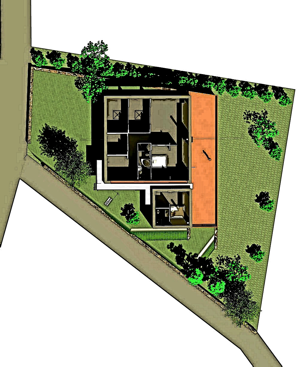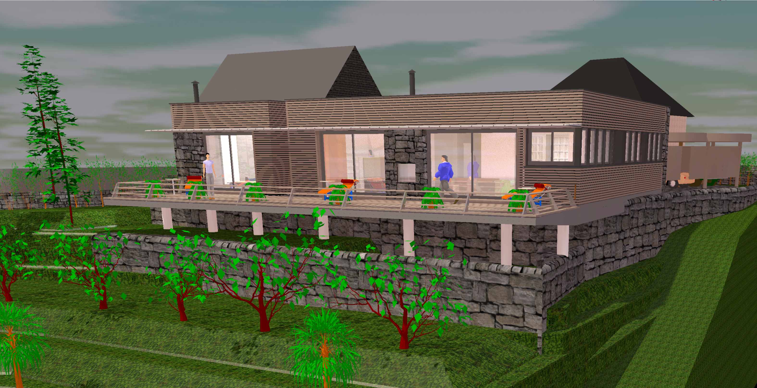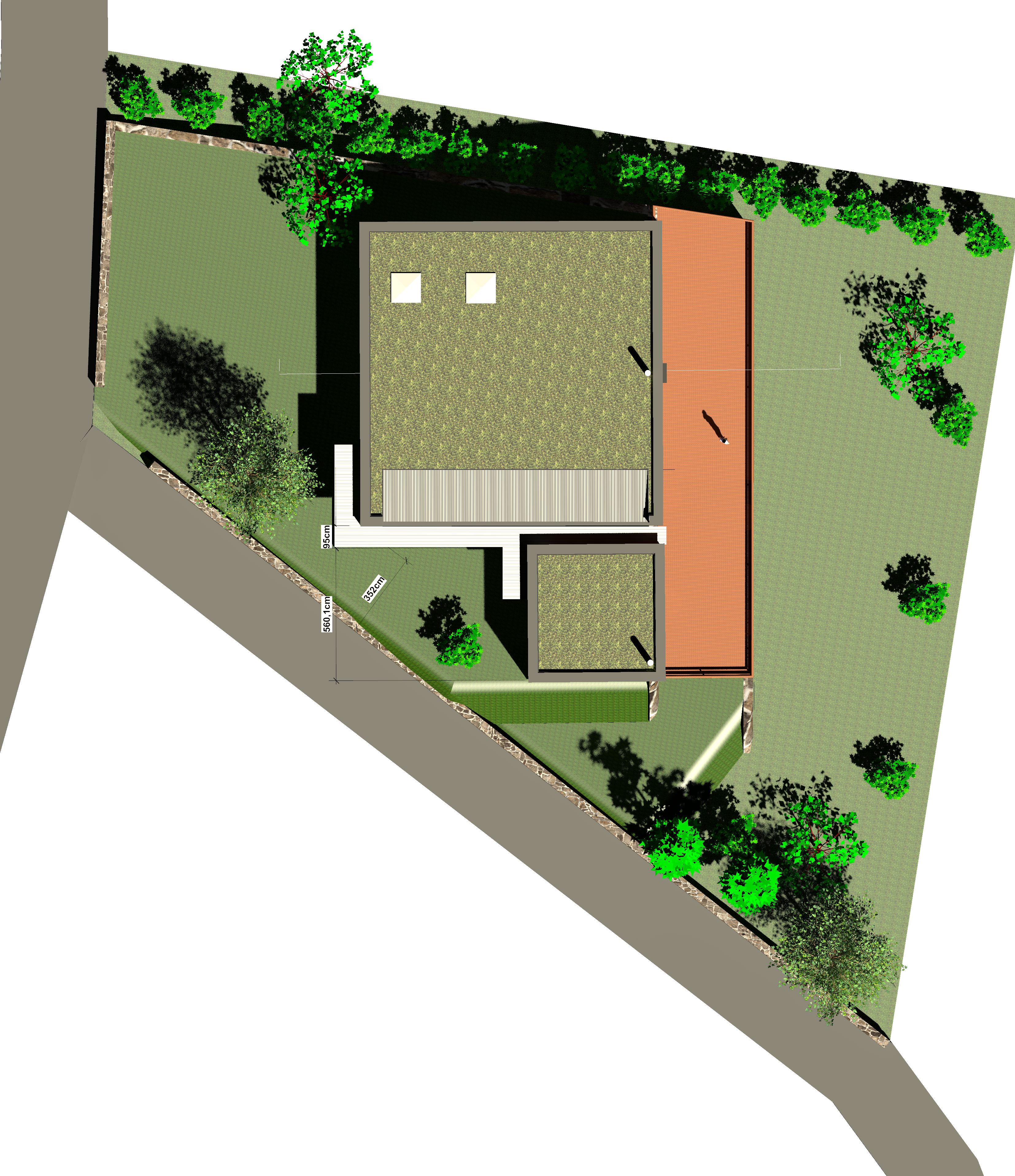 Descriptif technique : Cette maison est composée d’une toiture plate, végétalisée. La charpente et les murs sont en bois avec une isolation répartie. Les murs ossatures bois reposent sur des dalles bétons en porte à faux qui reposent elles-mêmes sur 23 micro pieux très profonds de 6 à 18m. Le tout repose sur un terrain en terrasses avec deux empierrements d'origine.