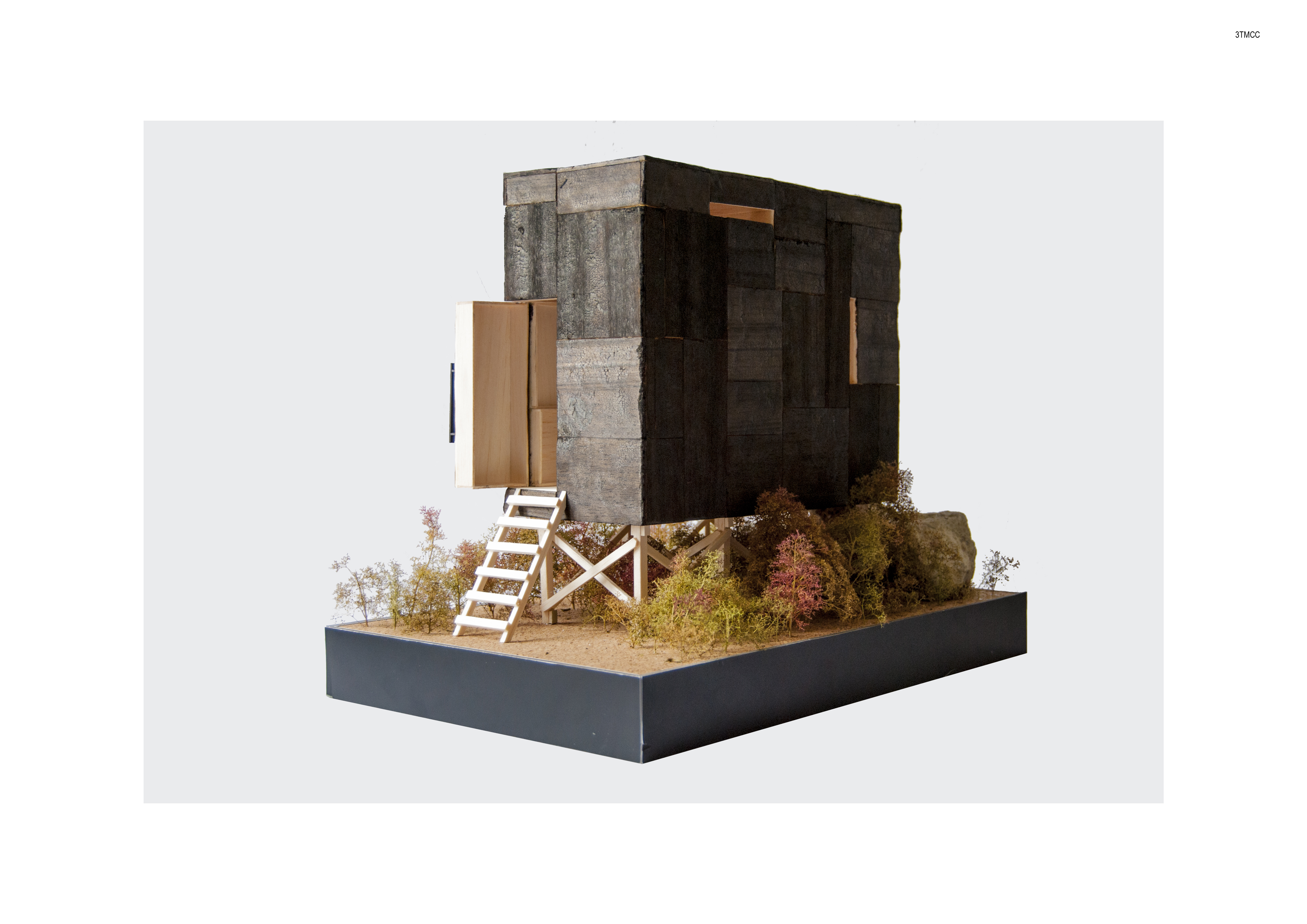 Le caractère éphémère de la cabane nous pousse à impacter le site au minimum. De ce fait, la cabane est constituée d'éléments préfabriqués: des «caissons» simplement composés d'un cadre, fermés sur une face par un bardage de planches. La face extérieure des caissons est brûlée afin d'assurer la protection du bois de façon durable et naturelle.La structure sur pilotis permet d'adapter facilement la construction au site et de conserver la végétation existante. Les caissons préfabriqués sont empilés depuis le plancher et assemblés entre eux de manière à former les parois et le plafond de la cabane. La dimension des éléments les rend facilement acheminables, montables et démontables dans le respect de la fragilité du site.