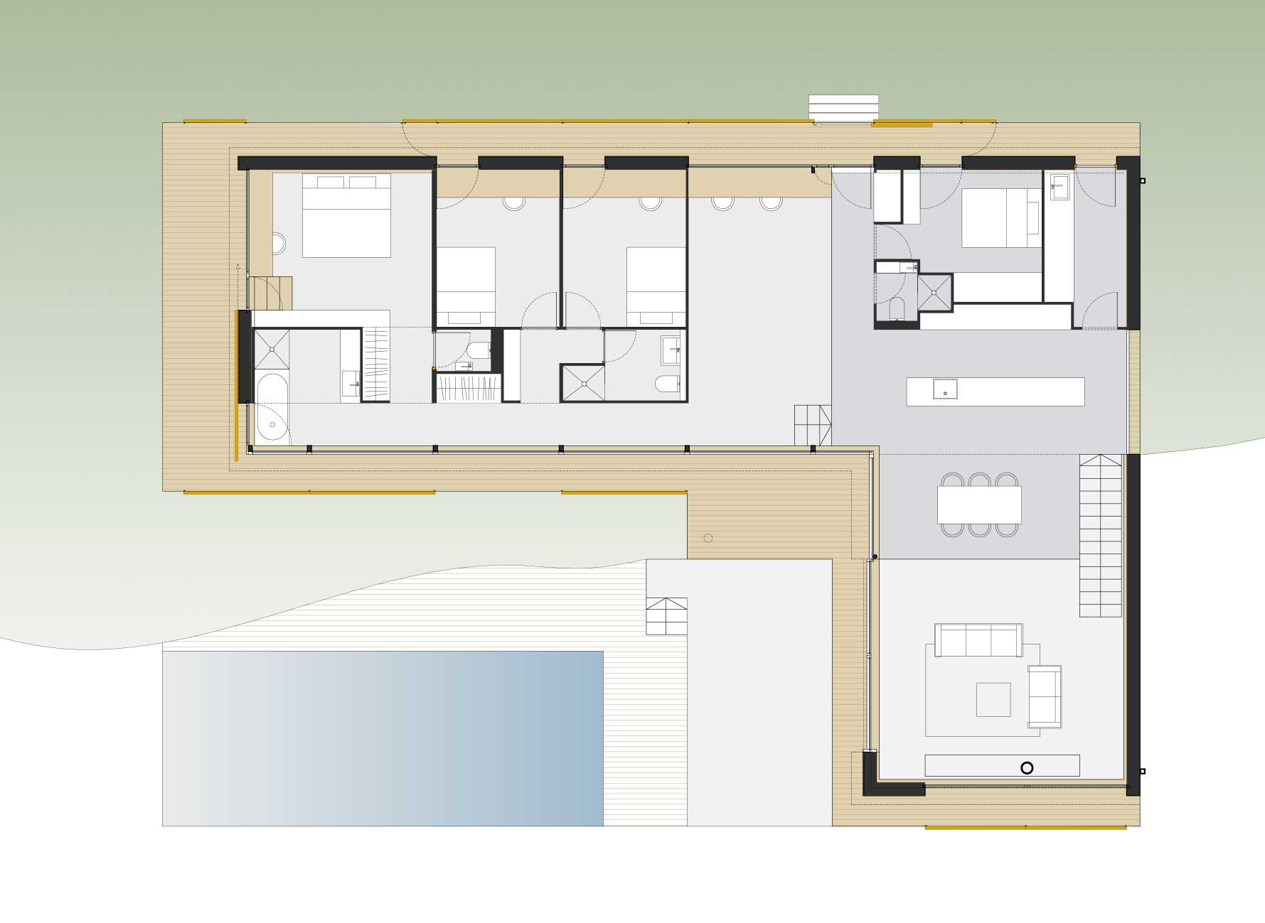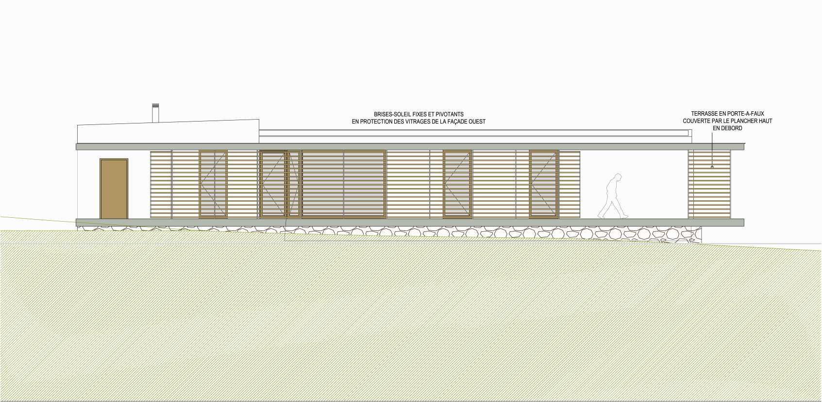 Approche environnementale : C'est une maison avant tout orientée. Le choix des matériaux et leur position ont été définis dans une recherche de confort passif : Recherche de l'inertie par un socle maçonné en béton banché doublé de pierre inscrit dans la sol; Confort thermique et hygrométrique par des murs et plafonds en panneaux CLT laissés bruts en intérieur et isolés par de la fibre de bois à l'extérieur; Triple vitrage doublé de brise soleil en protection pour toutes les fenêtres orientées Est et Ouest et prenant le rayonnement bas et rentrant du soleil; casquette large de protection pour les ouvertures au Sud.
