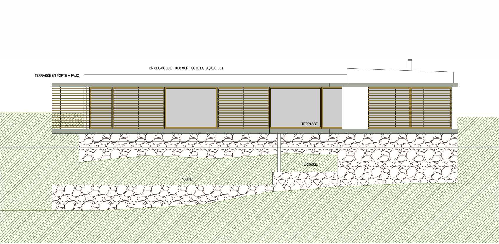 La maison est posée sur un terrain rocheux, en pente, orienté Est-Ouest. elle se modèle à ce relief tout en cherchant la meilleure orientation face à la course du soleil. Mais plus que tout, elle s'ouvre sur une vue englobant les vignes, les collines, le vieux Mérindol, le village et pleinement le mont Ventoux. La Vue est le fil conducteur qui accompagne en tout point dans la maison et qui justifie une baie vitrée de 23 m de long. Les matériaux sont utilisés bruts et leur texture naturelle crée le décors.