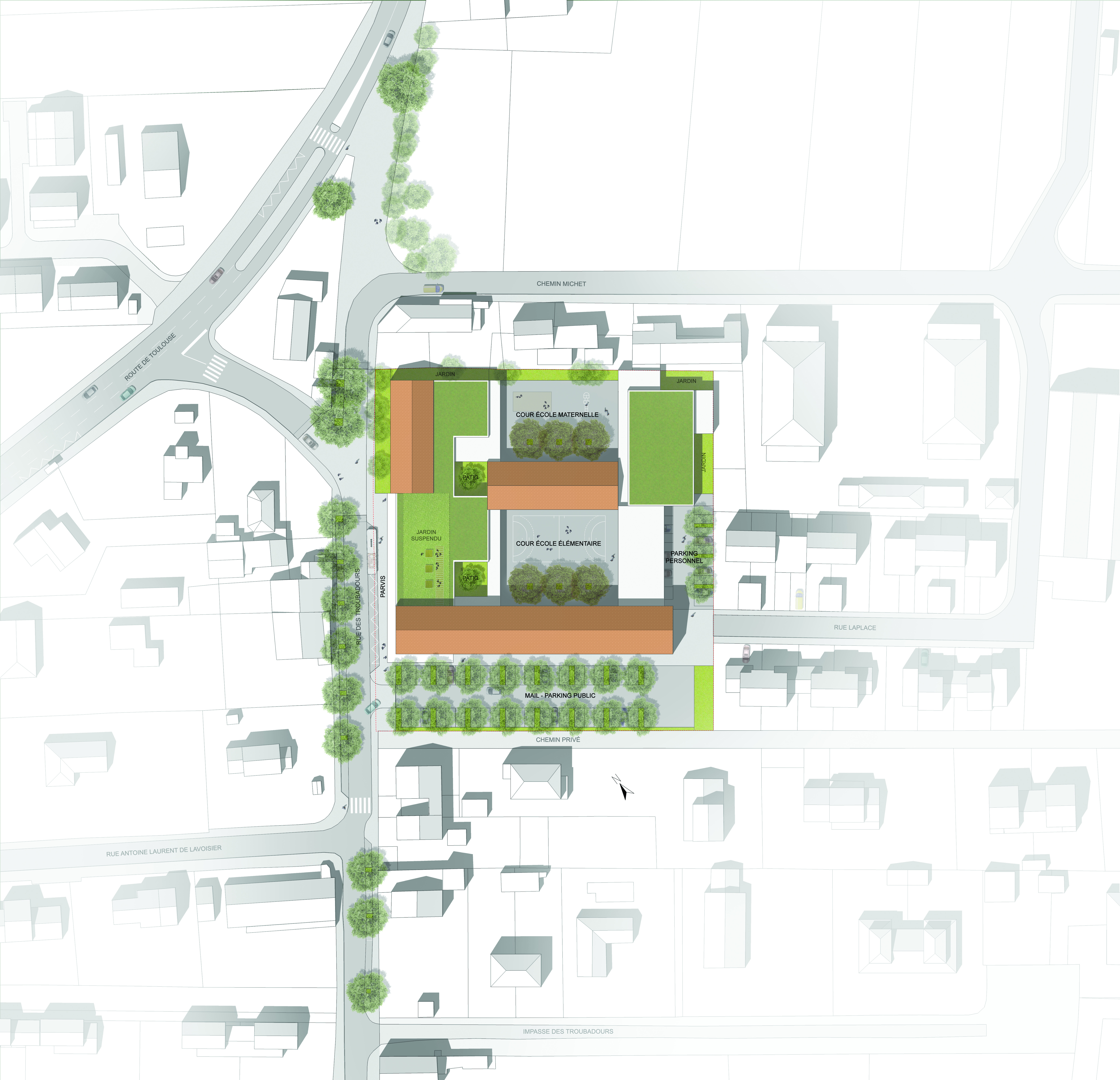 Approche environnementale : L’enceinte du groupe scolaire structure l’espace public. Son implantation permet la continuité entre la rue Laplace et la rue des Troubadours. Un mail planté assure ce lien en mettant à distance les habitations au Sud. Chaque entrée est identifiable depuis la rue. Elles sont toutes les trois liées par un auvent et mènent depuis les halls d’accueil sur deux patios. Ils sont des repères au cœur de l’établissement. Les circulations sont éclairées naturellement et volontairement surdimensionnées pour accueillir des usages multiples. Les salles de classes sont orientées au Nord et sur les cours.