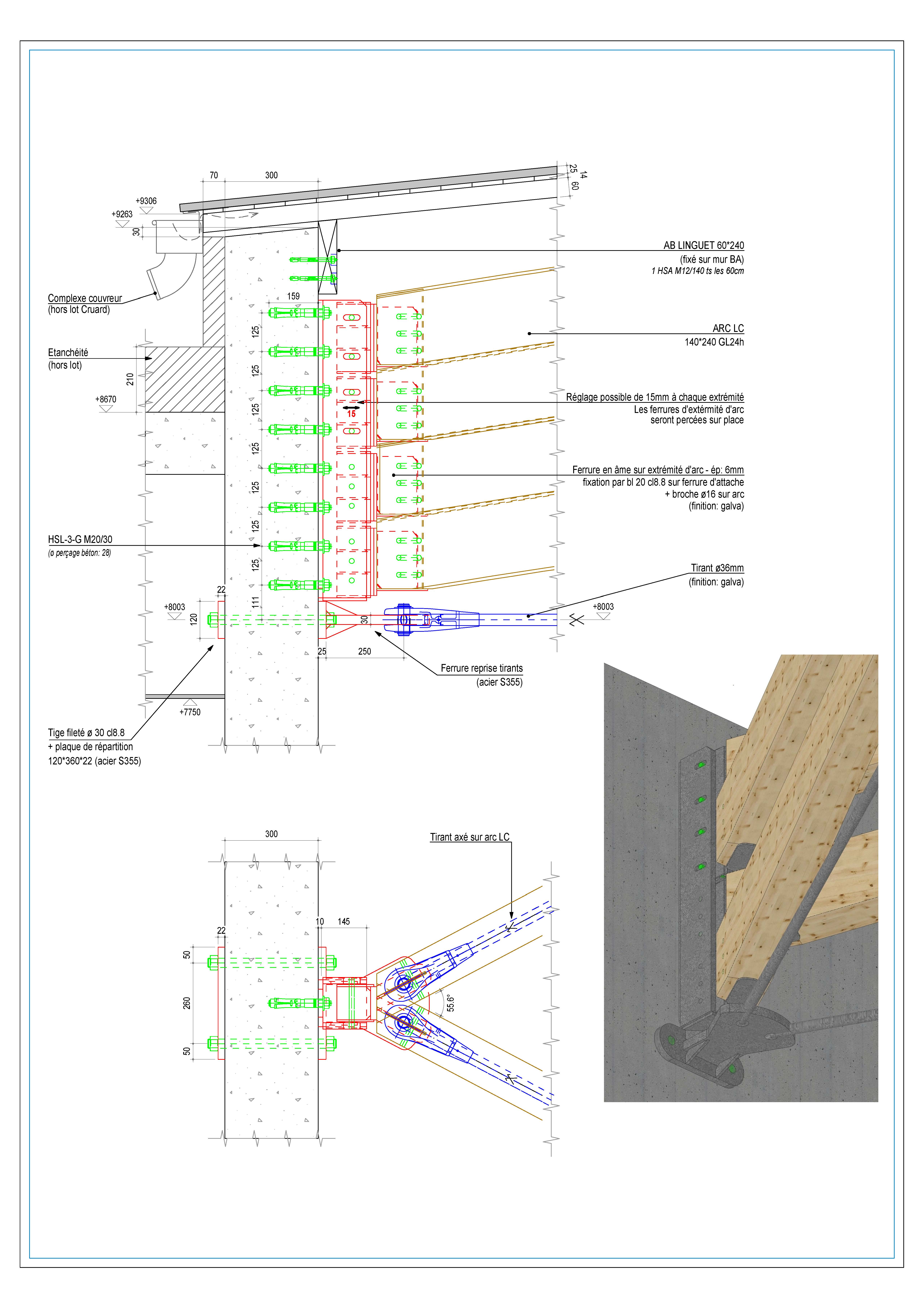 Descriptif technique : La charpente réalisée couvre le volume central de la Médiathèque. La surface couverte est de 17m x 34m. Cette charpente est composée d'un entrelacement croisé de poutres courbées en lamellé-collé sur 4 épaisseurs. Ces poutres bois sont fixées aux poutres béton périphériques par des ferrures verticales travaillant également à rigidifier verticalement les poutres béton. Des tirants métalliques sont fixées en partie basse de ces ferrures pour compenser la poussée horizontale du plan de toiture. Les espaces entre poutres sont largement occupés par des ouvertures de lumière et de désenfumage.