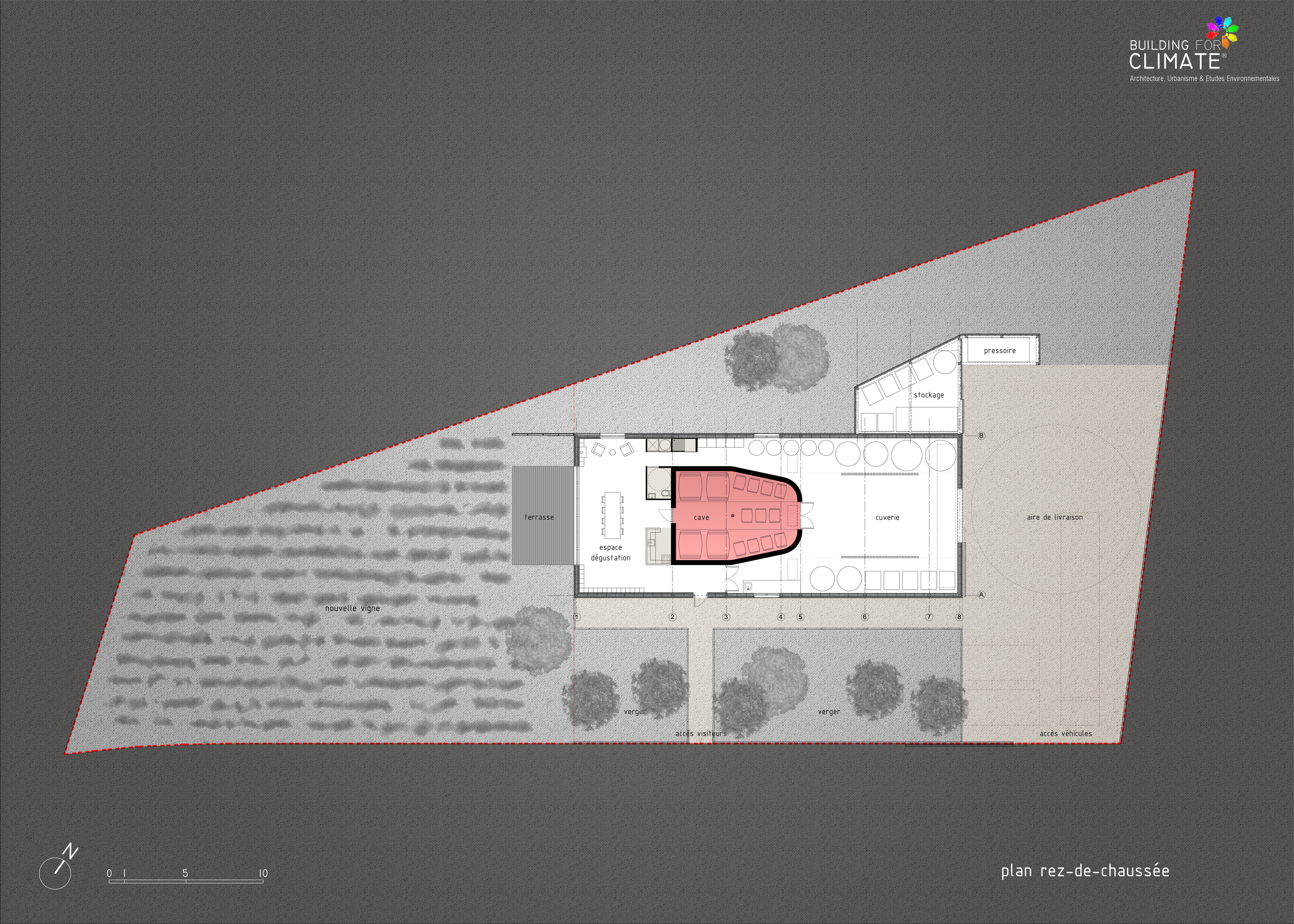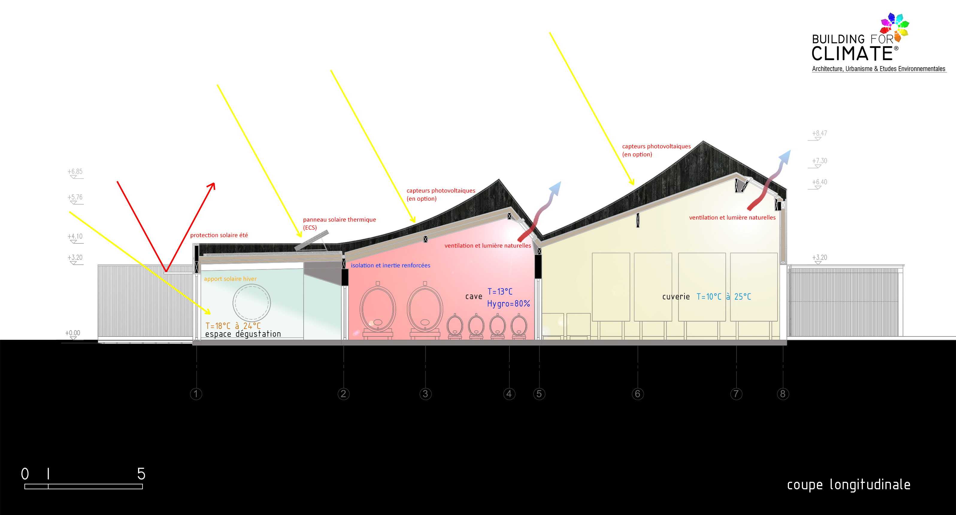 Descriptif technique : L’utilisation majoritaire d’éléments préfabriqués a permis une mise en œuvre rapide et précise. Les murs sont en ossatures bois, la charpente en poutre BLC de 10m de portée. La toiture est constituée de panneaux sandwichs bois « Sapisol », recouverts d’une membrane d’étanchéité dont une partie est végétalisée. Orientées au nord, trois fenêtres de toit et une large verrière apportent la lumière intérieure nécessaire aux activités de vinification. Les murs intérieurs de la cave en brique permettent le contreventement de la structure. Les menuiseries extérieures sont en bois. Un capteur solaire produit l’eau chaude sanitaire. Les eaux de toitures sont récupérées par une citerne.