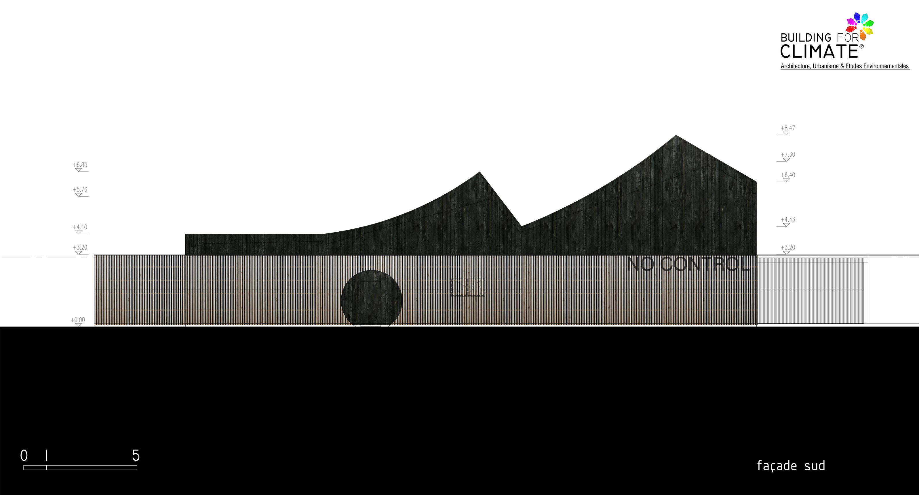 Installé à Volvic, le long d'une route touristique, le chai vinicole NO CONTROL dessine une silhouette faisant écho à un paysage unique, classé au patrimoine mondial, la Chaîne des Puys. Le Genius locci est hautement tectonique : dâmes, failles, sol basaltique noir recouvert de forêts. D'un socle terrestre horizontal en mélèze, émerge un volume céleste en bois sombre, évoquant par sa ligne dynamique et brisée, un volcan endormi. Le processus de vinification en biodynamie organise l'intérieur selon une progression Est/Ouest : aire de livraison, cuverie, cave, espace de dégustation ouvert sur un puy. Les Zones d'activités des entrées de nos villes peuvent être synonymes d'Architecture et d'Ecologie.