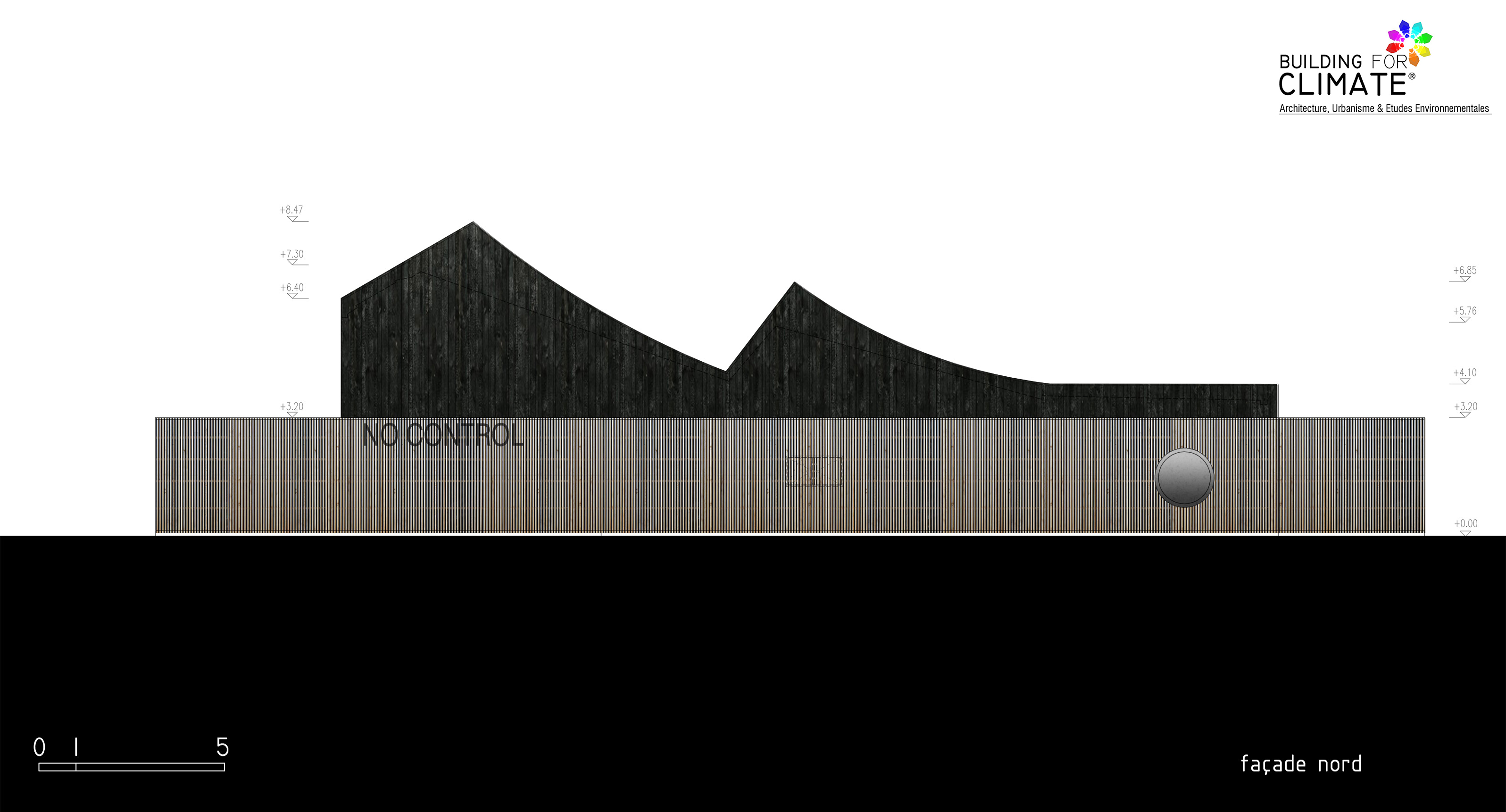 Approche environnementale : Par ses principes bioclimatiques, ses matériaux décarbonés, le chai reflète les valeurs de la production en biodynamie du Domaine NO CONTROL : zéro intrant, respect de la biodiversité et des cycles naturels. L’enveloppe, structure et murs, est entièrement en bois. Non traité il limite les pollutions intérieures. Deux sheds de toiture apportent lumière et ventilation naturelles, contrôlées par des ouvertures automatisées. L’isolation renforcée crée un volume thermique efficace pour une grande sobriété énergétique. La cave est positionnée au cœur du chai. Ses murs intérieurs en briques monomurs génèrent une forte inertie et une hygrométrie constante, supprimant le besoin de système de refroidissement.