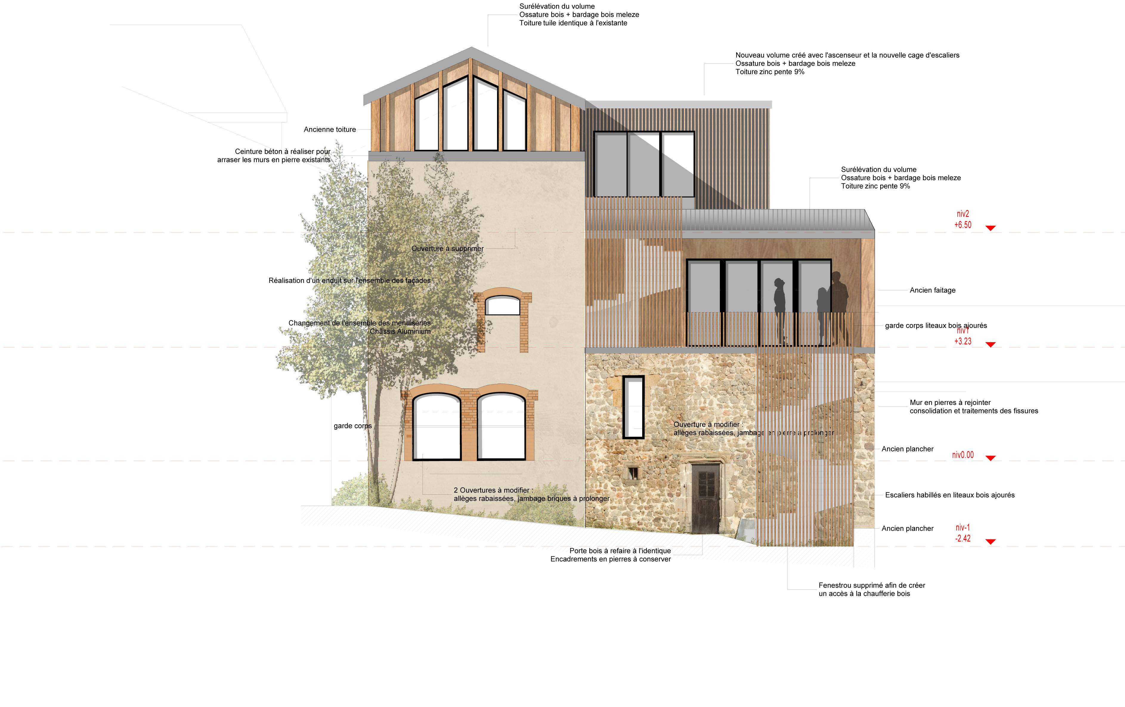 Créer un pôle de 7 services différents dans 3 bâtiments hétérogènes sur 4 niveaux et plus de 600m² en plein centre bourg, est un vrai pari aussi bien politique qu’architectural. Il s’agit de donner une cohérence à cet ensemble et d’en faire un vrai élément de dynamisation du bourg à travers un panel d’usages contemporains (maison de services, maison de santé, espace de coworking, centre télétravail, espace public numérique...). A l’intérieur le bois se décline sous de nombreuses forme en écho au contexte forestier et donc à une activité économique majeure de ce territoire.