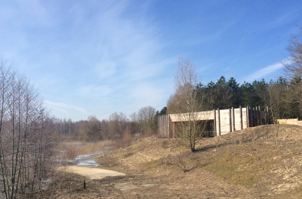 Traversant le sous-bois, le promeneur découvre un tableau cadré par un porche entre deux corps du pavillon d’accueil : le paysage du Domaine du Grand Voyeux s’offre à son regard. Le pavillon est un dispositif qui cherche à révéler le site grâce à une mise en scène qui organise les cheminements, sélectionne les vues, crée l’attente, le suspens pour enfin livrer toute la beauté d’un paysage inattendu en Ile-de-France. Après être entré sous le préau, le visiteur pénètre dans le pavillon où, franchissant un premier sas, il peut accéder à l’espace d’accueil. Grâce à une immense baie vitrée, Il découvre alors la seconde partie du domaine vers l’Ouest sur de grands étangs.