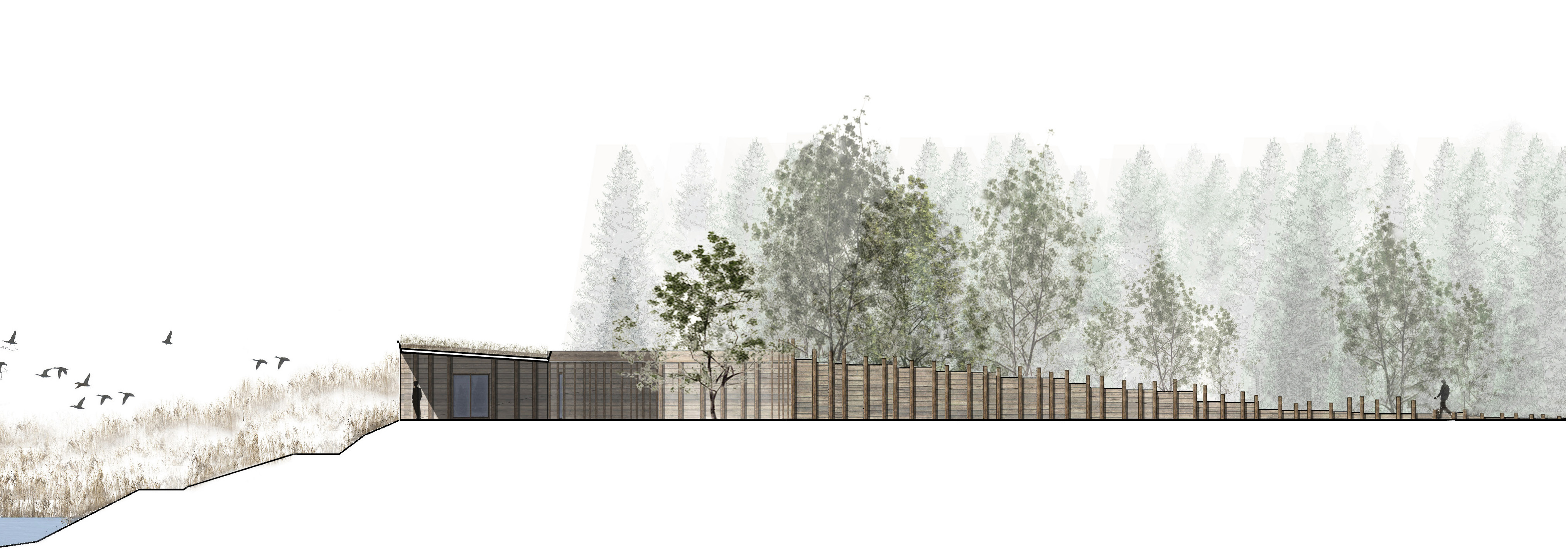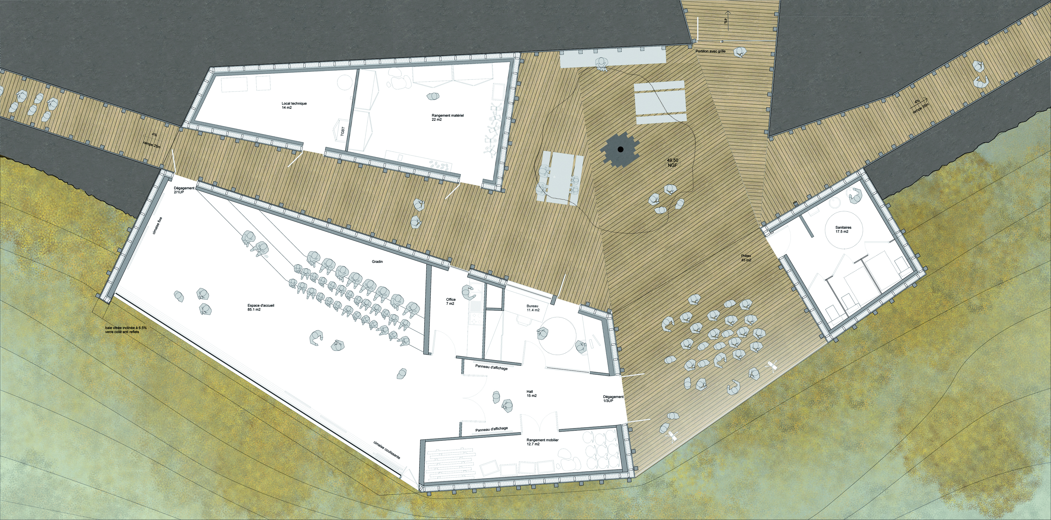 Traversant le sous-bois, le promeneur découvre un tableau cadré par un porche entre deux corps du pavillon d’accueil : le paysage du Domaine du Grand Voyeux s’offre à son regard. Le pavillon est un dispositif qui cherche à révéler le site grâce à une mise en scène qui organise les cheminements, sélectionne les vues, crée l’attente, le suspens pour enfin livrer toute la beauté d’un paysage inattendu en Ile-de-France. Après être entré sous le préau, le visiteur pénètre dans le pavillon où, franchissant un premier sas, il peut accéder à l’espace d’accueil. Grâce à une immense baie vitrée, Il découvre alors la seconde partie du domaine vers l’Ouest sur de grands étangs.