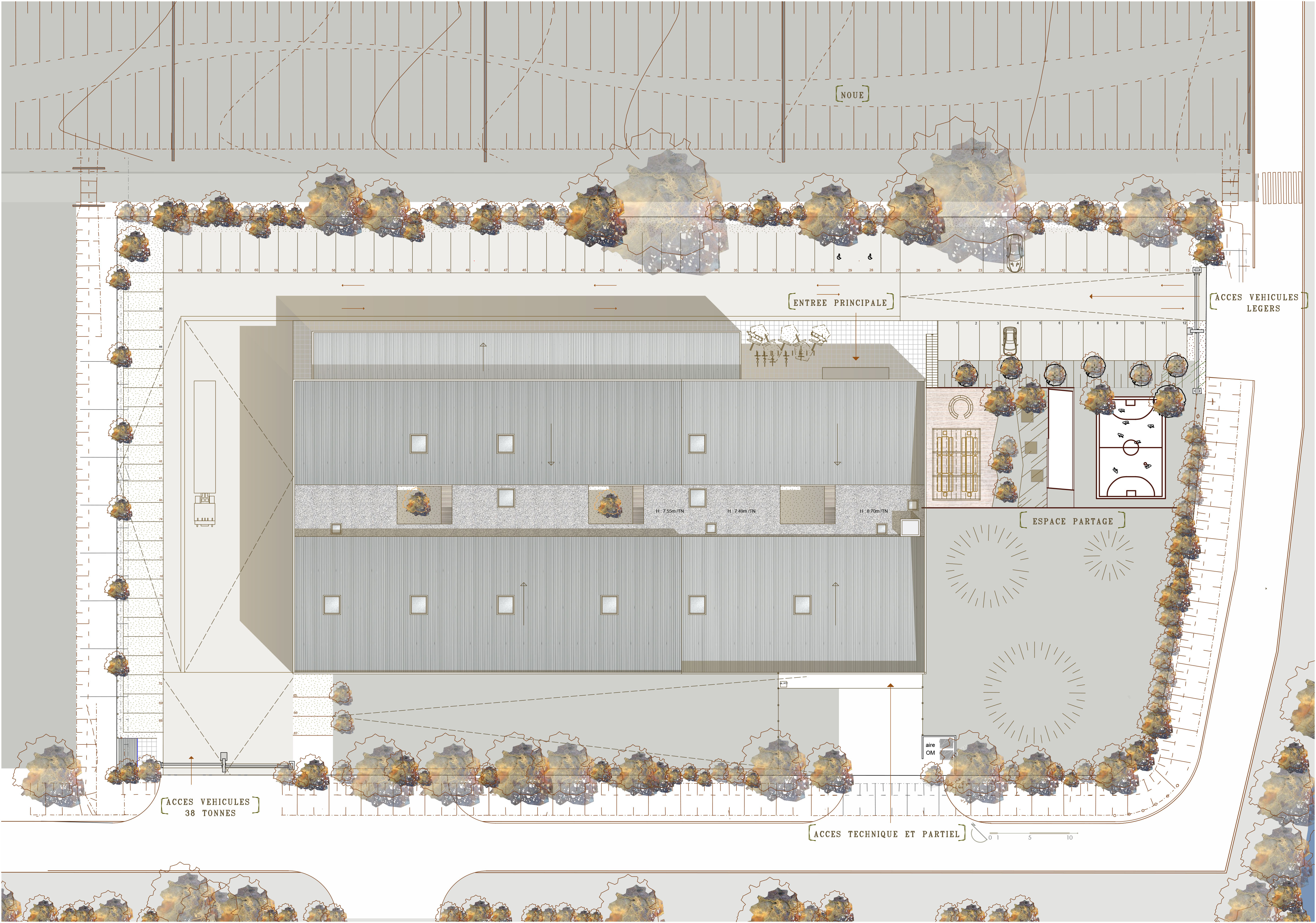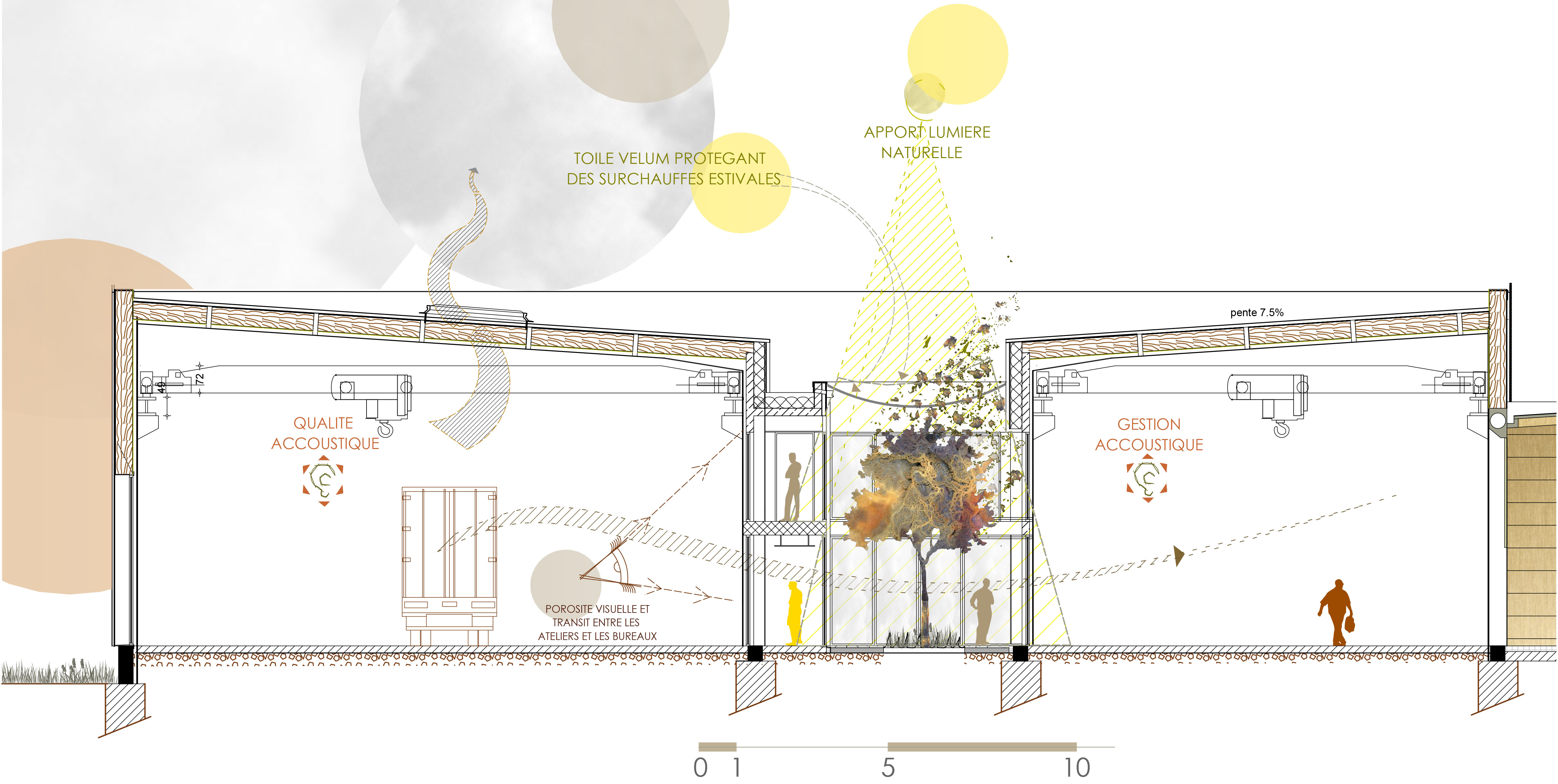 Descriptif technique : Les panneaux photovoltaïques, les dalles actives (géothermie), et la gestion des déchets (process de l’usine/cycle de vie du bâtiment) complètent l’approche durable de ce bâtiment. Fixée sur la charpente métallique porteuse, l’enveloppe du bâtiment est constituée par des caissons bois remplis de 3000 bottes de paille. Le projet s’inscrit dans son site et son contexte avec un terrain en pente qui est valorisé sur 2 niveaux, équilibre des remblais / déblais. Les besoins en énergie sont réduits avec des apports de lumière (patios) et par la surventilation nocturne via les lanterneaux en toiture.