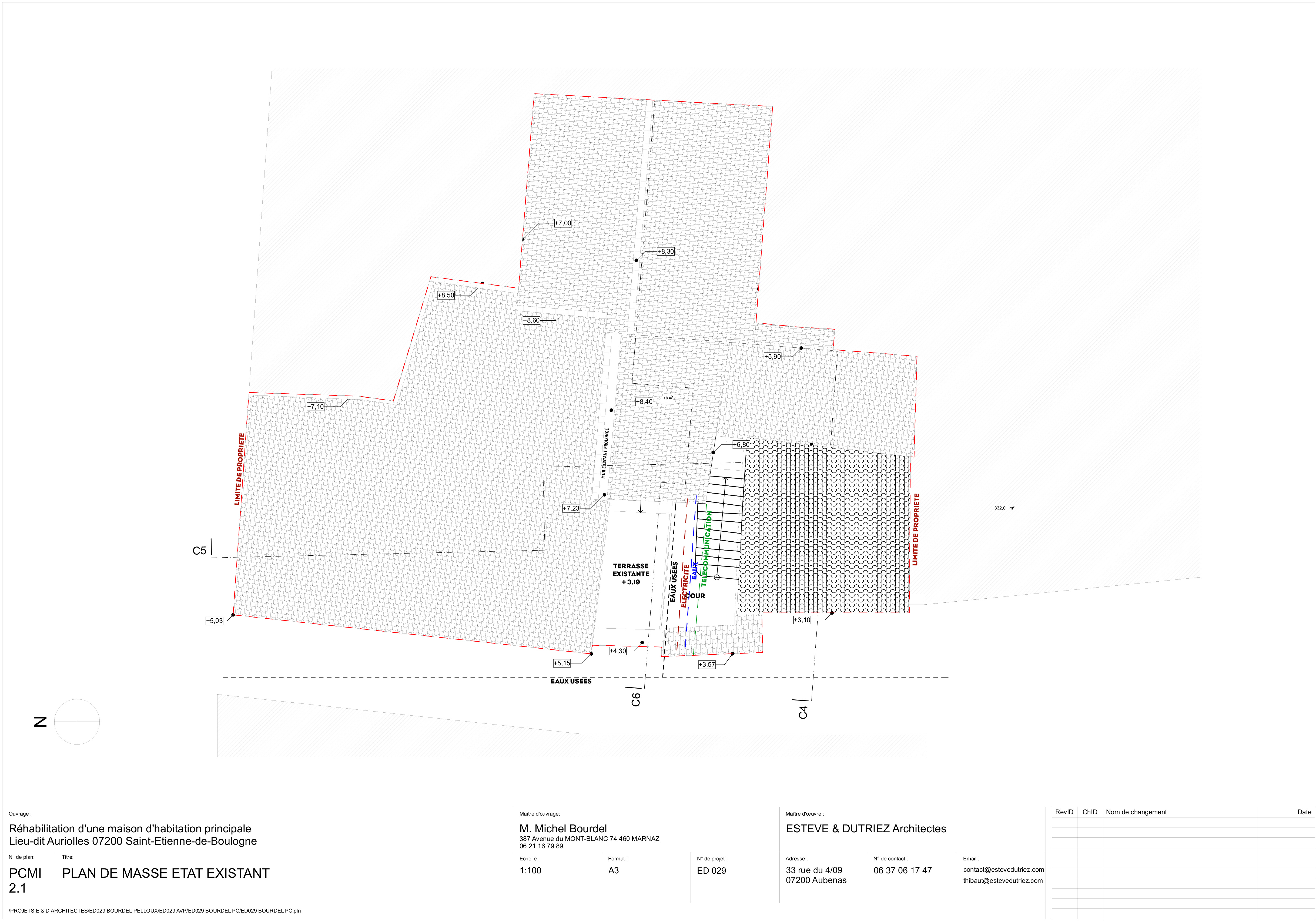 Réhabilitation d'une maison d'habitation principale Le volume des constructions existantes a été inchangé dans ses limites. La couverture de la terrasse extérieure existante au niveau R+1 située au centre de la parcelle a été abattue pour y implanter en lieu et place ainsi que dans les mêmes proportions un nouveau volume plein (l’extension). La toiture existante couvrant le volume au sud du terrain donnant sur la ruelle publique a été retirée pour en faire une terrasse accessible depuis la cour intérieure de la maison. Nous avons opté pour conserver les volumes existants dans leurs proportions, bien que certains soient habillés autrement qu’en pierre de pays, afin de respecter l'identité du hameau et l’échelle des constructions existantes et avoisinantes. Les ouvertures donnant accès au volume au sud du terrain sont ont été modifiées et agrandies afin de donner un accès à cette partie de la maison utilisé en atelier plus aisé et y apporter plus de lumière au rez-de-chaussée.