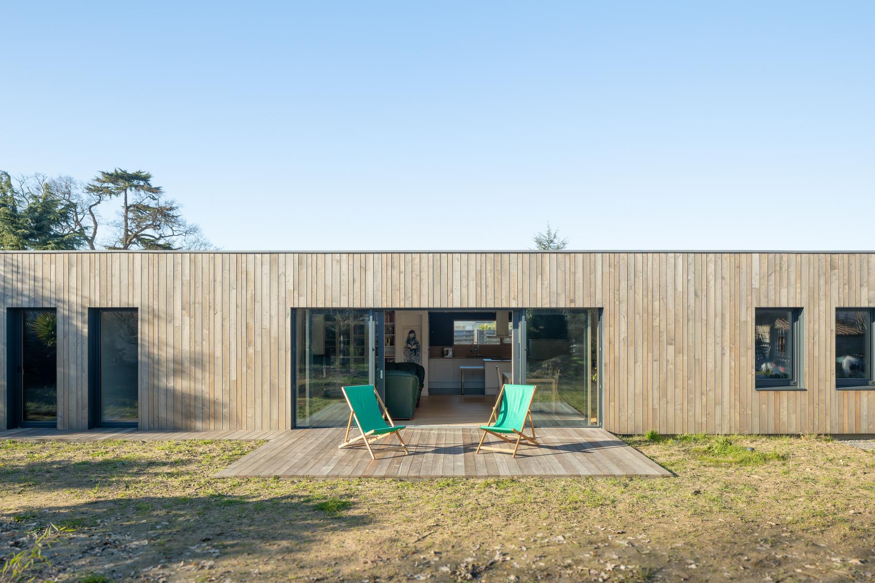 Descriptif technique : La maison a obtenu la certification "Maison Passive" en novembre 2017. L'étude PHPP annonce un besoin de chauffage de 11kWh/m2/an et une puissance de chauffage nécessaire de 11,1 W/m2, soit 1615W pour une surface de référence énergétique de 145m2. La structure en CLT est isolée par l'extérieur au moyen de caissons constitués de poutre en I et de panneaux en fibre de bois rigides insérant une isolation insufflée en laine de bois. Les façades sont habillées de châtaignier pré-grisé (sud-est et nord-est) et de zinc pré-patiné quartz (sud-ouest et nord-ouest) PEFC (Gestion forestière durable) FSC (Gestion forestière responsable) Marquage CE