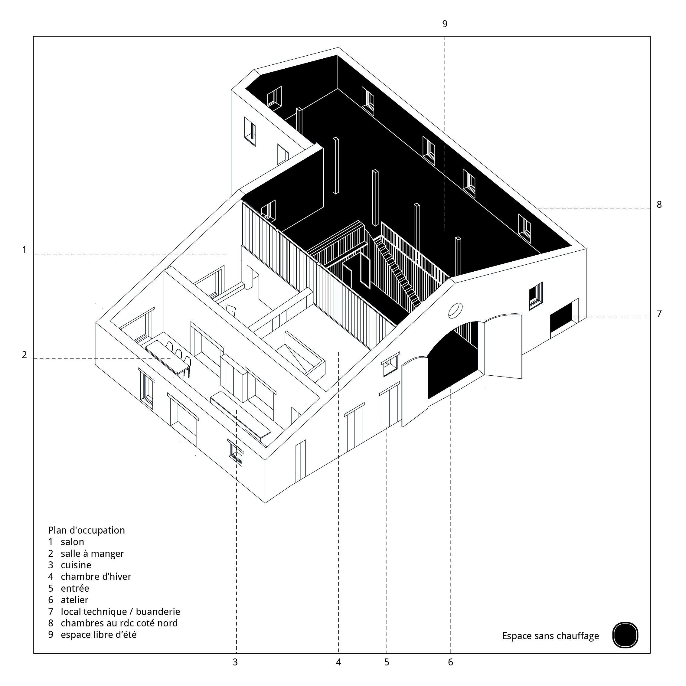 Approche environnementale : Le choix de matériaux écologiques révèlent l'âme de l'ancienne ferme qui renoue avec son paysage.La nouvelle charpente entre en continuité avec la charpente existante.Entièrement apparente, elle se compose de bois massifs et de croûtes de peuplier.La totalité des cloisons est réalisée en ossature bois avec un parement en voliges de peuplier. Afin de limiter les dépenses énergétiques, les ailes au sud sont occupées par l’habitation hivernale qui s’ouvre au printemps et à l’été sur la partie centrale (grange actuelle), espace semi-extérieur, lieu de travail, de stockage, conservé à l’état brut.