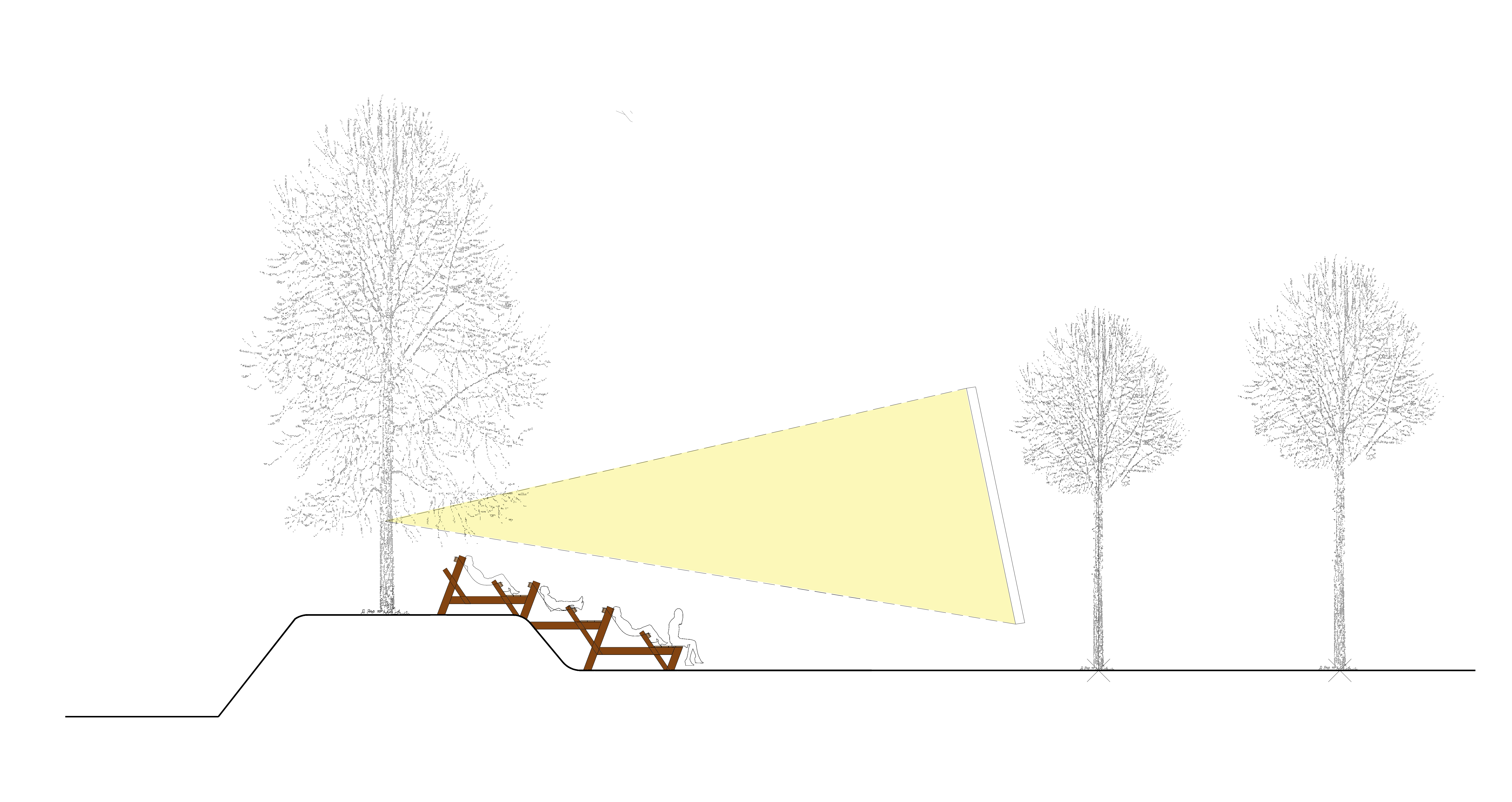 Les gradins sont conçus comme un espace qui permet de visionner des films le soir face à un écran démontable. Nous avons voulu qu'en plus ils puissent s'utiliser de jour pendant toute la durée du festival comme un espace de détente, de rencontre, de discutions mais aussi pour voir des spectacles. Nous avons choisi un lieu stratégique, avec les vues dégagées et face au canal, à l'ombre d'un grand arbre tout en profitant de la topographie existante pour optimiser le matériel.