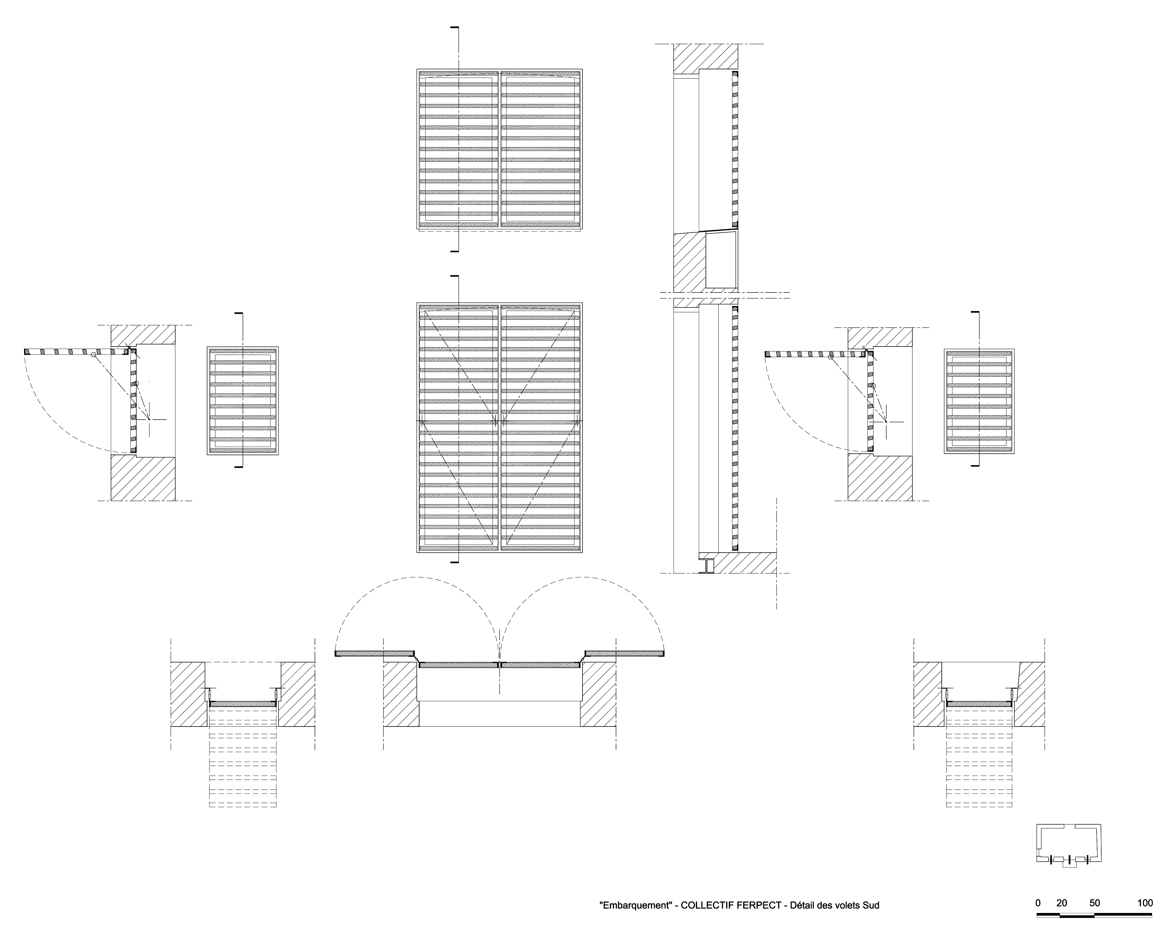 Le bâtiment la « tomate » a été fermé par sept volets persiennés avec remplissage bois sur cadre acier galvanisé. Un dispositif très simple de ventelles bois sur cadre acier, proposés, laissant le volume aéré.