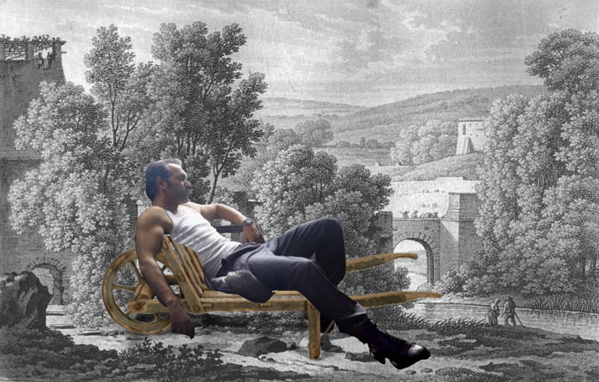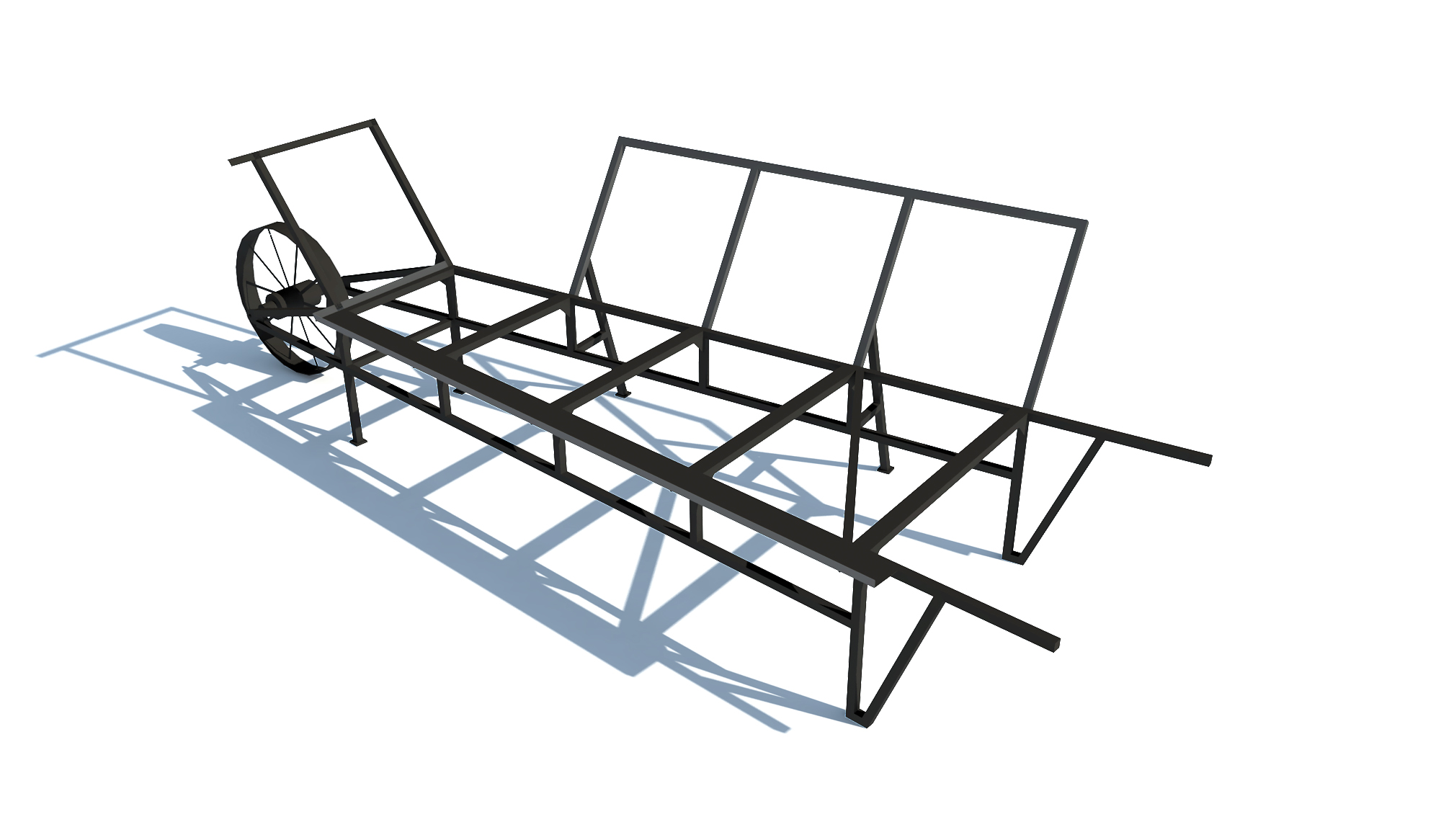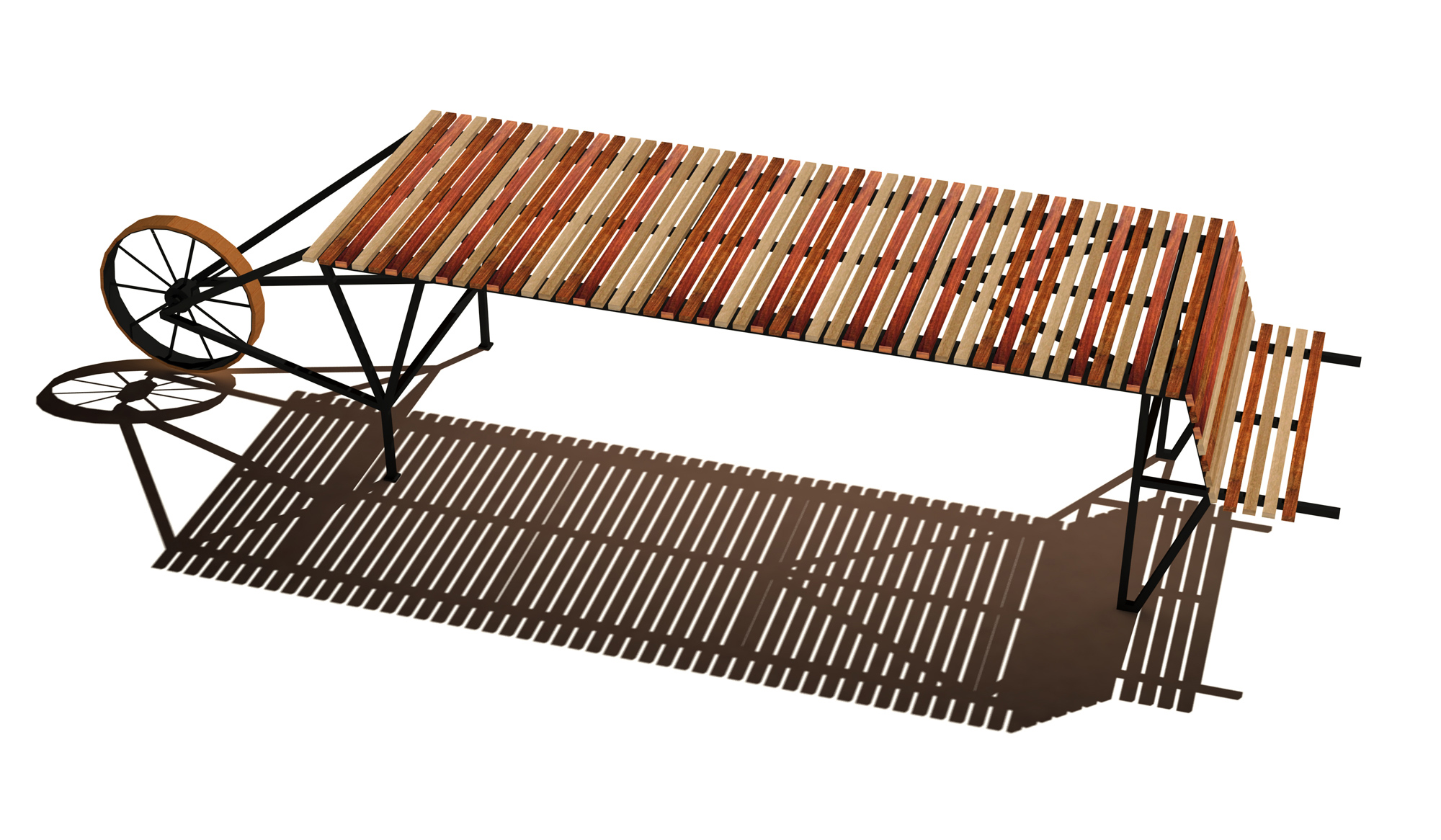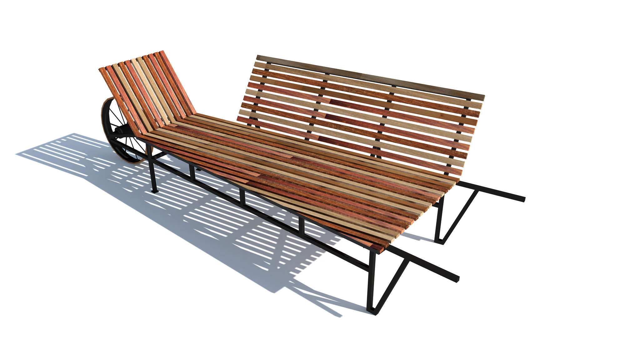 Le banc-brouette est une réinterprétation assez littérale de la brouette de lavandière, et fait référence aussi au mobilier de jardin et de tonnelles.